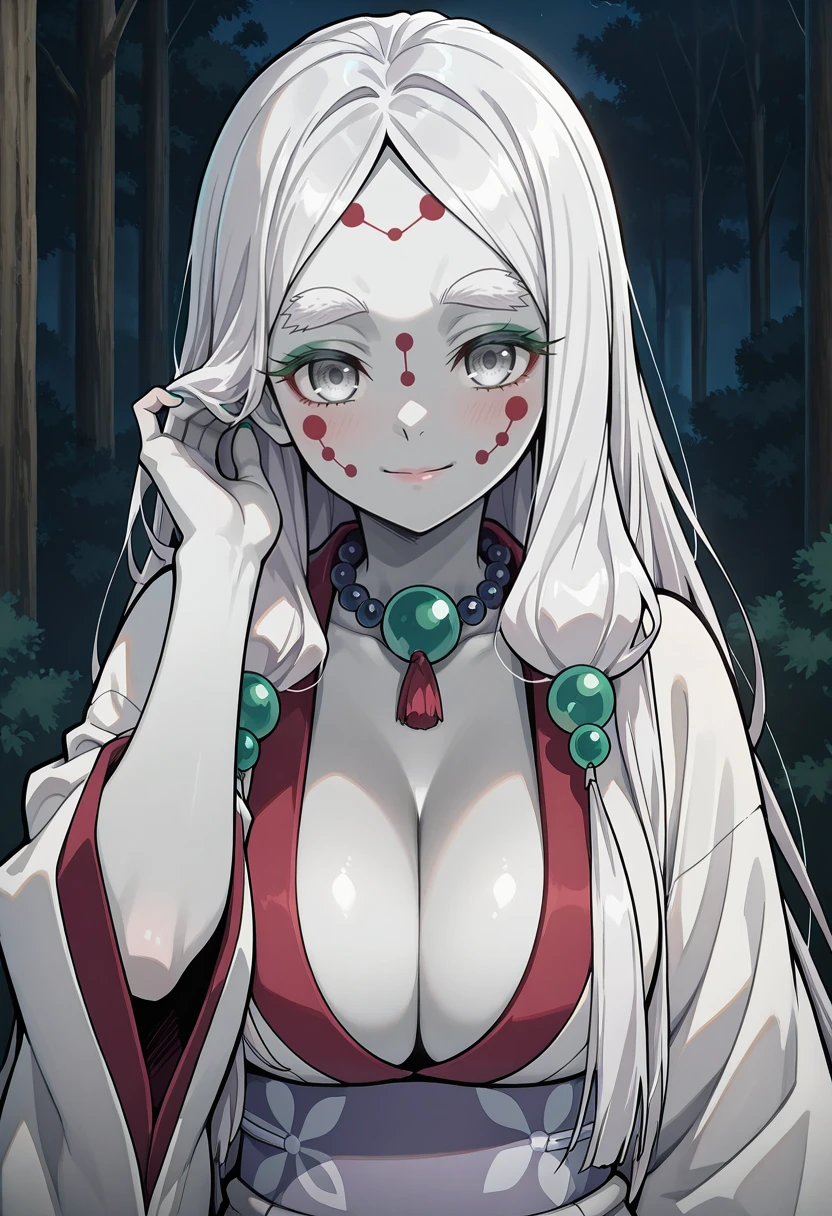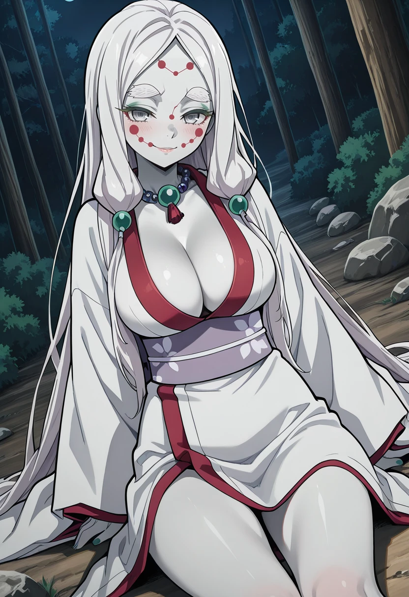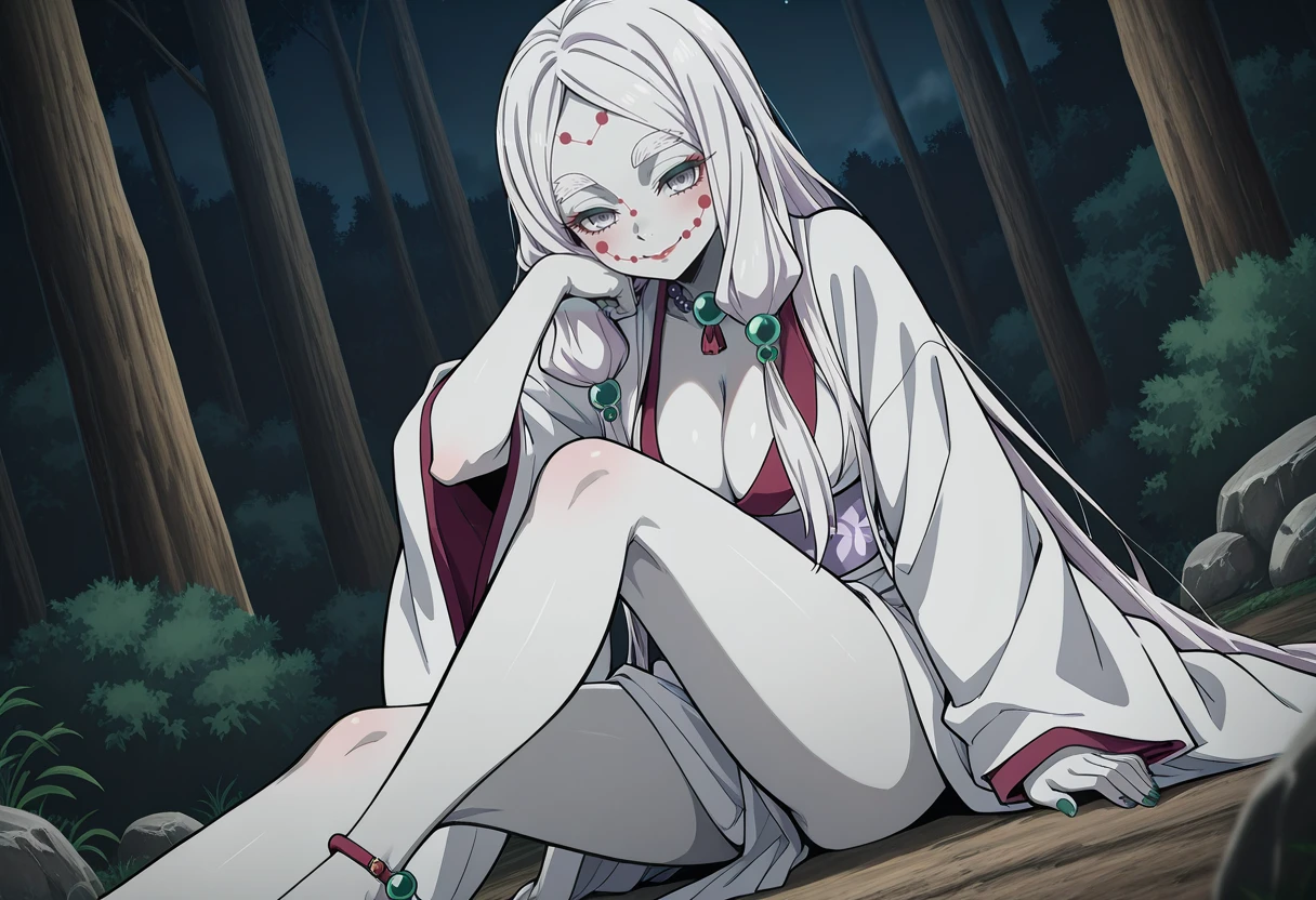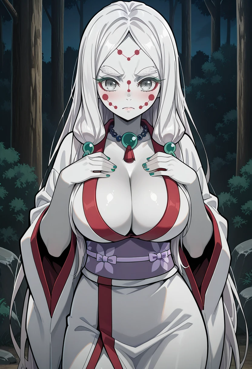 spiderdemon, 1girl, solo, very long hair, white hair, thick eyebrows, forehead mark, bluish gray eyes, facial mark, colored skin, white skin, hair ornament, hair beads, large breasts, curvy, large hips, jewelry, necklace, collarbone, cleavage, nail polish, green nails, japanese clothes, white kimono, pale purple sash, wide sleeves, long sleeves, red anklets, barefoot, green toenails, puppet strings, Spider Demon Mother (Human)