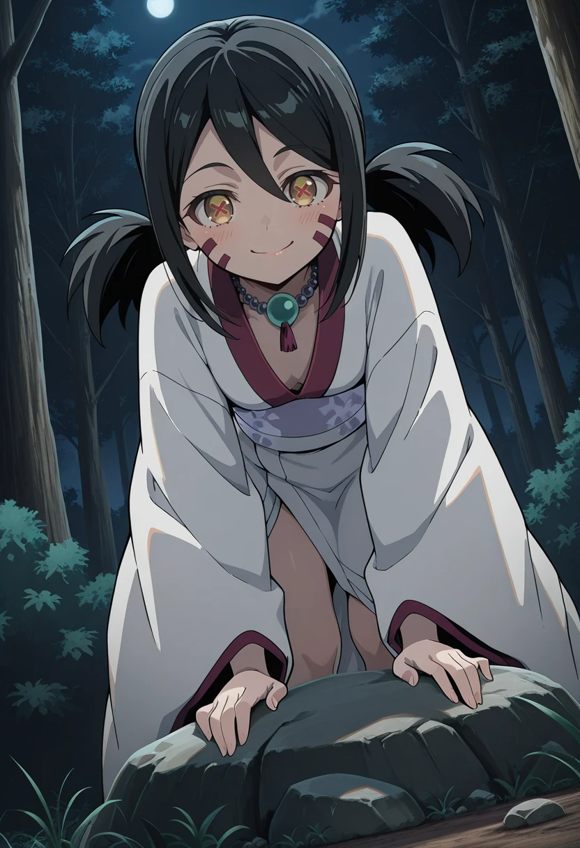 spiderhuman, 1girl, solo, black hair, long hair, twintails, facial mark, brown eyes, cross-shaped pupils, small breast, petite, medium hips, jewelry, necklace, japanese clothes, white kimono, pale purple sash, wide sleeves, long sleeves, red anklets, barefoot,Artistic Disclaimer: