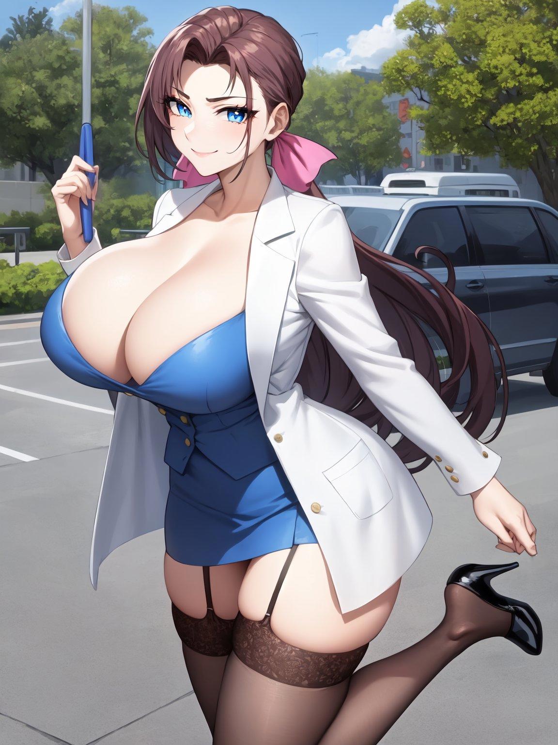 choker, open labcoat, blue suit, pencil skirt, thighhighs, high heels