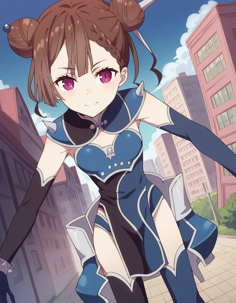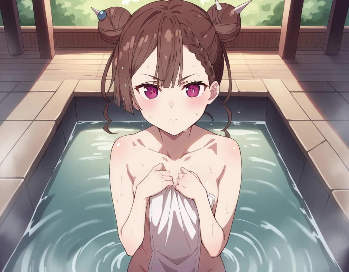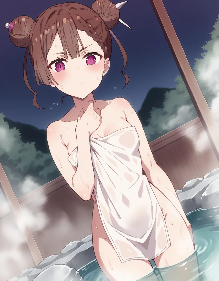 tsang, brown hair, braid, hair bun, double bun, purple eyes,