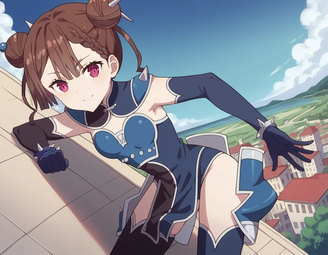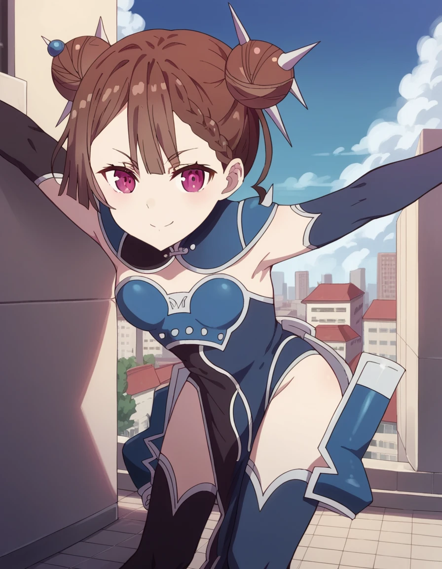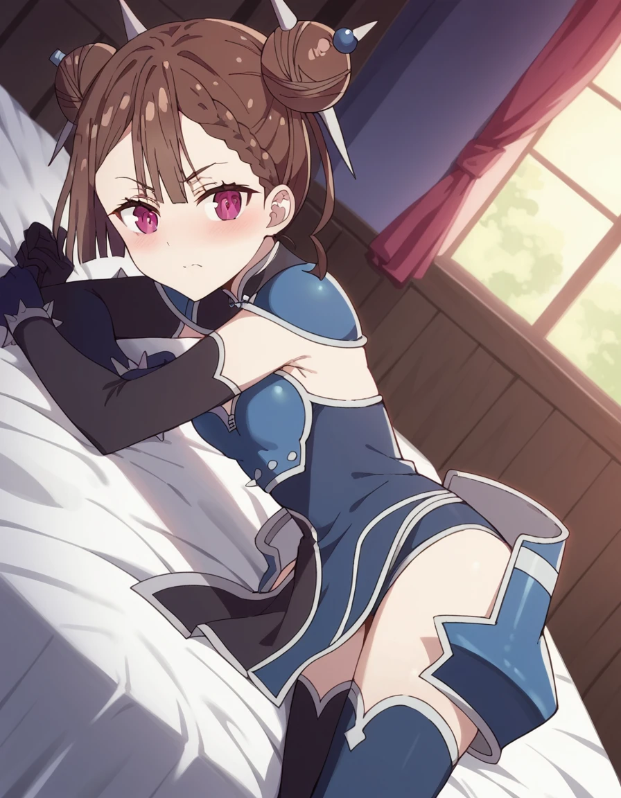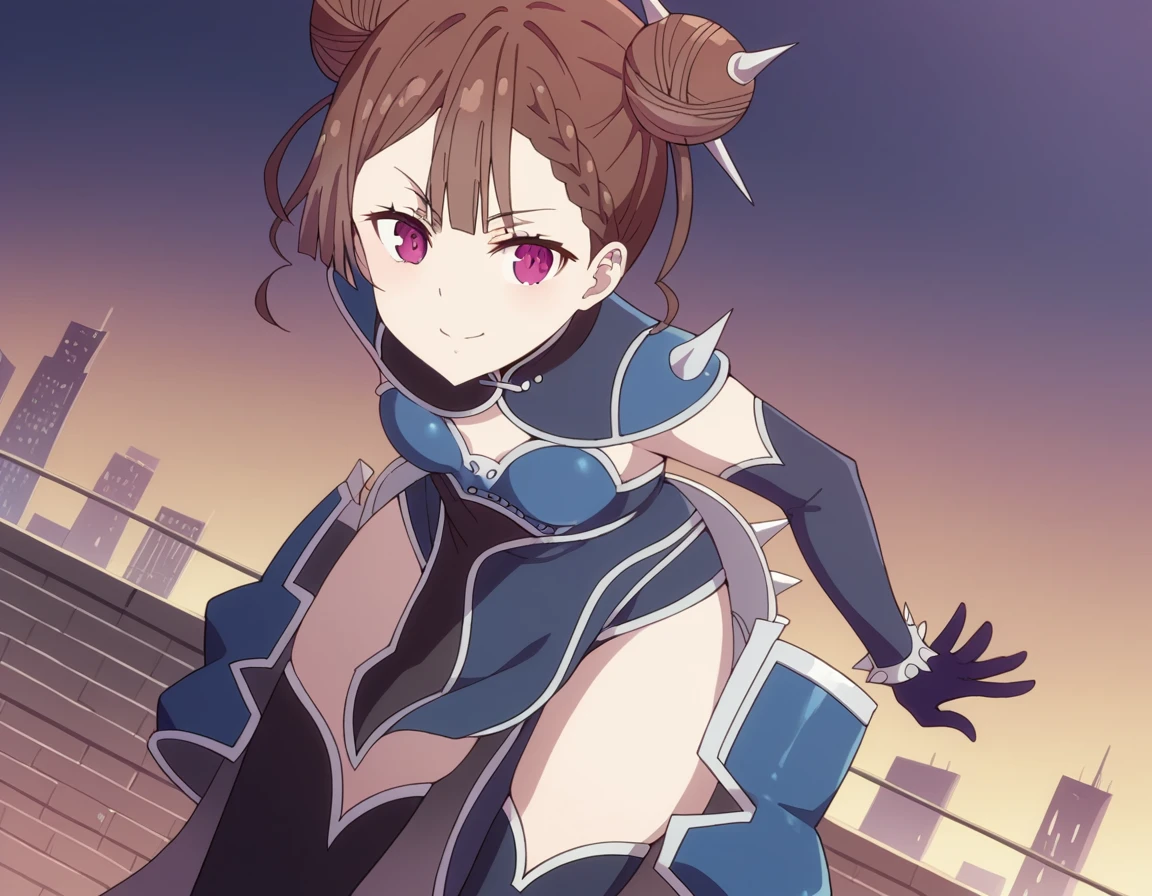 tsang, brown hair, braid, hair bun, double bun, purple eyes,