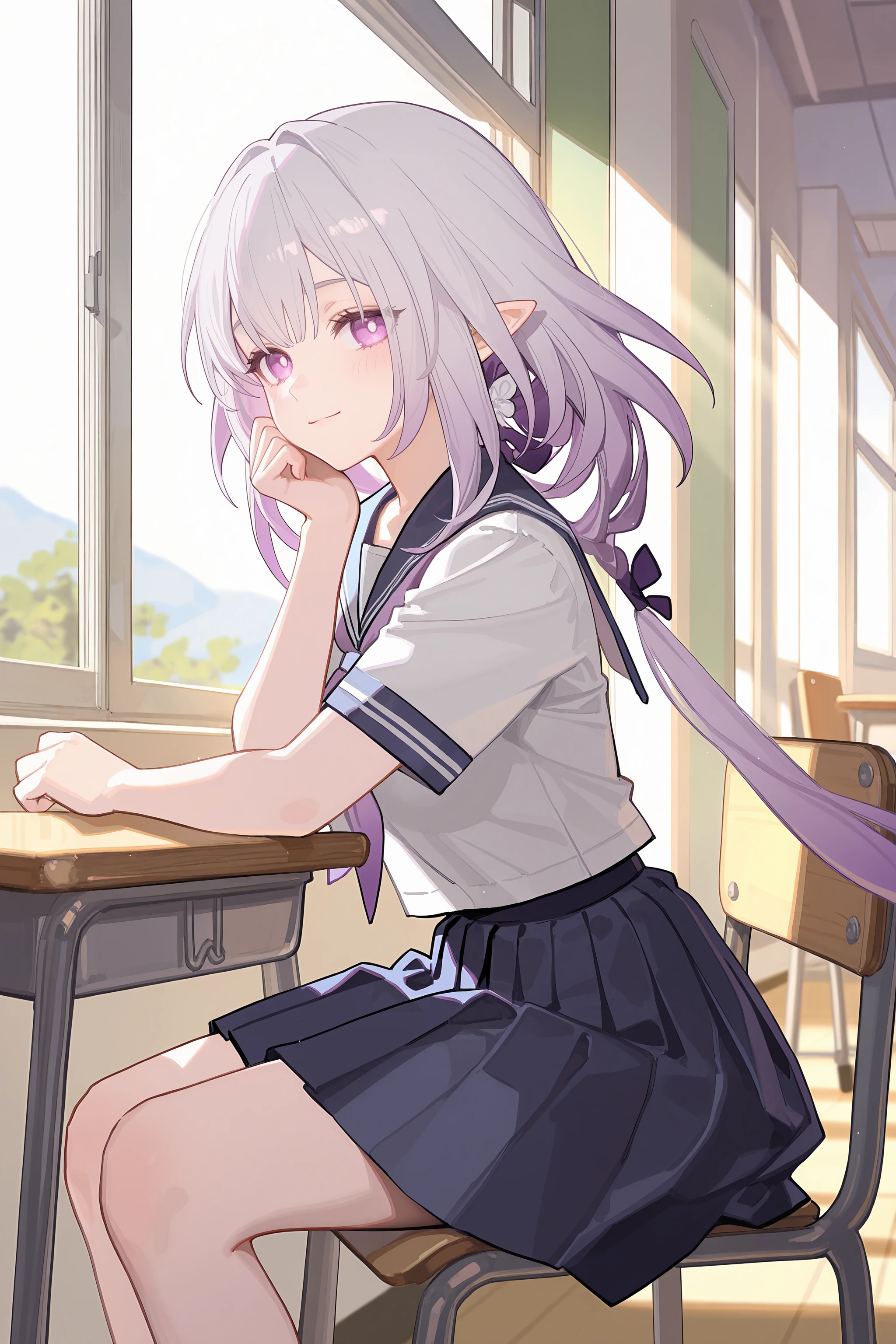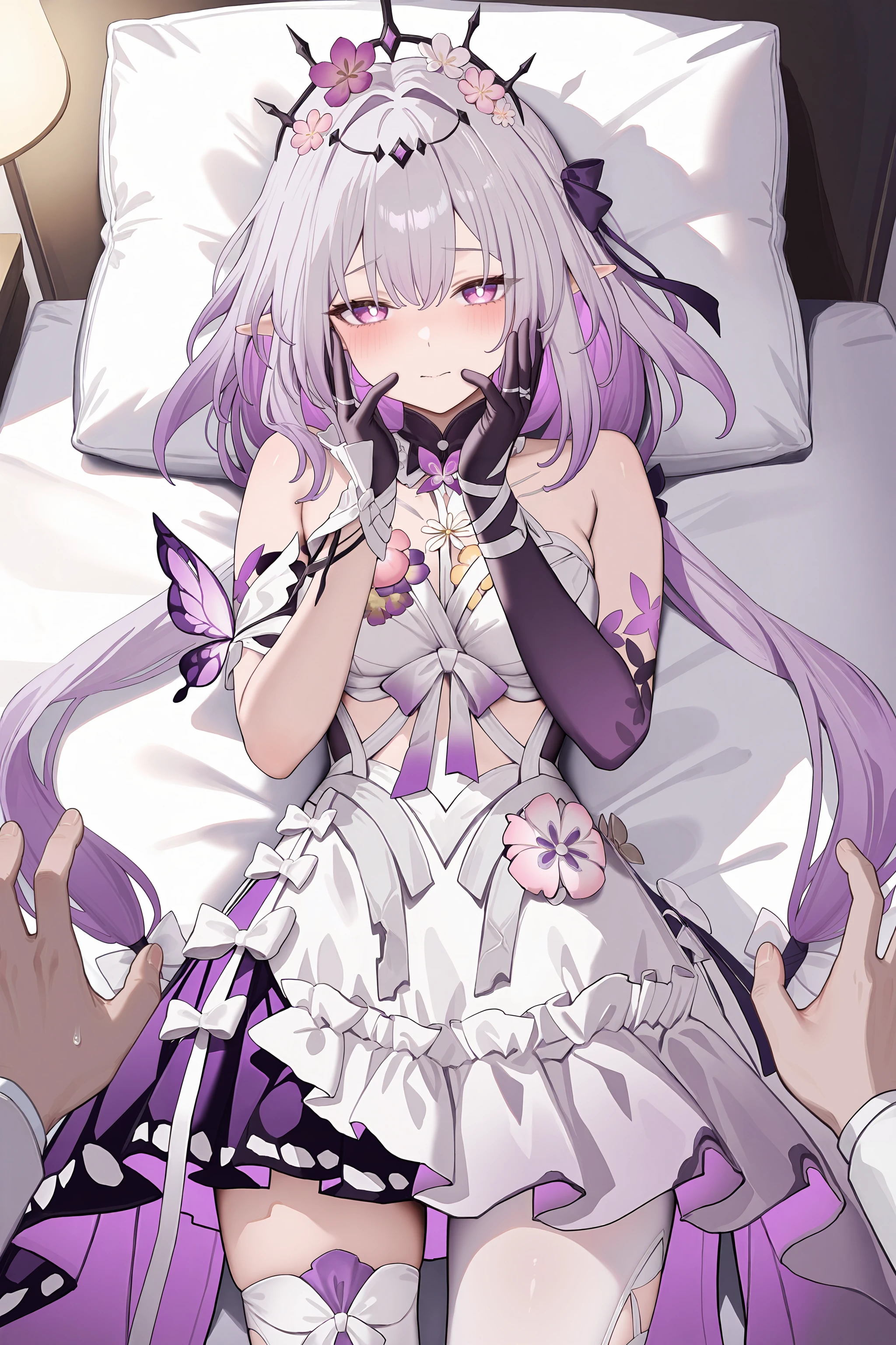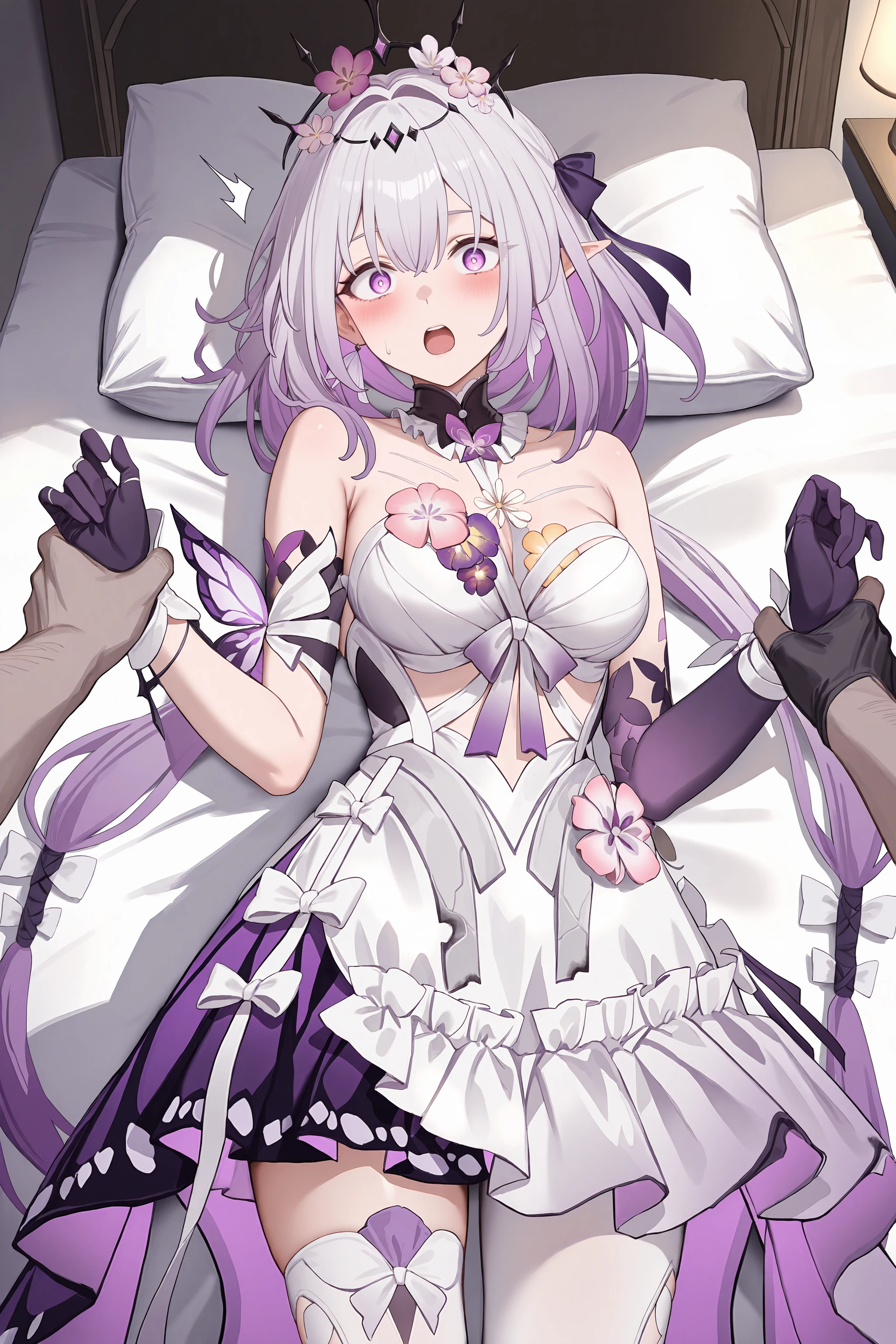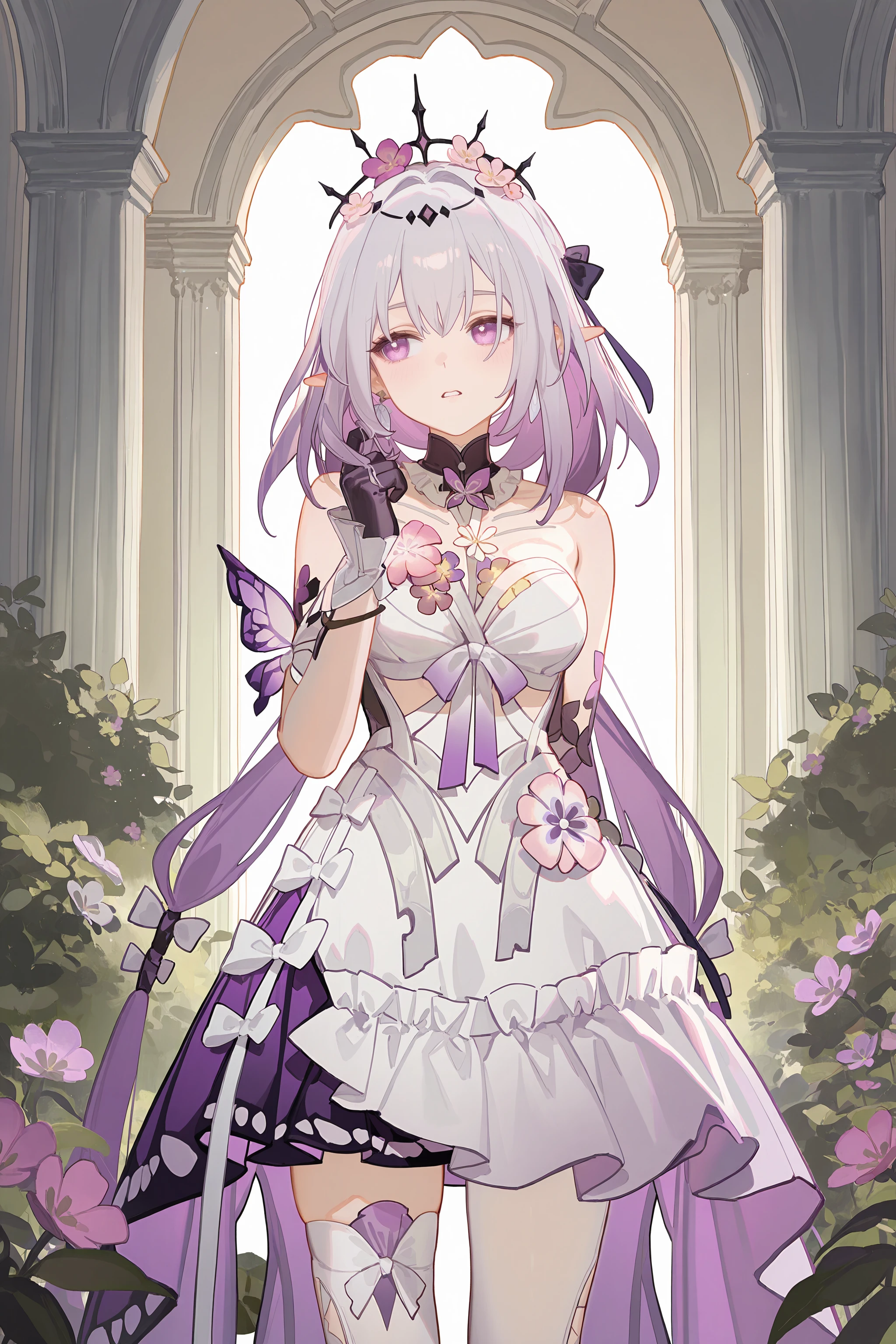 Additional prompts for default costume: hair ribbon, hair bow, hair flower, tiara, frilled sleeveless dress, single leg pantyhose, single white thighhigh, single elbow glove, single frilled glove, arm garter, high heel boots