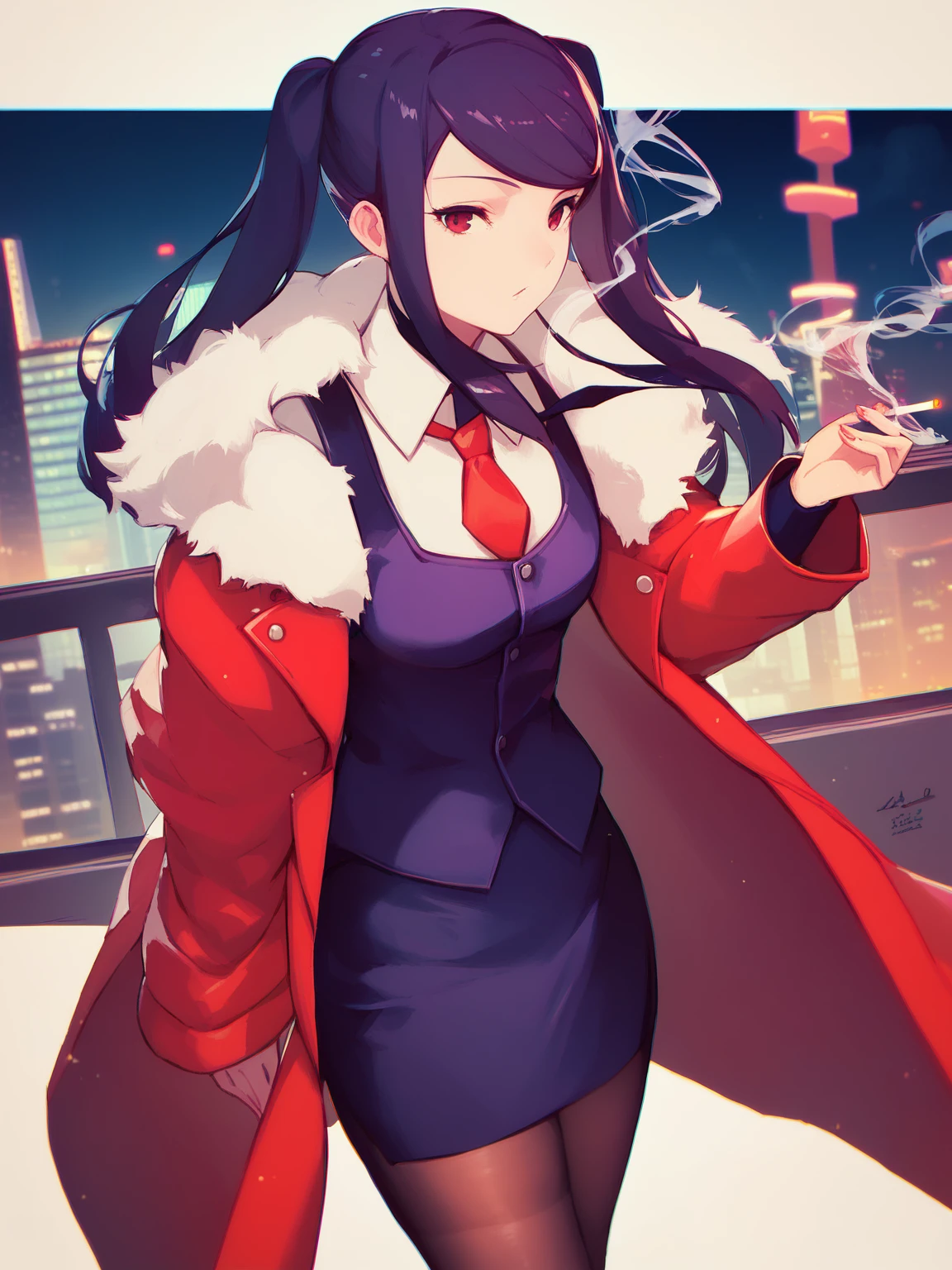jill stingray, necktie, pantyhose, skirt, vest, white shirt fur trim, open coat, red coat