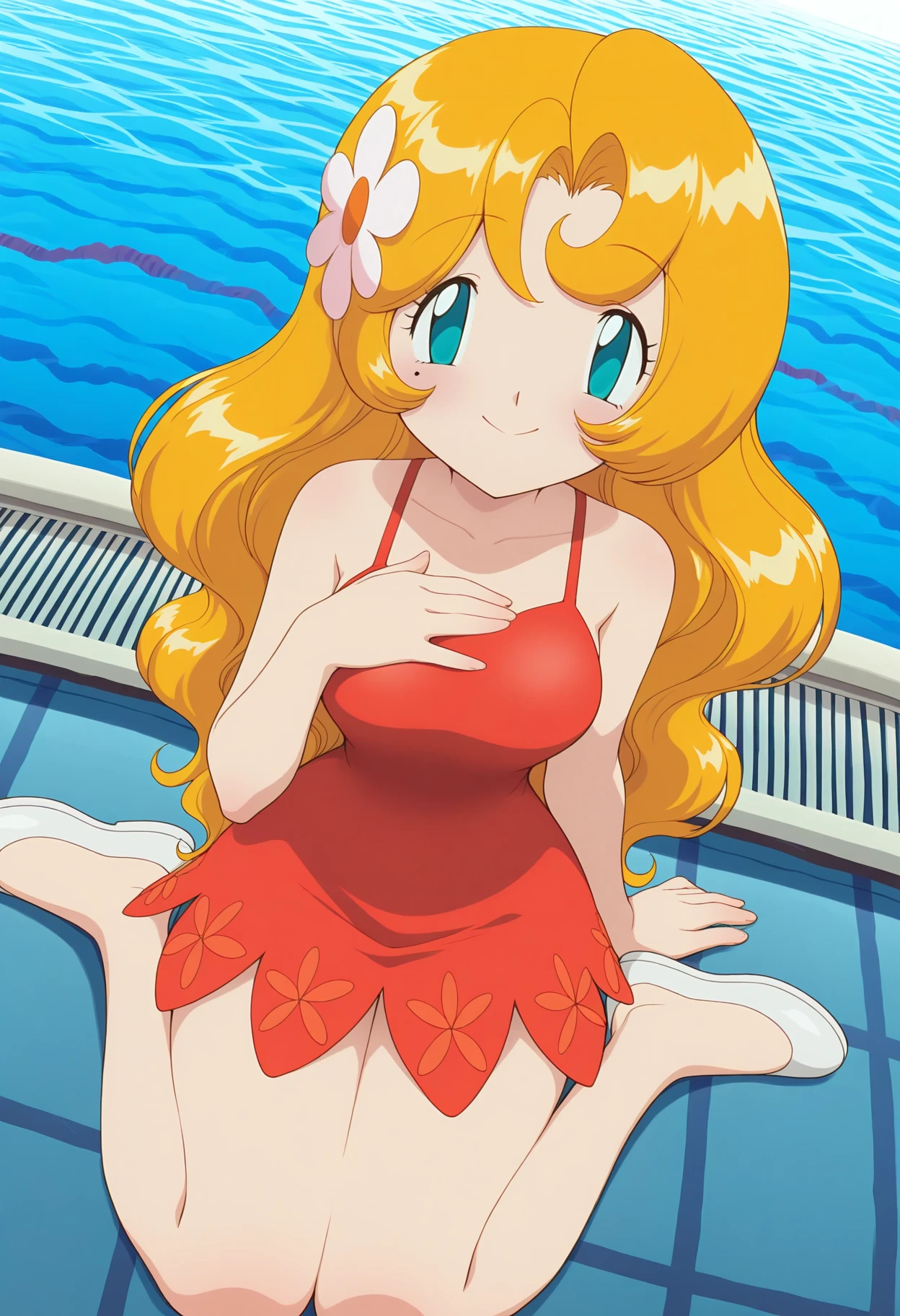 PMLy, 1girl, blonde hair, long hair, aqua eyes, mole under eye, hair flower, breasts,