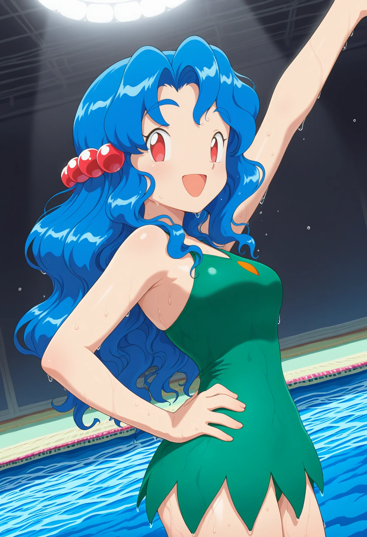 PMLy, 1girl, blue hair, long hair, wavy hair, red eyes, hair bobbles, breasts,