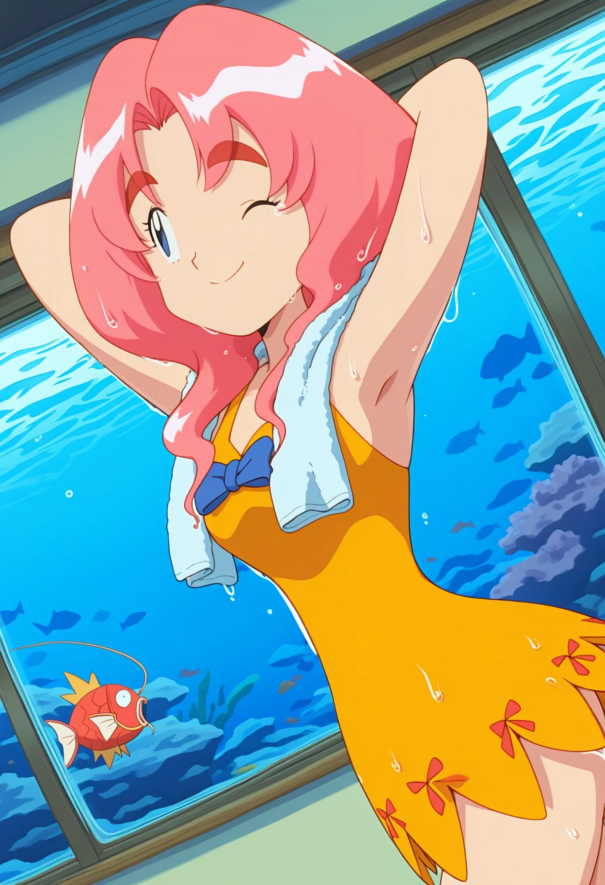 blue neck ribbon, yellow swimsuit, yellow dress, red ribbon print,