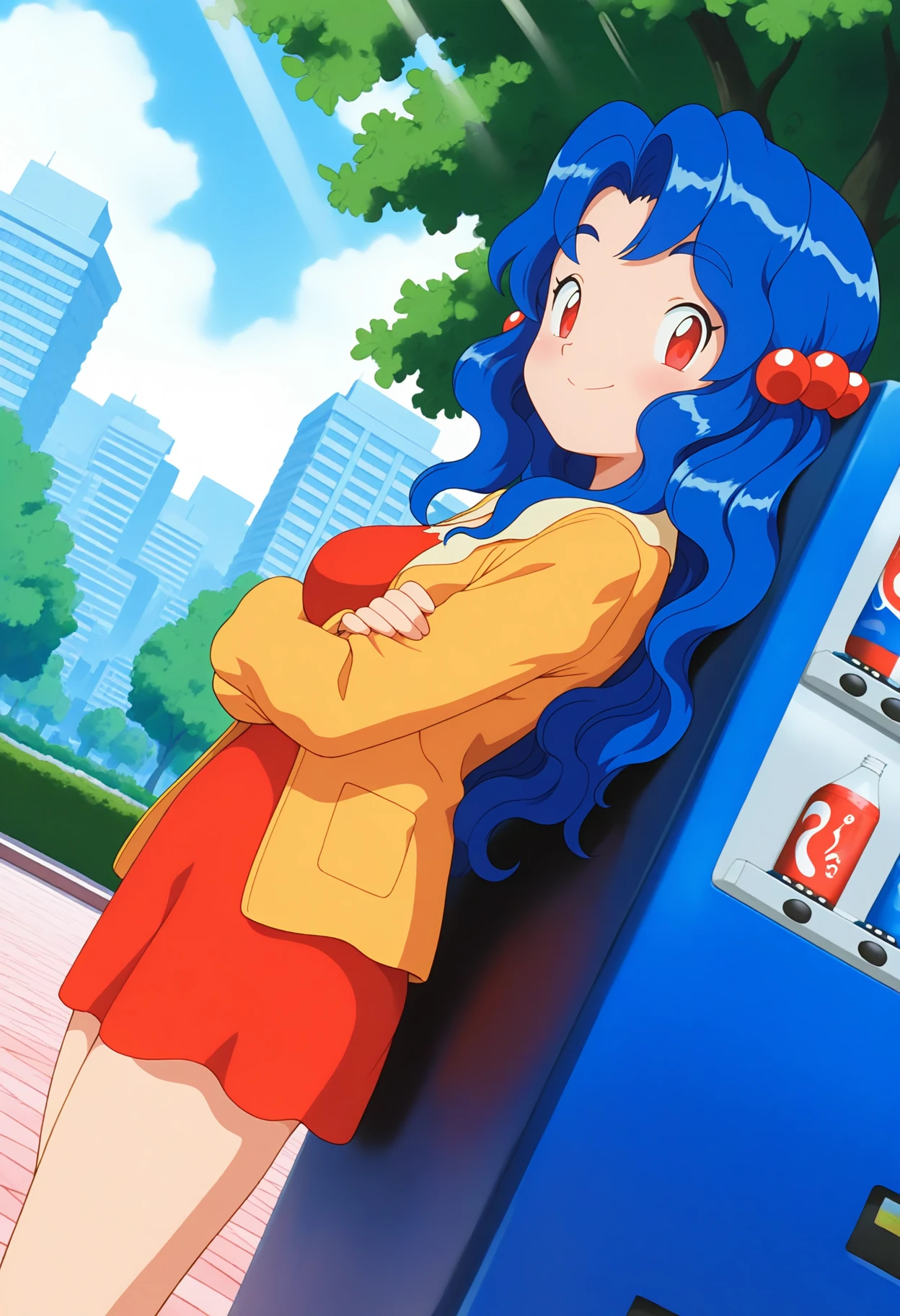 PMViolet, blue hair, long hair, wavy hair, hair bobbles, red eyes,