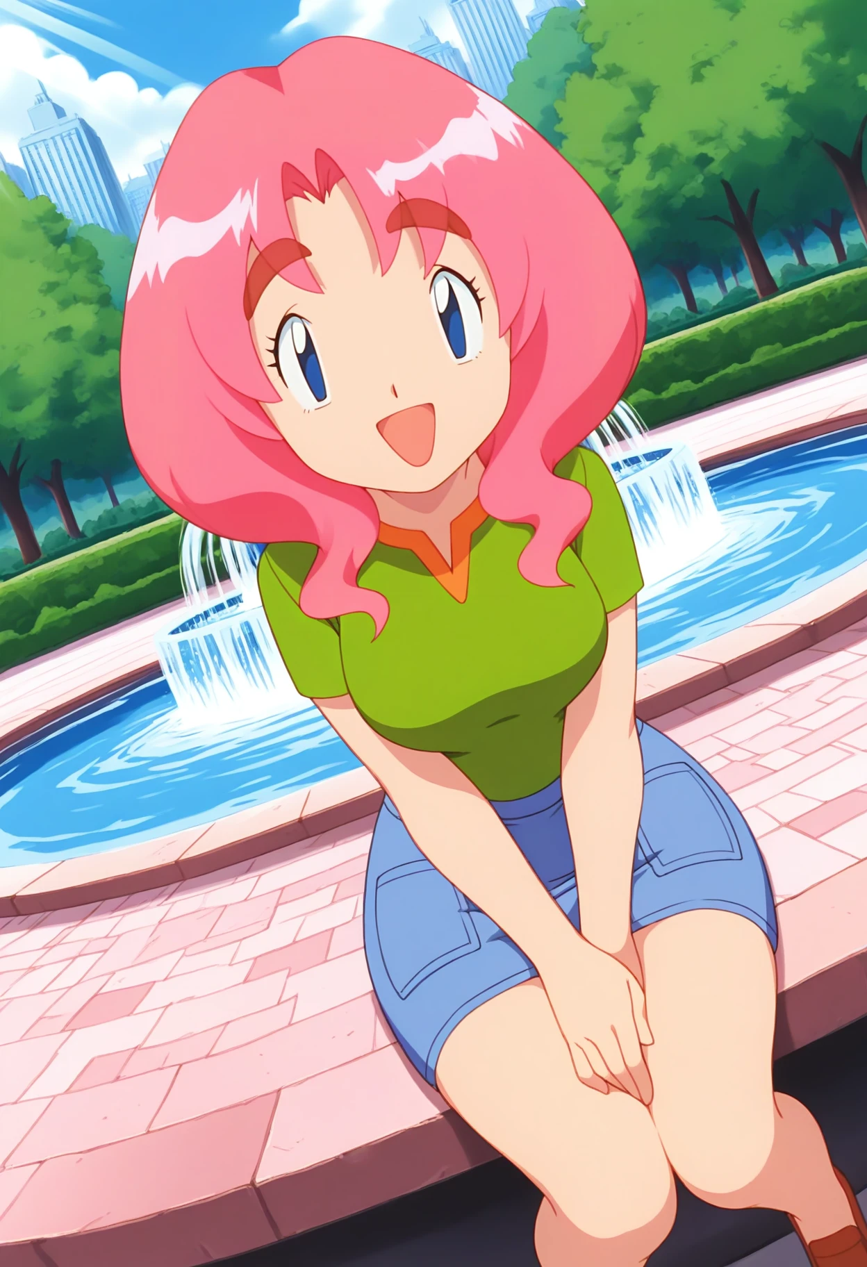 PMLy, 1girl, pink hair, short hair, thick eyebrows, blue eyes, breasts,