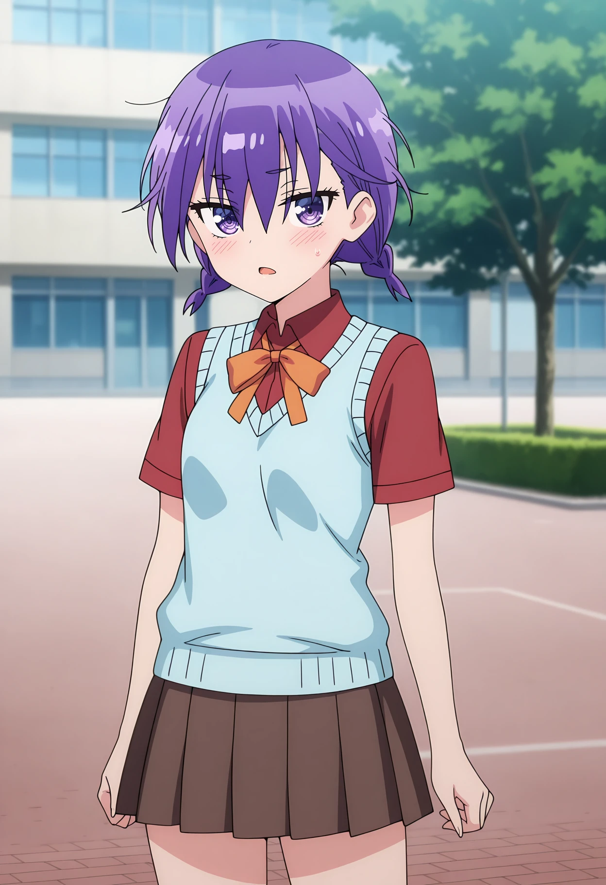 hair between eyes, twin braids, short hair, purple hair, purple eyes