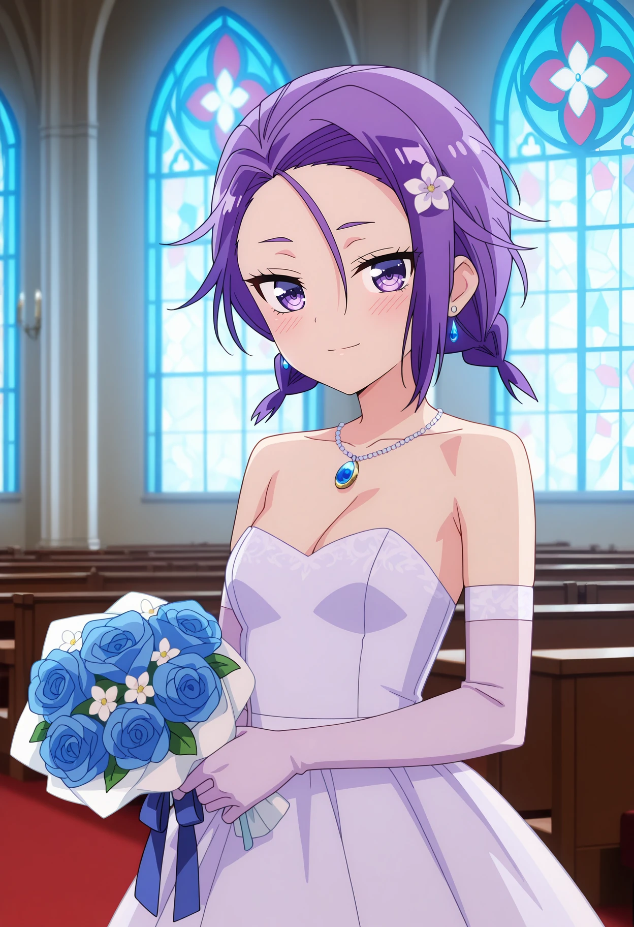 hair flower, earrings, wedding dress, pendant, blue gemstone, strapless dress, light purple dress, cleavage, small breasts, elbow gloves, purple gloves, holding bouquet