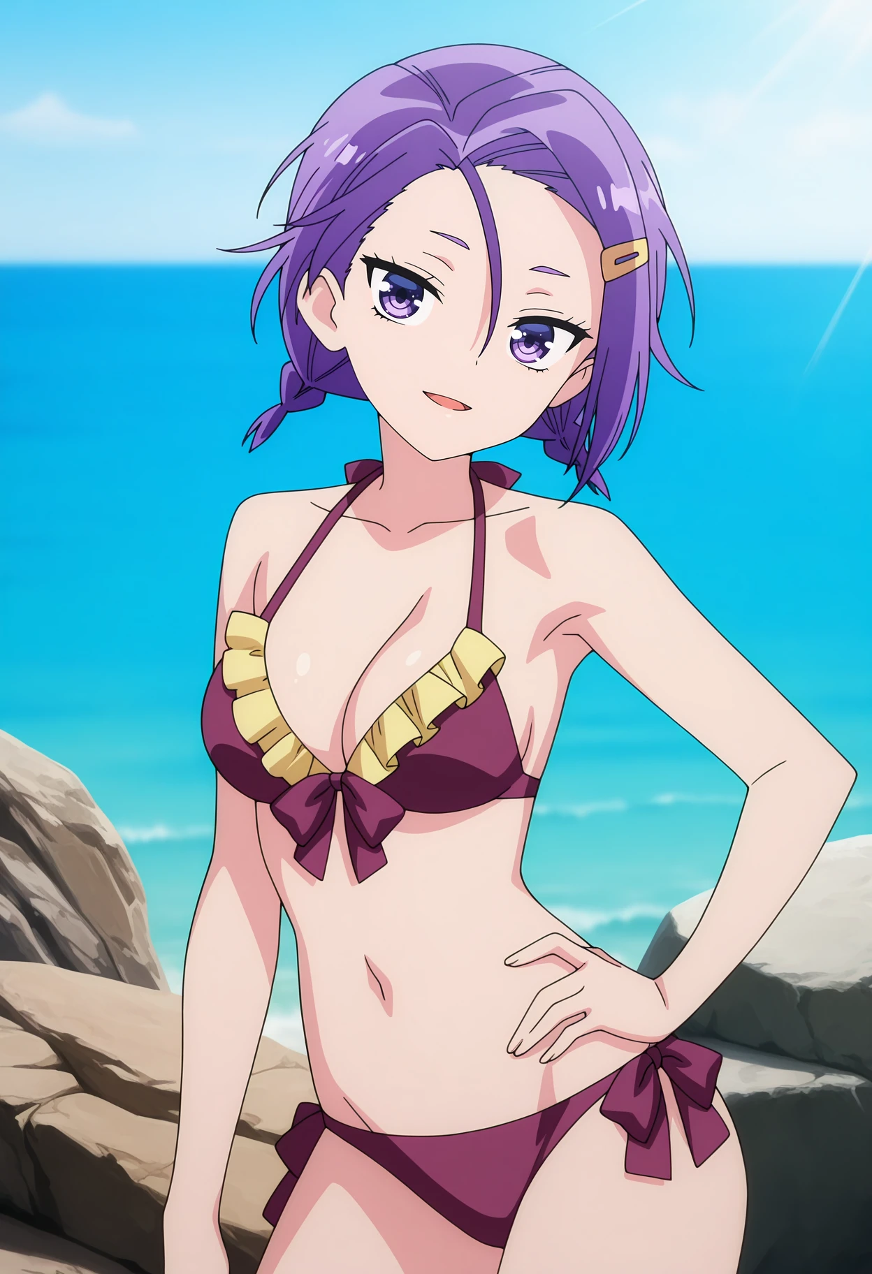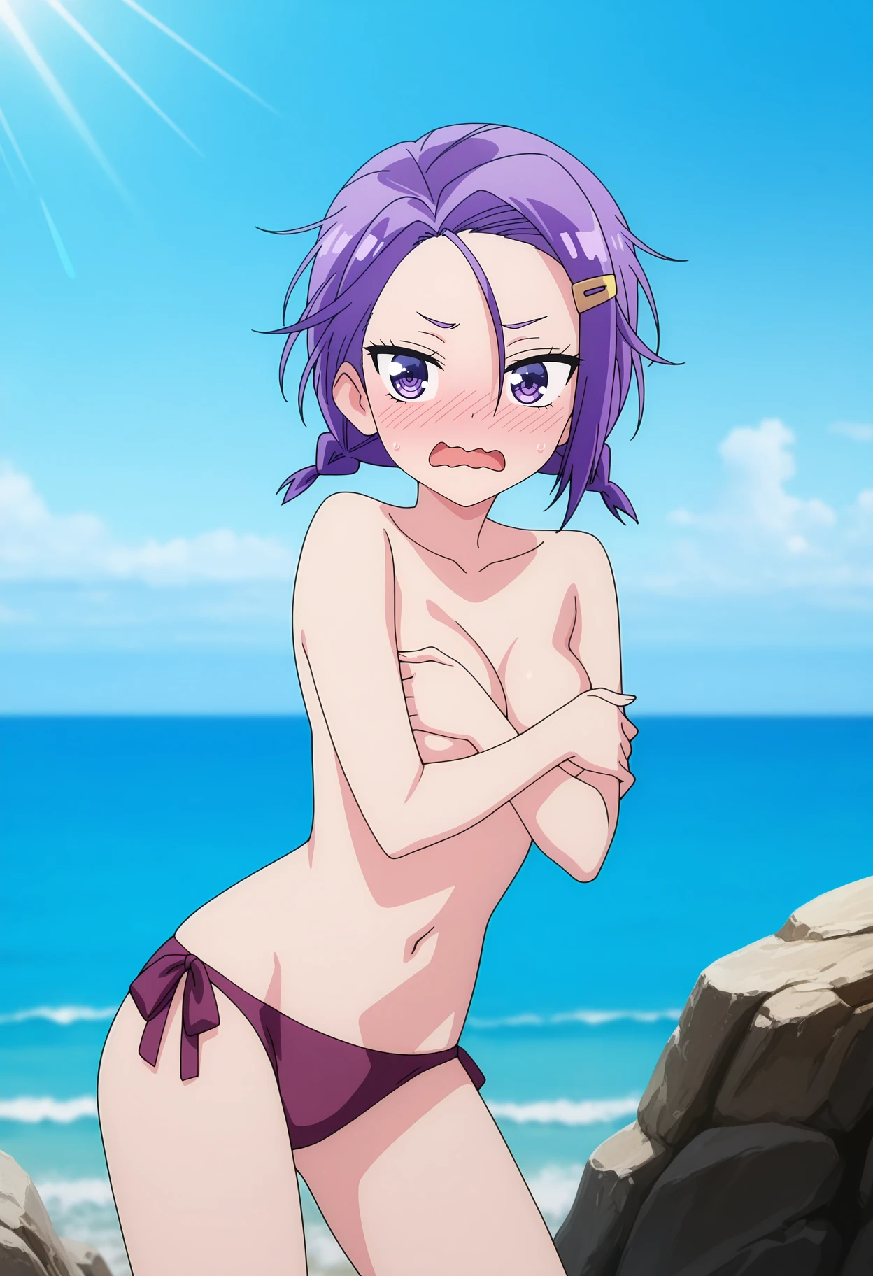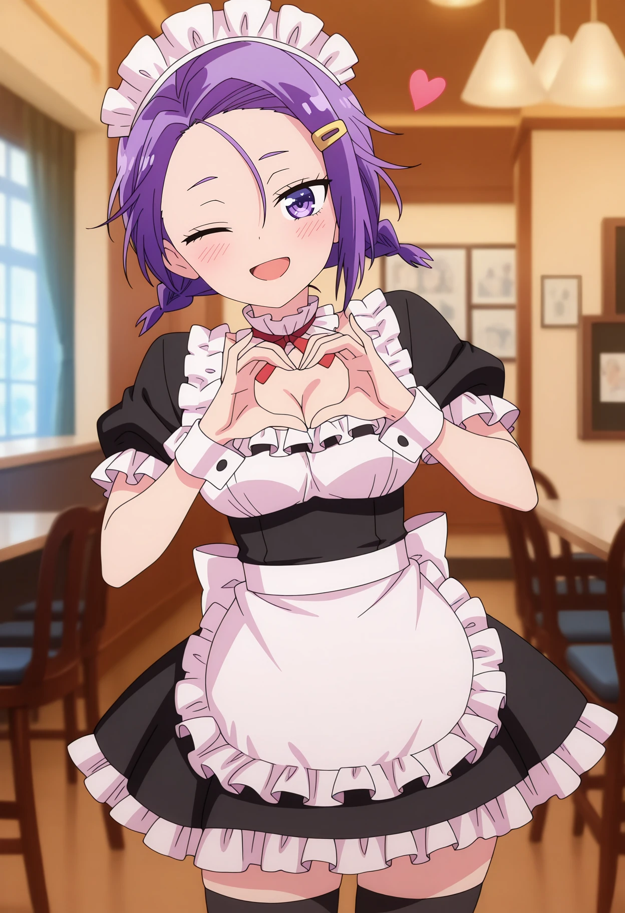forehead, hair between eyes, twin braids, short hair, purple hair, purple eyes, hairclip