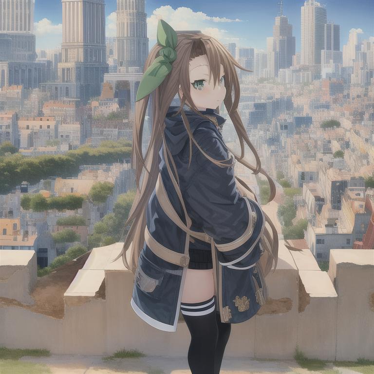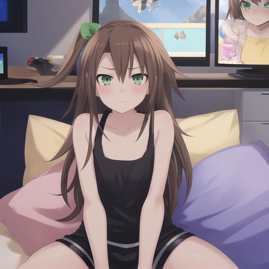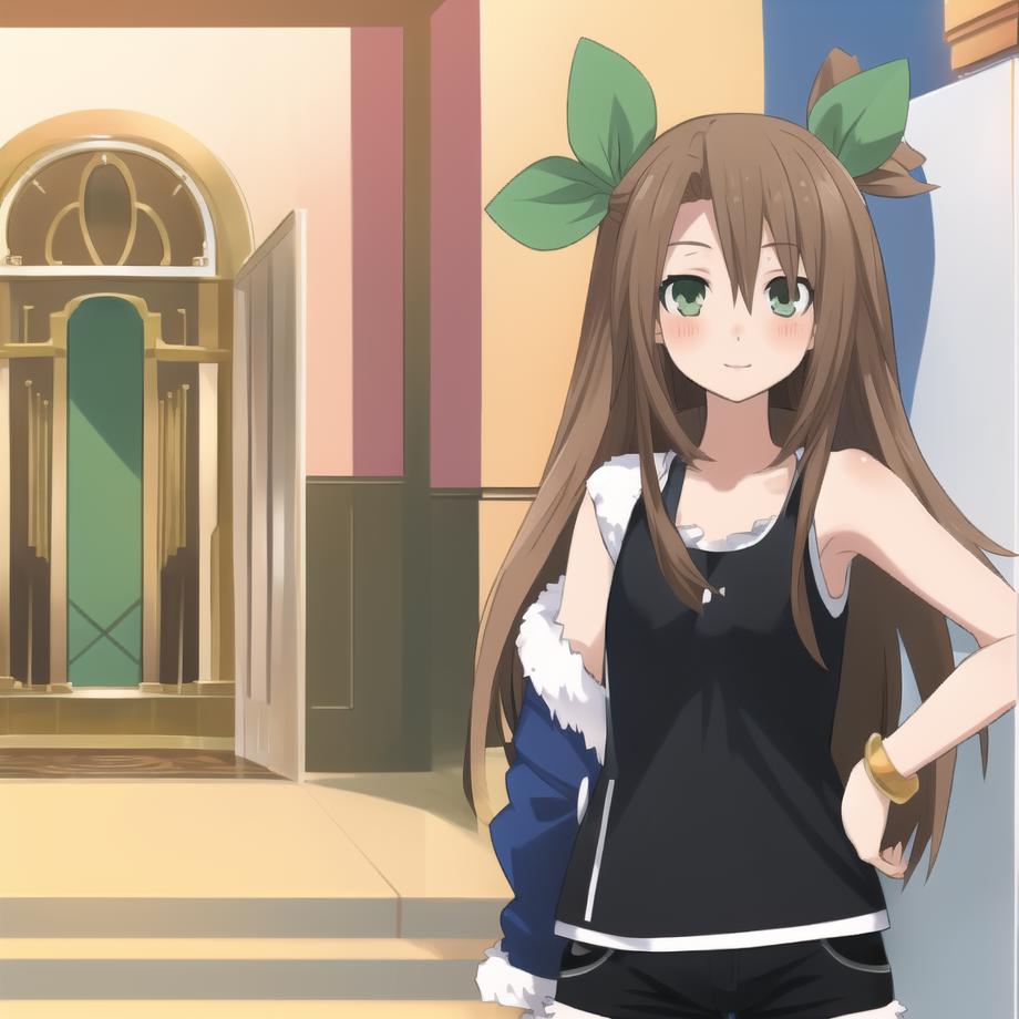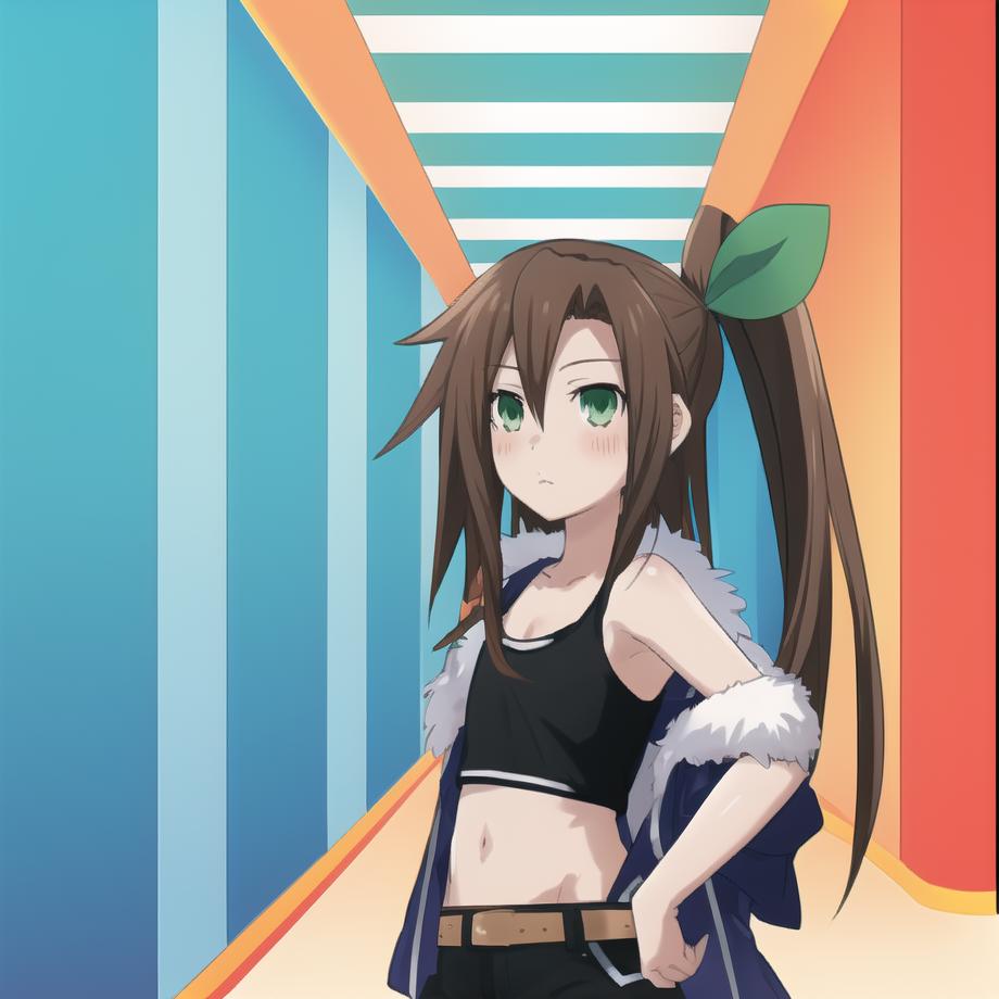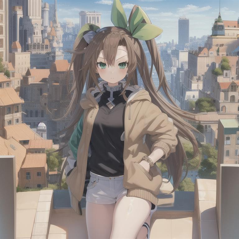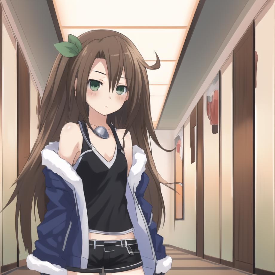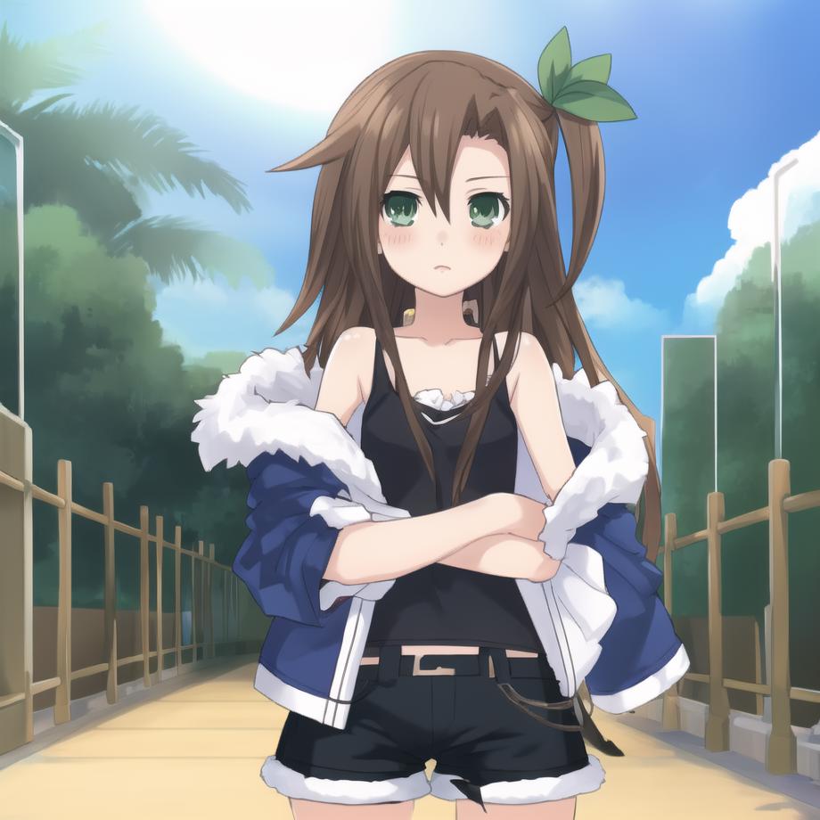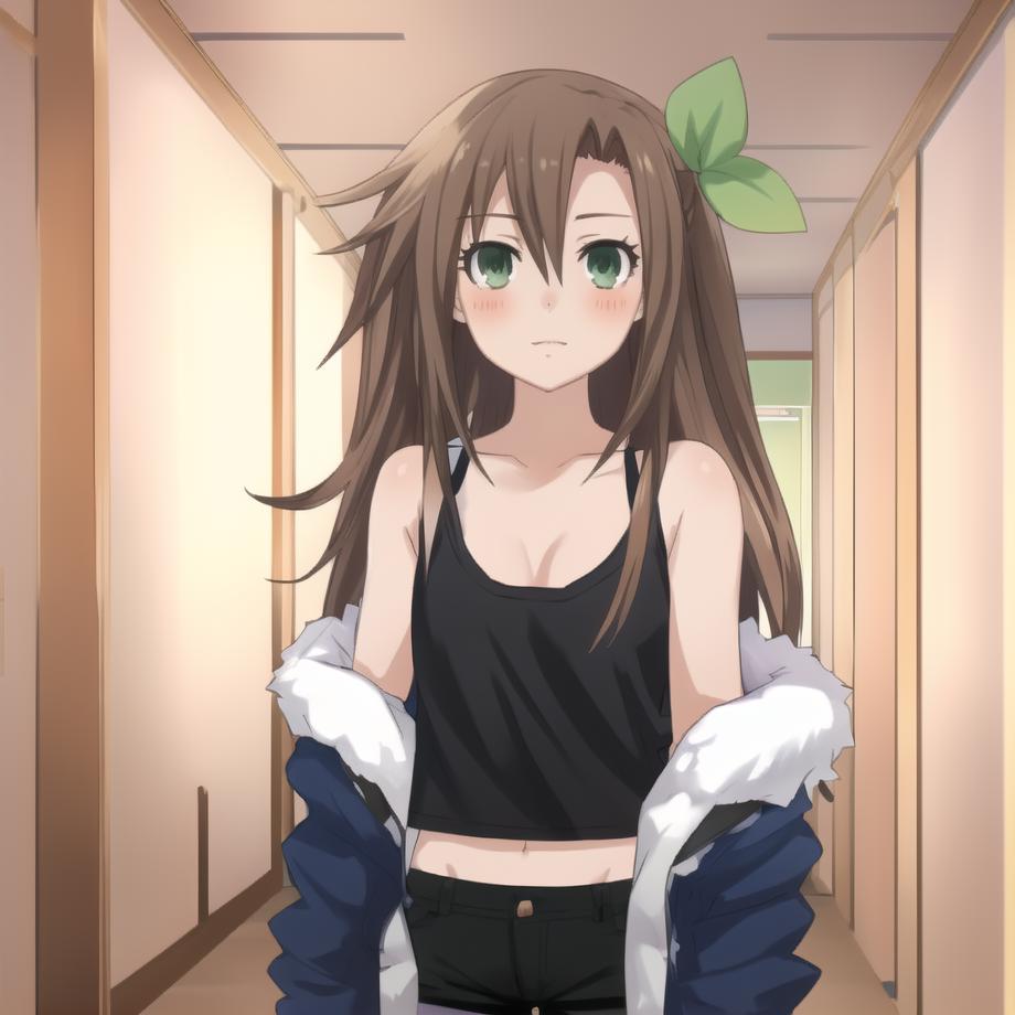 Tags for basic outfit: 1 girl, green eyes, black tank top, black shorts, black boots, blue jacket, fur trim, brown hair, hair accessory, IF by_Tsunako, oversized clothes,