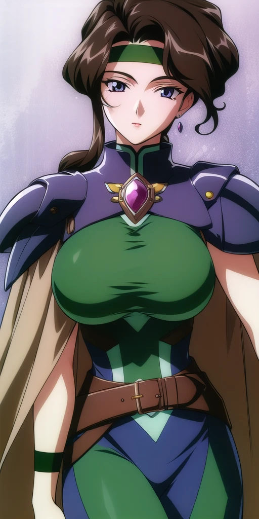 green_sleeveless_bodysuit_brown_capelet_pauldrons_green_headband_wristband_arm_strap_gem_belt: Her classic outfit.
