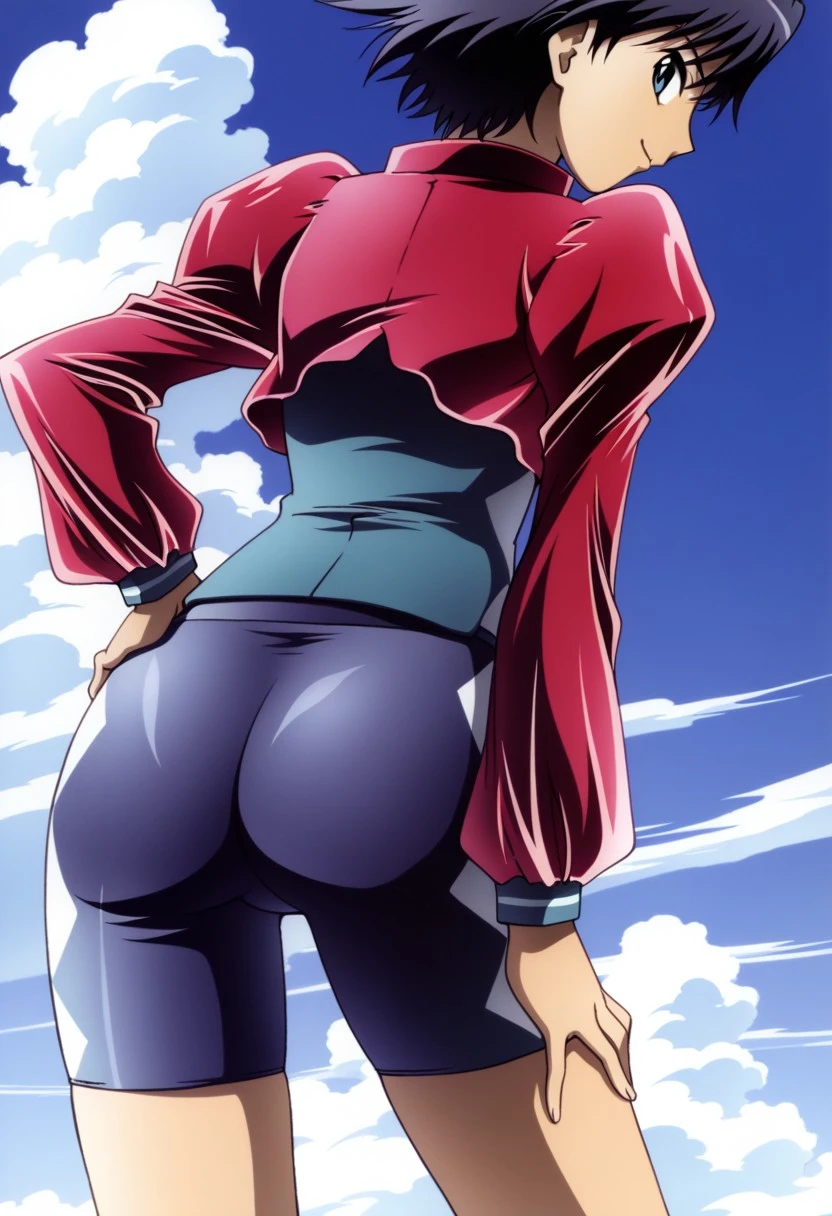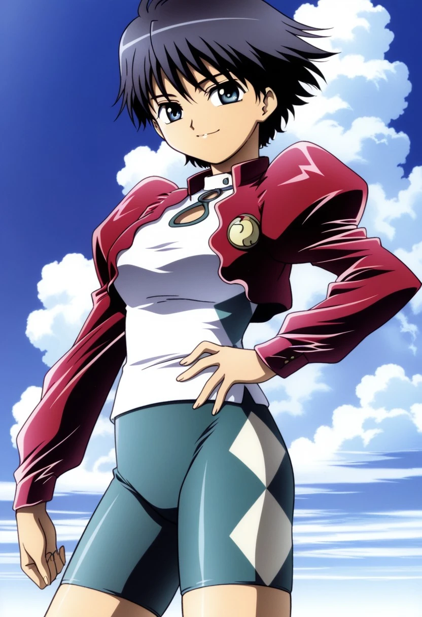 red cropped jacket, puff sleeves, white shirt with keyhole cutout, bike shorts