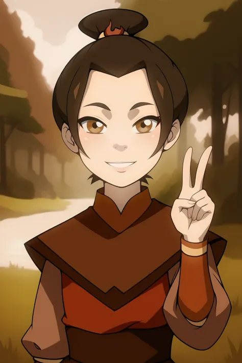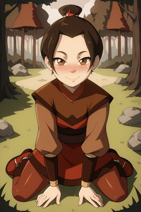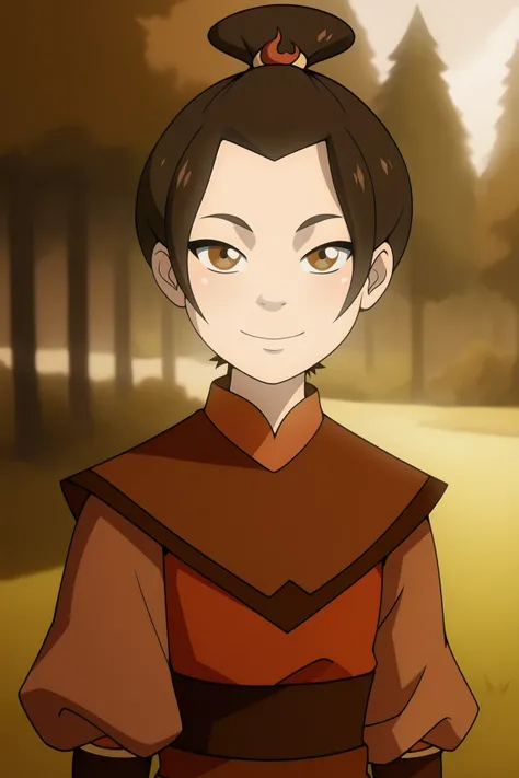 AzulaAPXL, brown eyes, brown hair, short hair, parted bangs, hair ornament, hair bun, topknot, flat chest,