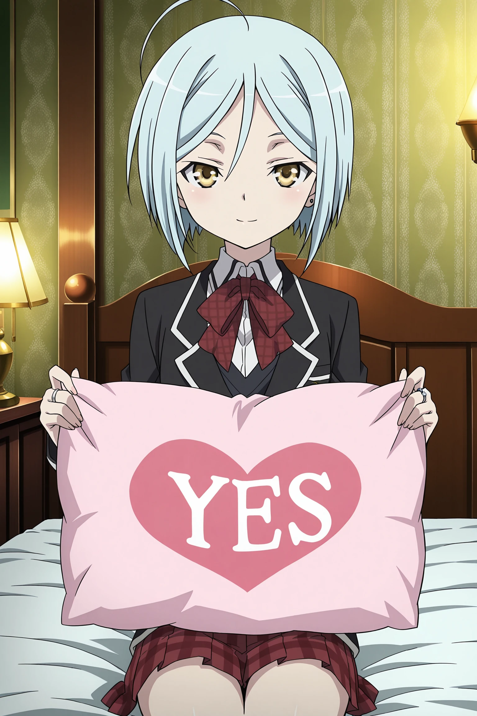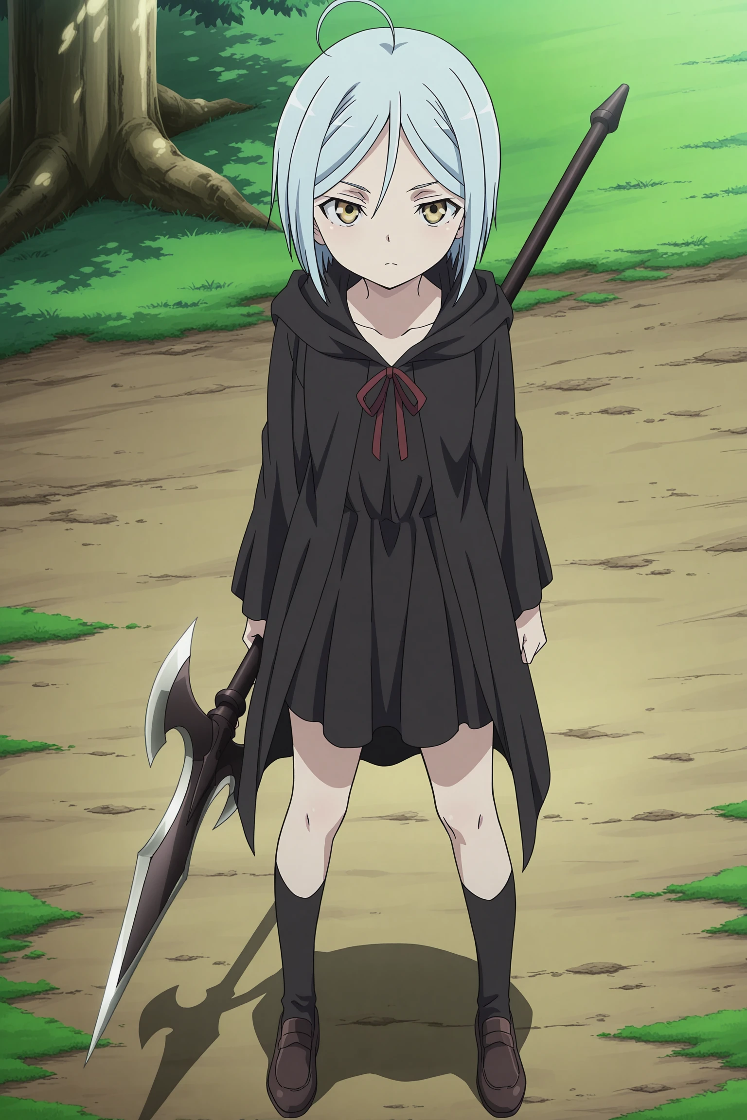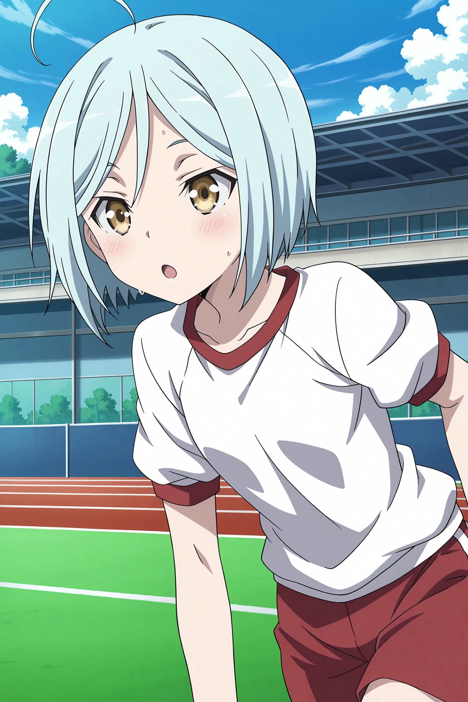 Arin Kannazuki (character), 1girl, solo, light blue hair, ahoge, short hair, yellow eyes