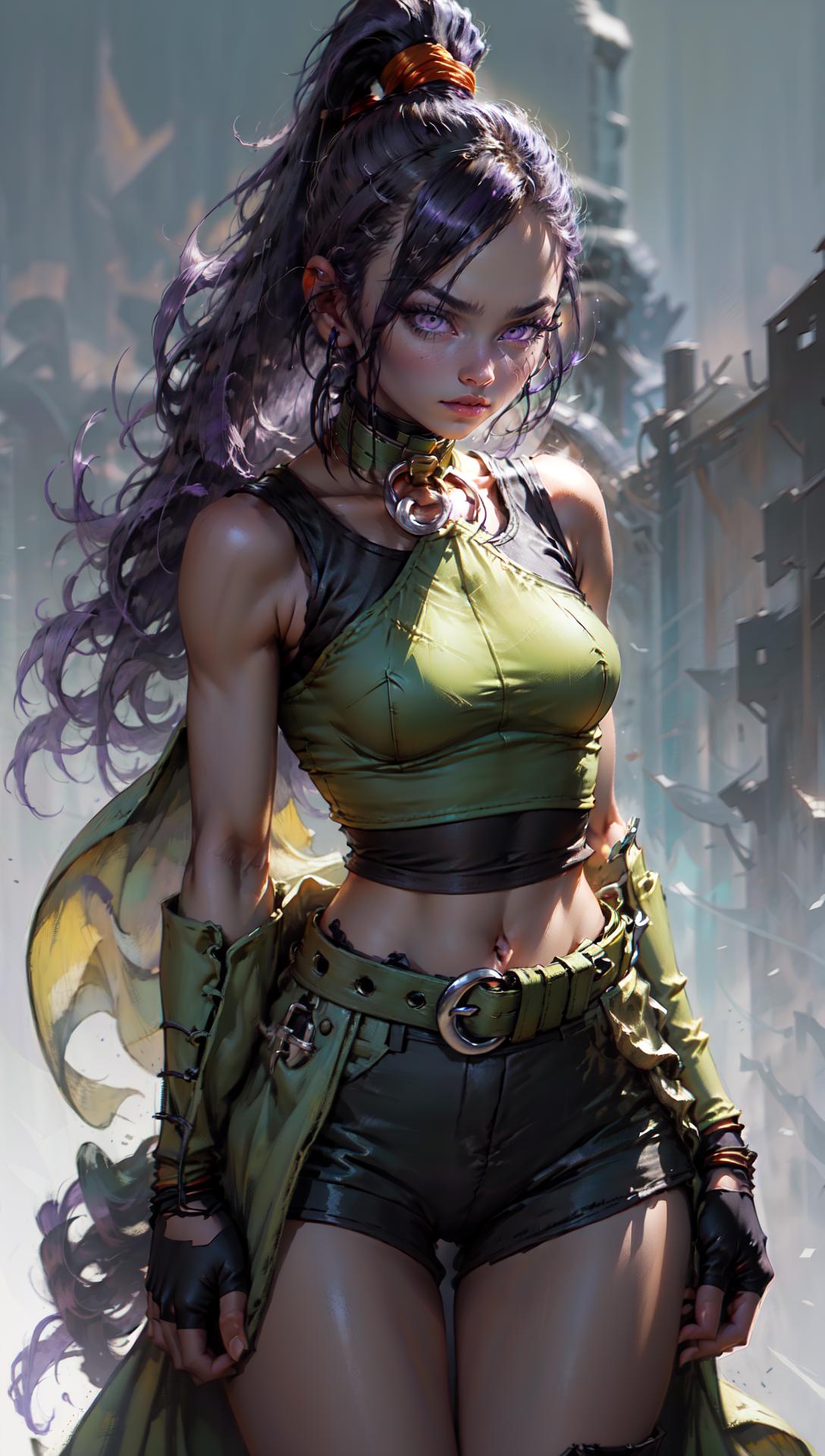 martina, purple eyes, bangs, black hair, long hair, ponytail, hair scrunchie, crop top, o-ring top, green shirt, bare shoulders, sleeveless, green choker, navel, fingerless gloves, green belt, short shorts, waist cape