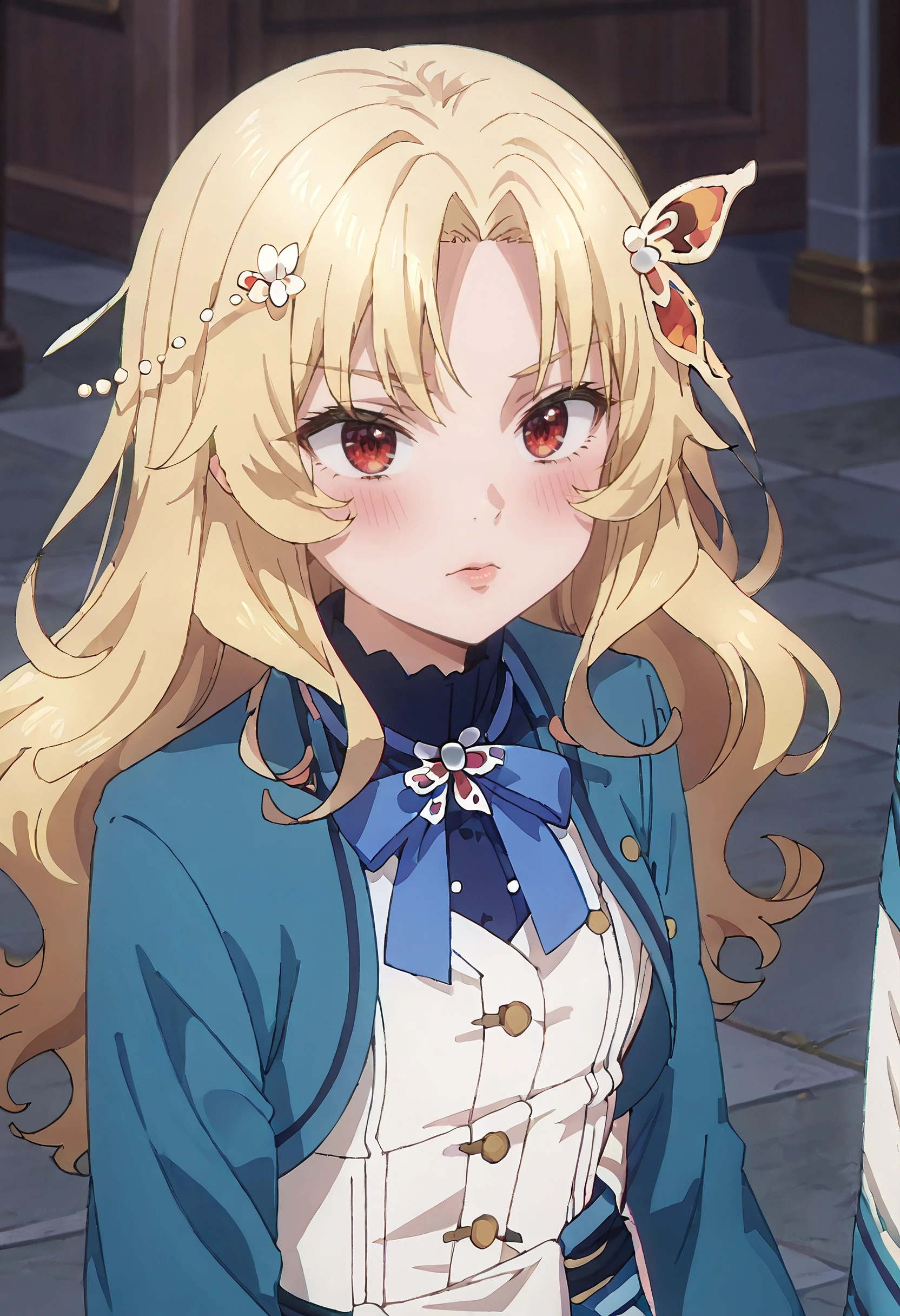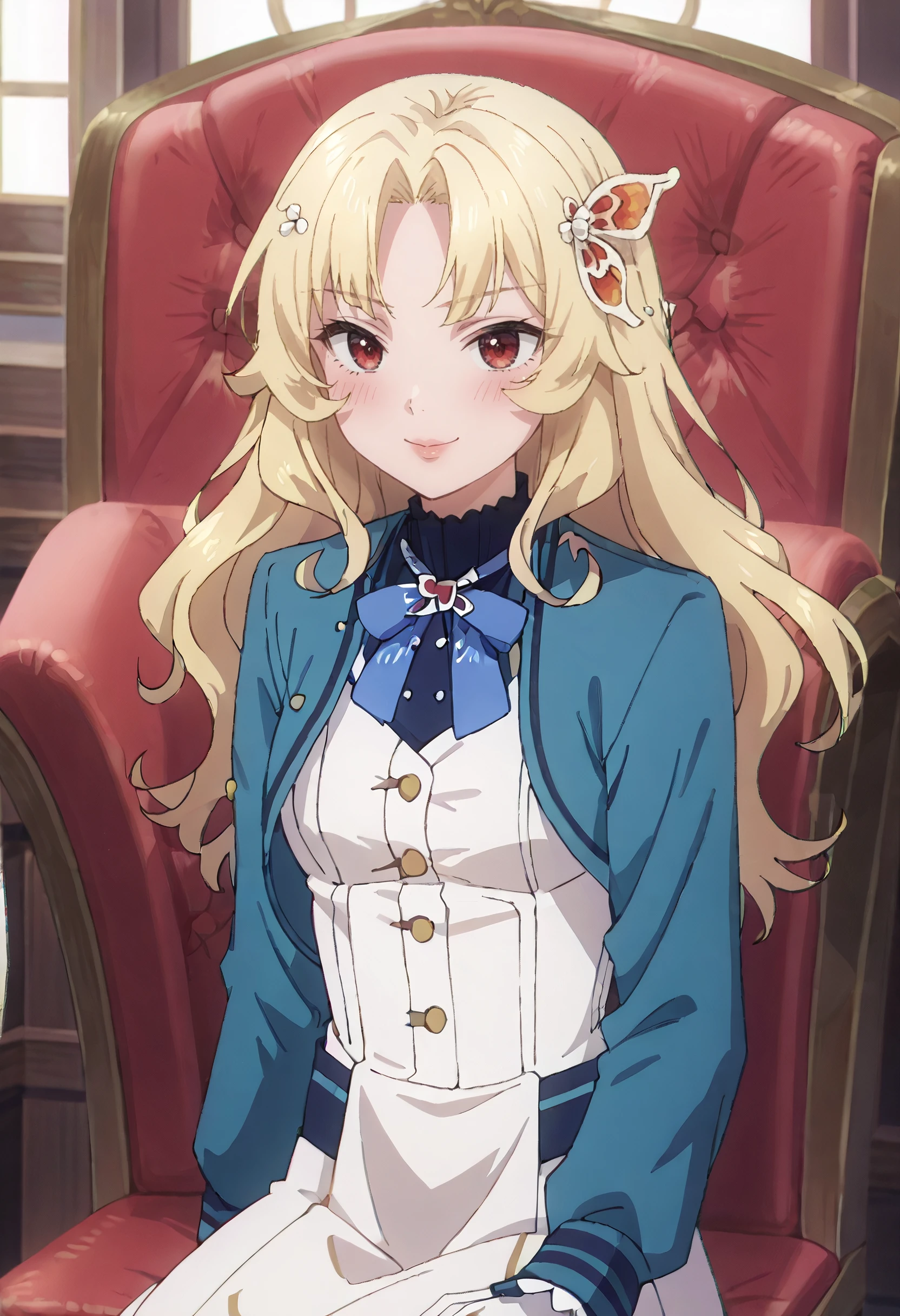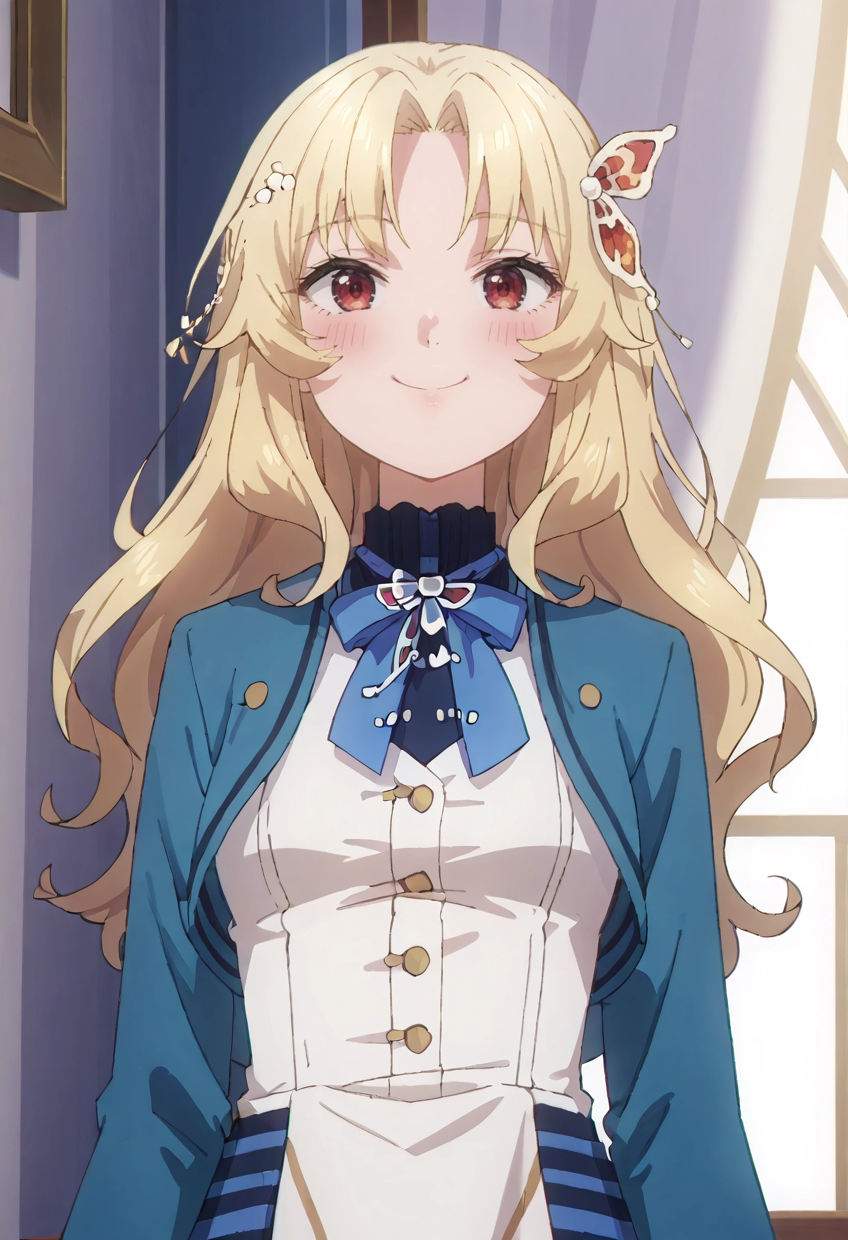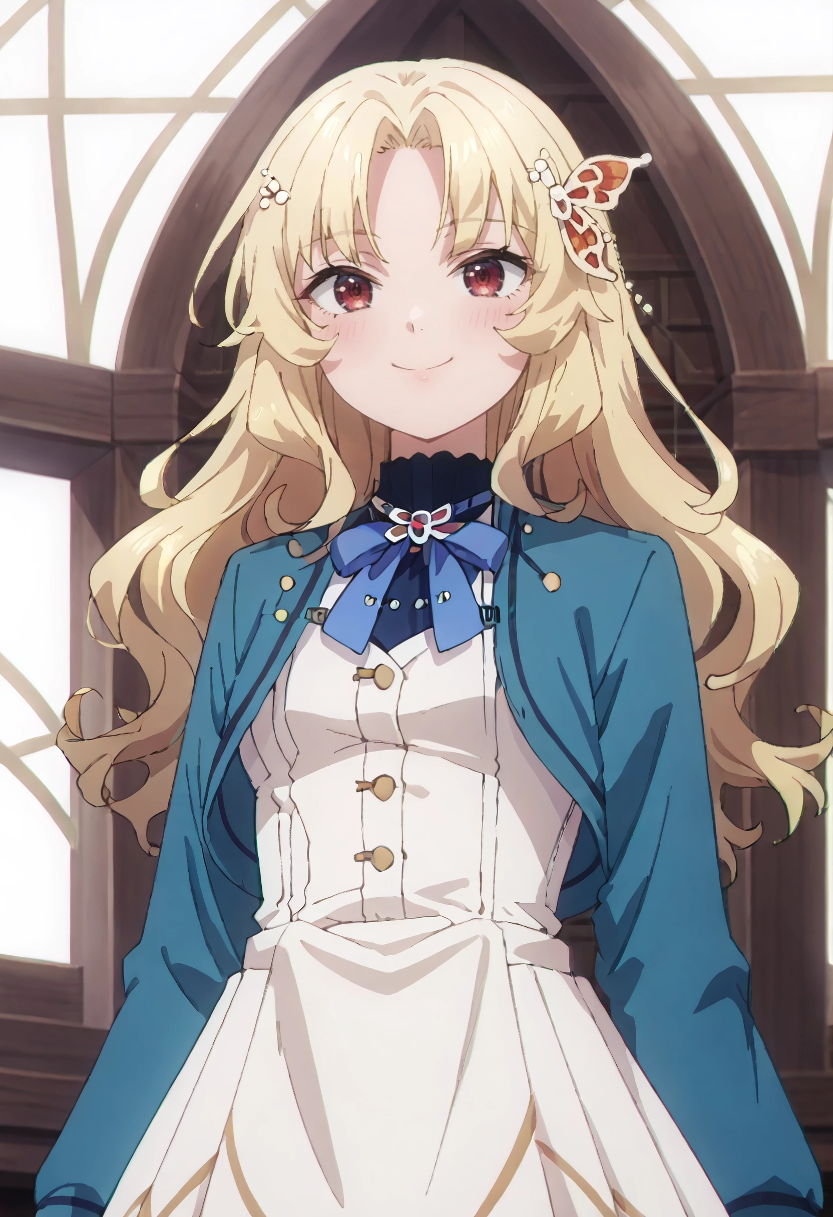SWCBridget, blonde hair, long hair, hair ornament, parted bangs, wavy hair, red eyes, sidelocks, butterfly hair ornament,
