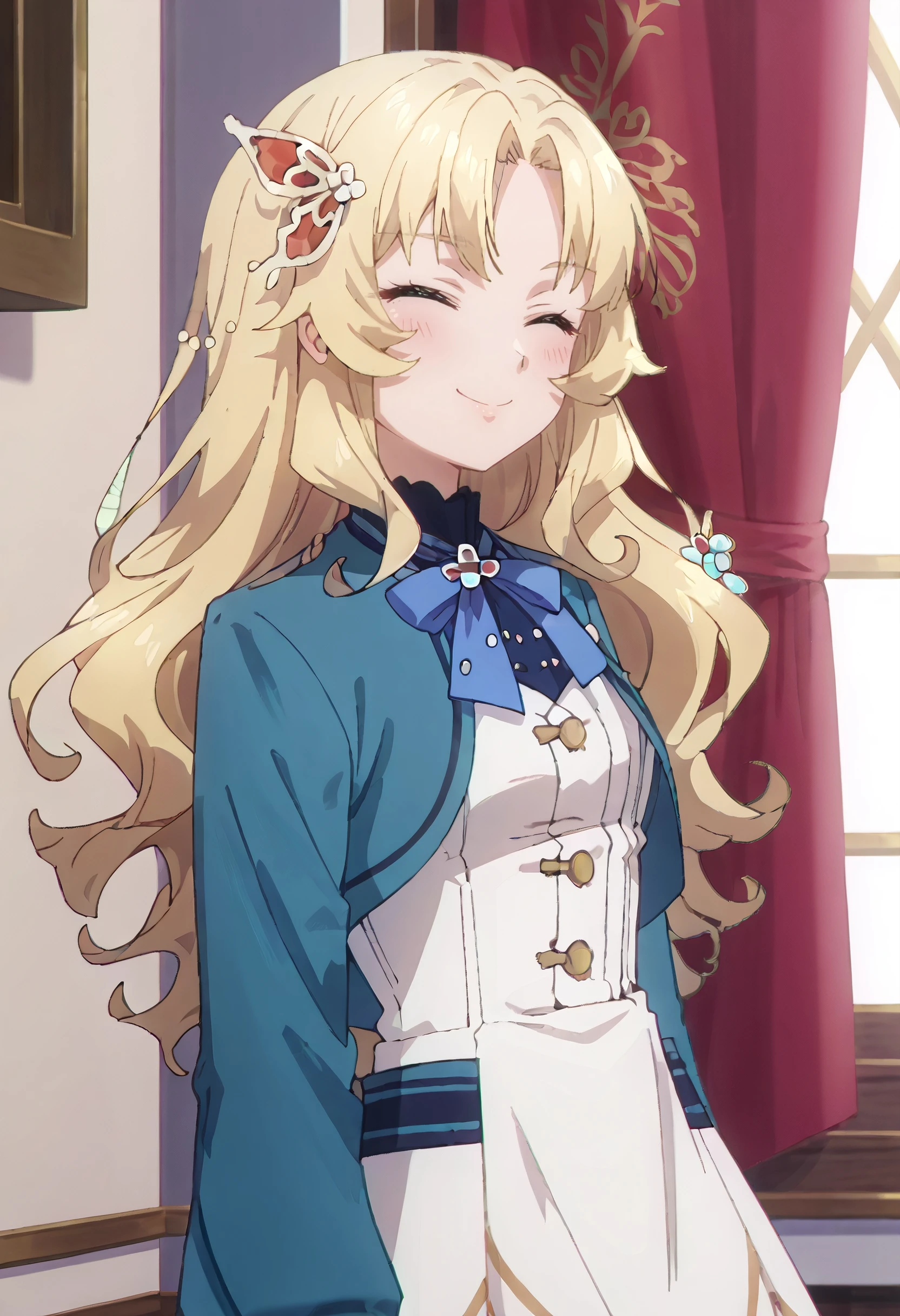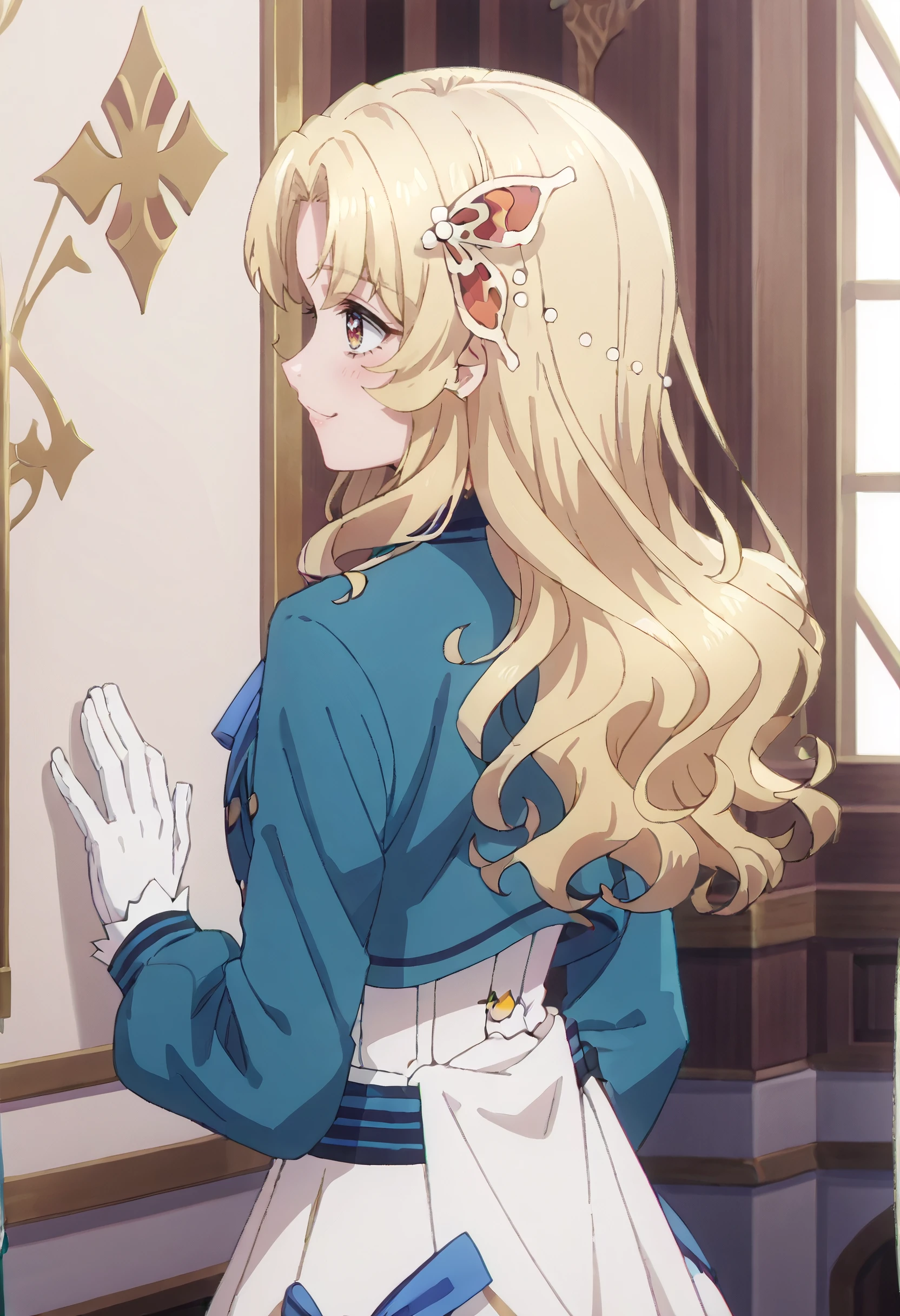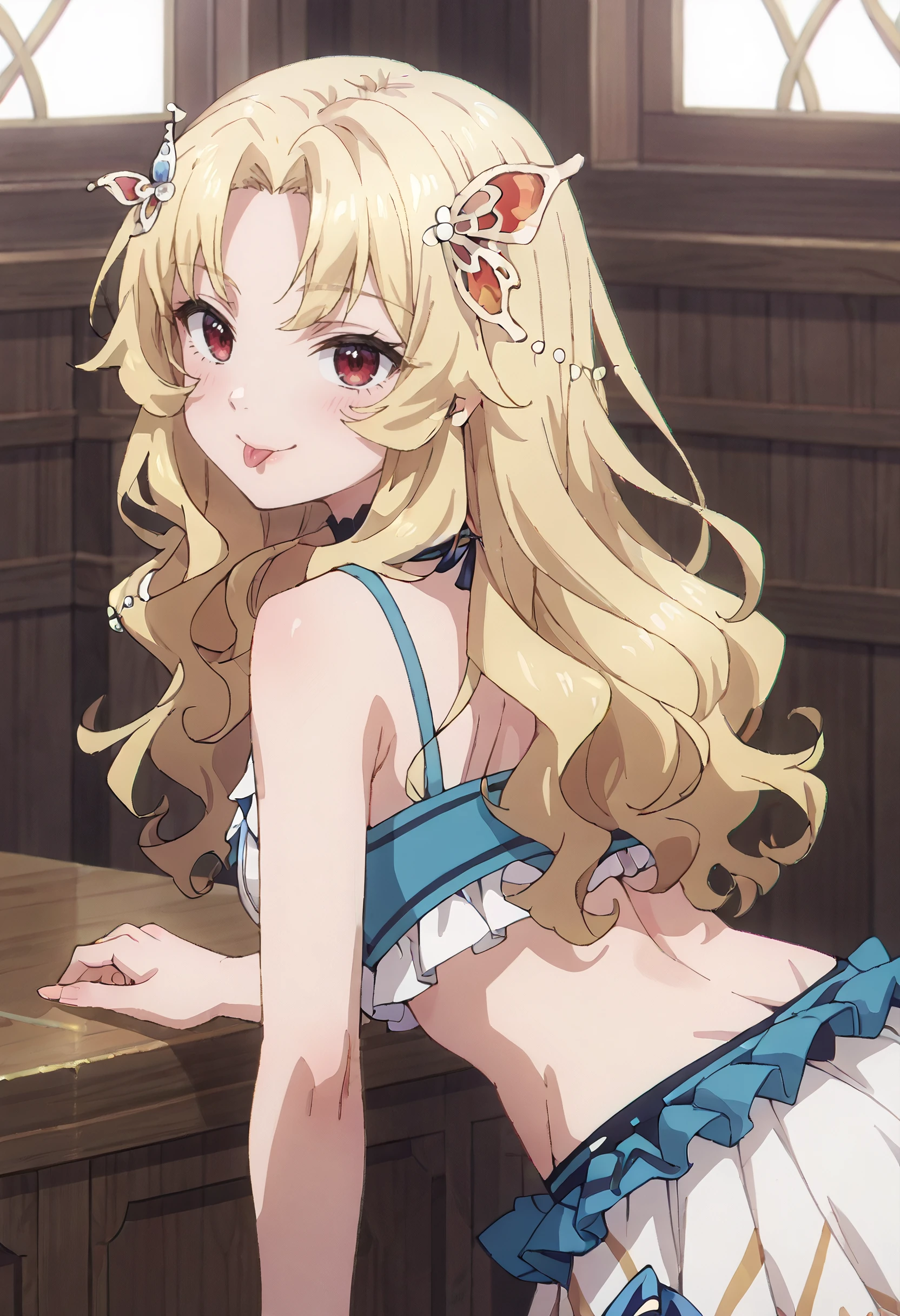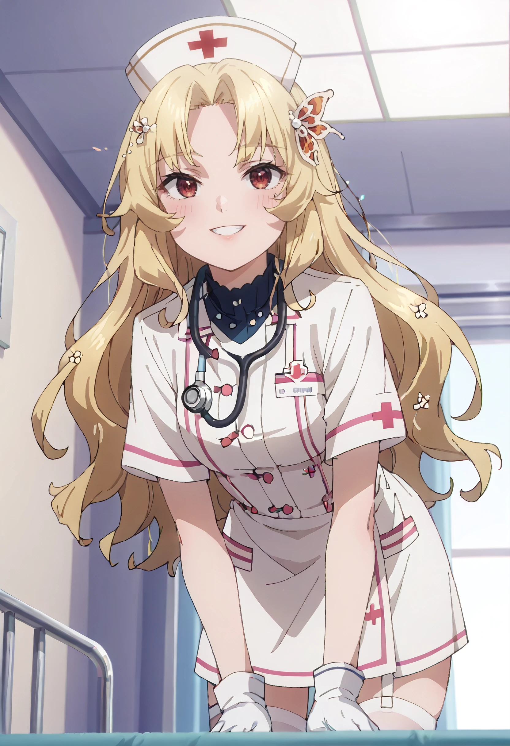 SWCBridget, blonde hair, long hair, hair ornament, parted bangs, wavy hair, red eyes, sidelocks, butterfly hair ornament,