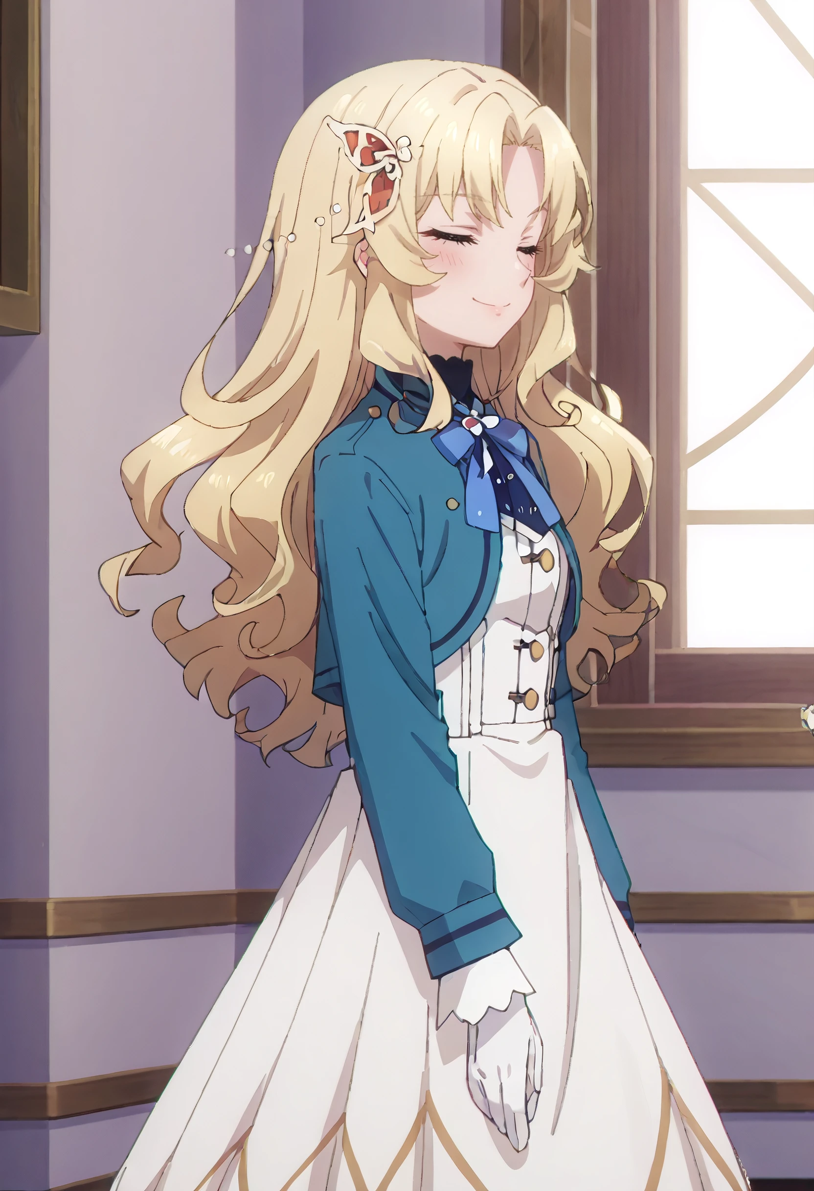BridgetOutfit, blue jacket, ribbon, long sleeves, white dress, blue ribbon, cropped jacket, bow, blue bow, neck ribbon, long dress, buttons, blue bowtie, blue ascot, white gloves,