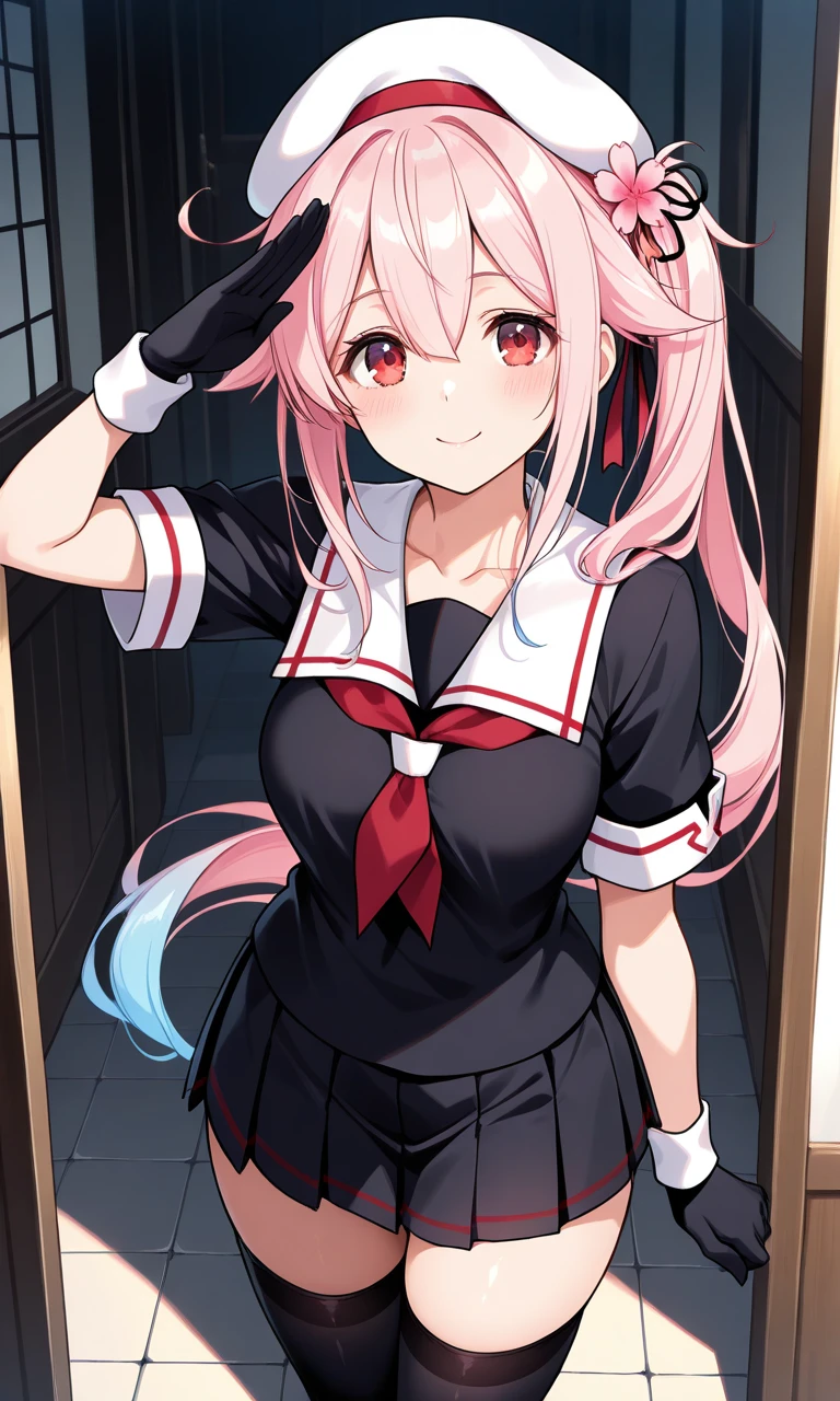 harusameKC,pink hair,long hair, red eyes, hat, ribbon, hair between eyes, school uniform, blue hair, collarbone, short sleeves, pleated skirt, black gloves, black thighhighs, hair flower, black skirt,side ponytail, beret, white headwear, hair flaps, red neckerchief, pink flower, black serafuku, white sailor collar, white wristband
