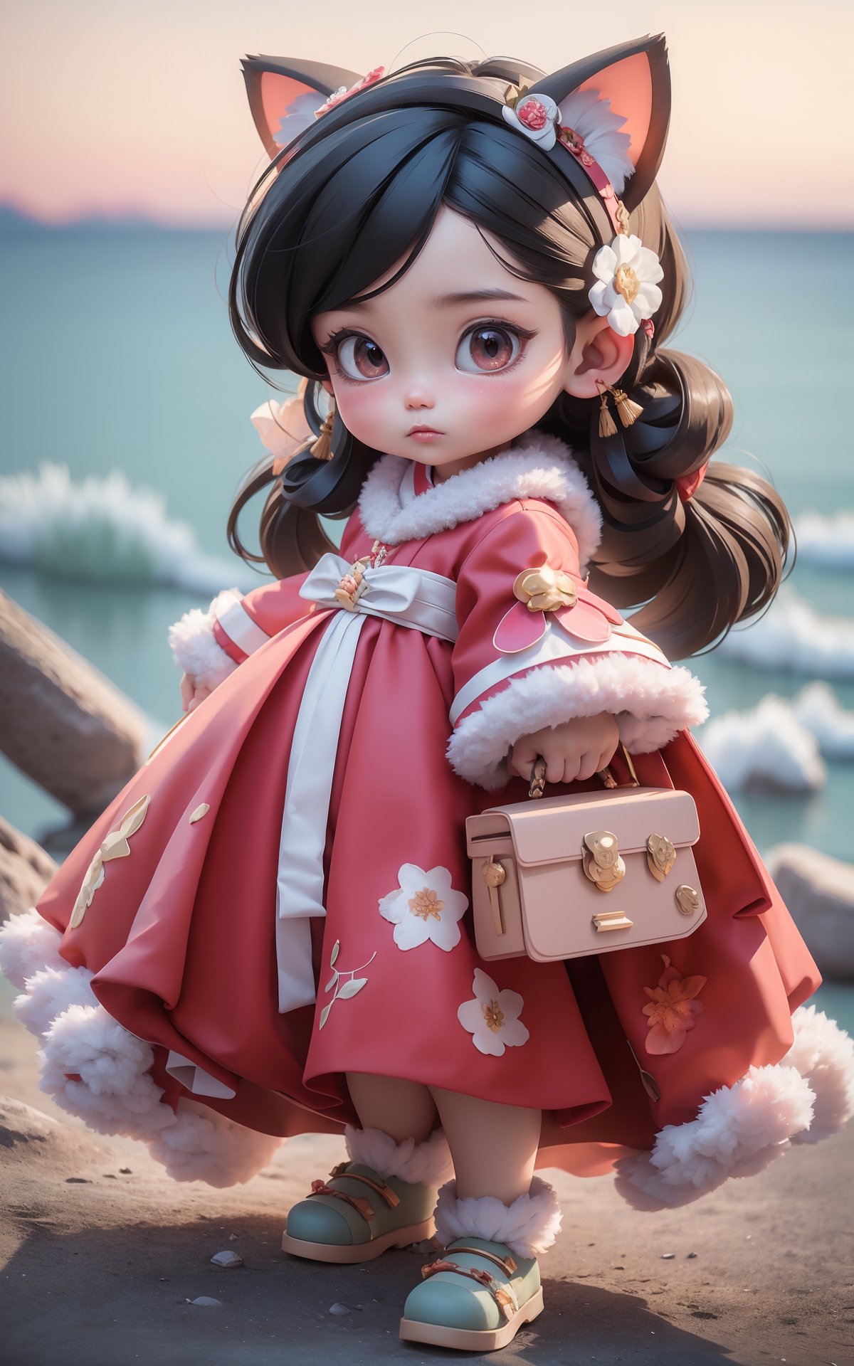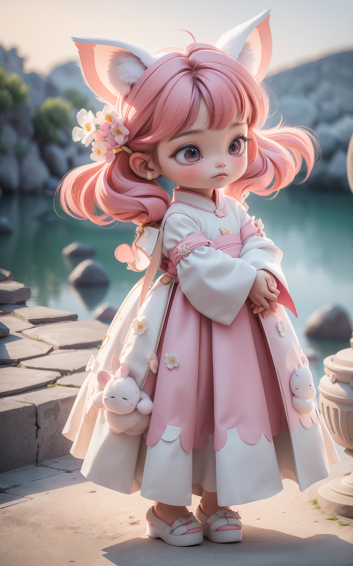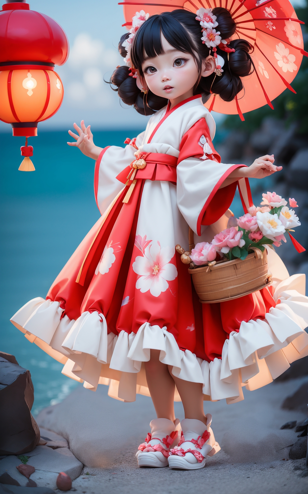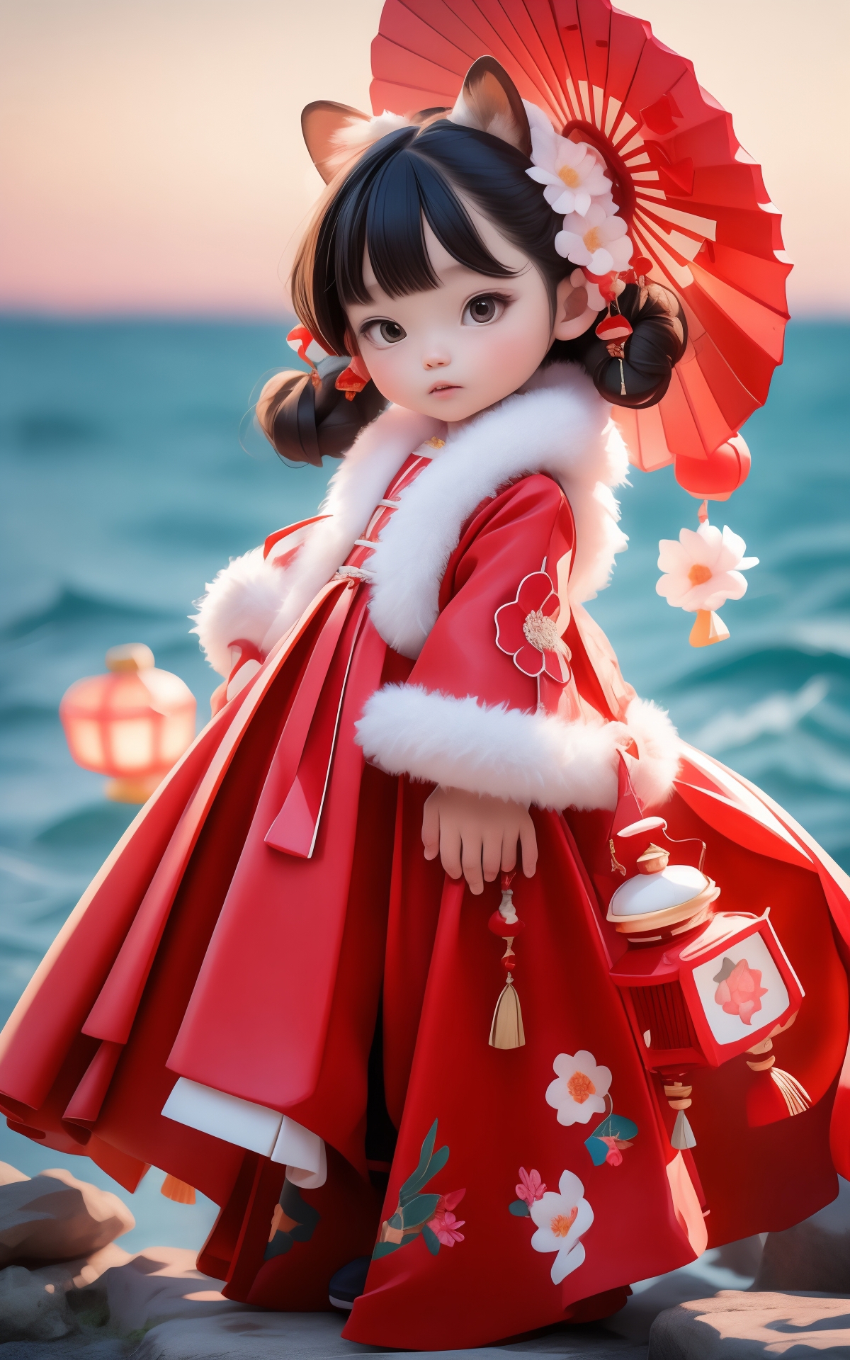 long sleeves, hair ornament, chinese clothes, dress, hair bun, flower, double bun, fur trim, red dress, skirt, bangs, shoes, hanfu, hair flower, wide sleeves, floral print, sandals, white footwear, hanbok, bag, hand fan, braid, jacket, hair rings, holding fan, paper fan, red skirt, lantern, ribbon, outstretched arms, child, pink skirt, long skirt, jewelry, basket, animal ears, red footwear