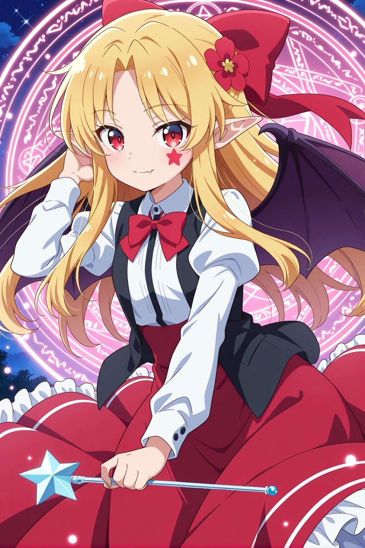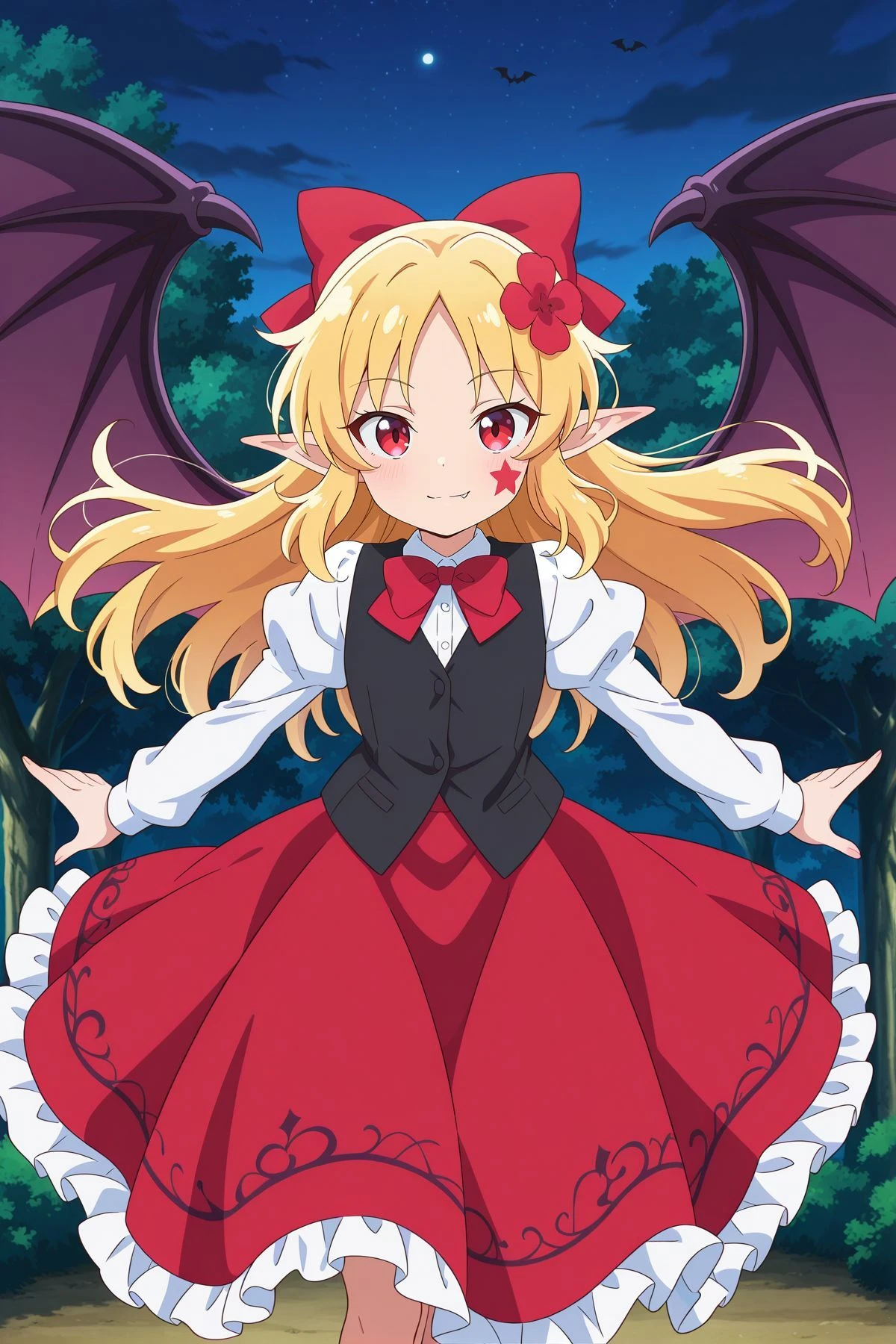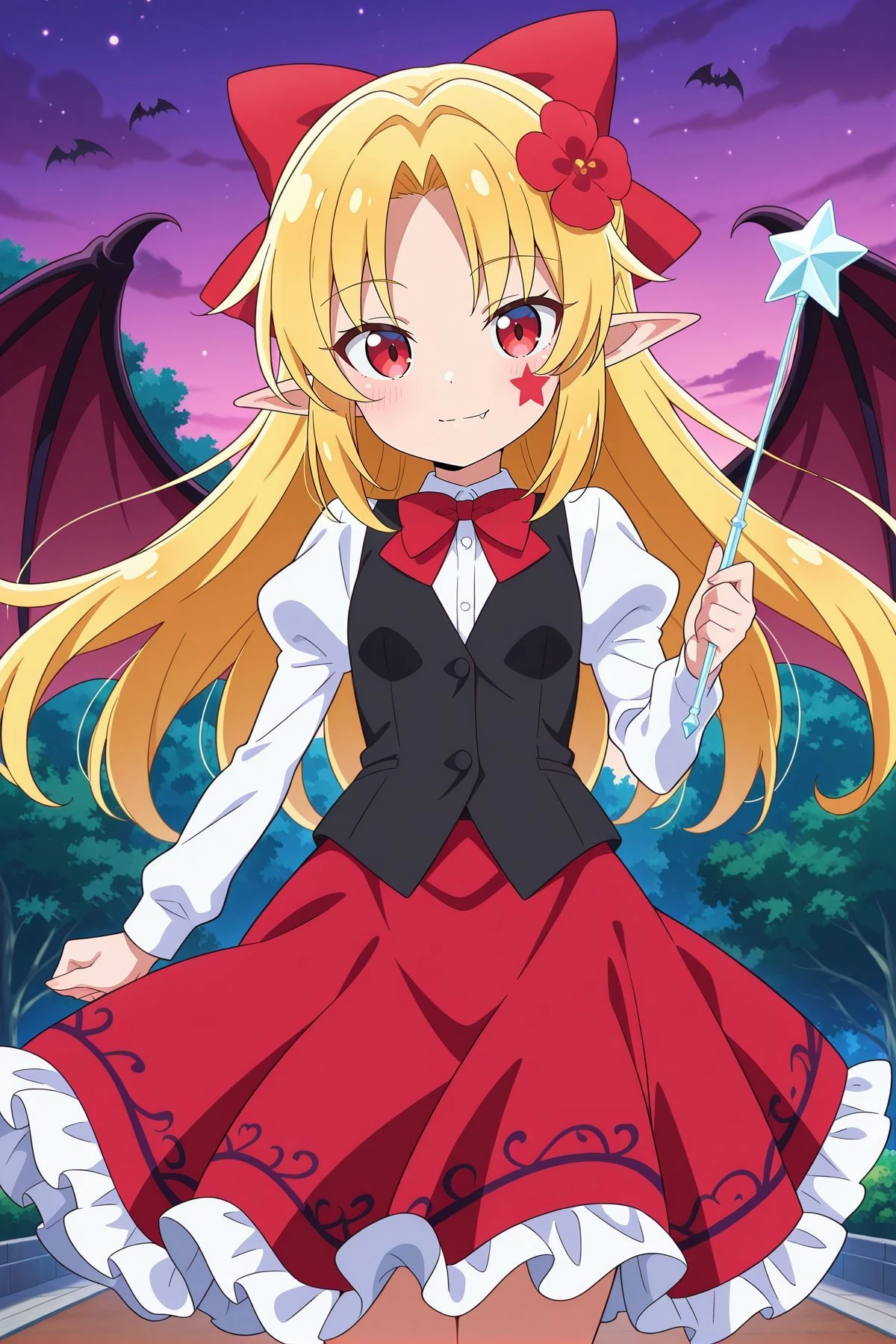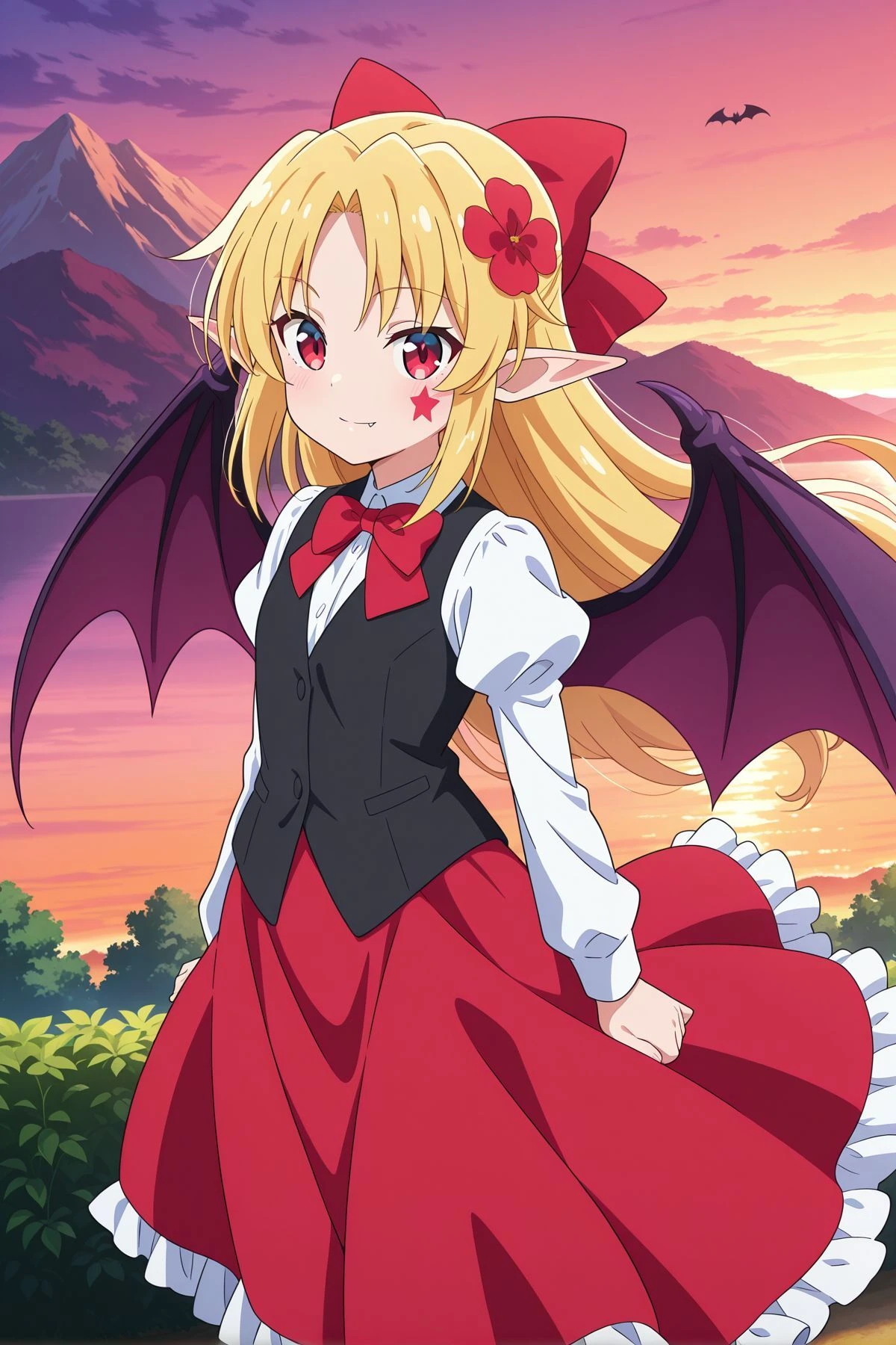 elis, 1girl, solo, red eyes, blonde hair, long hair, parted bangs, pointy ears, bat wings, facial mark, fang,hair bow, red bow, hair flower, red flower, hair ornament, red bowtie, black vest, white shirt, juliet sleeves, puffy long sleeves, red skirt, long skirt, frilled skirt, Optional :