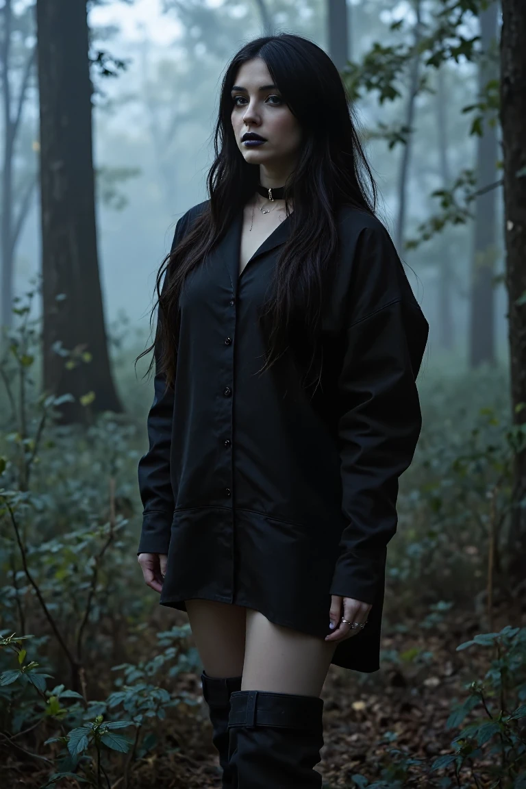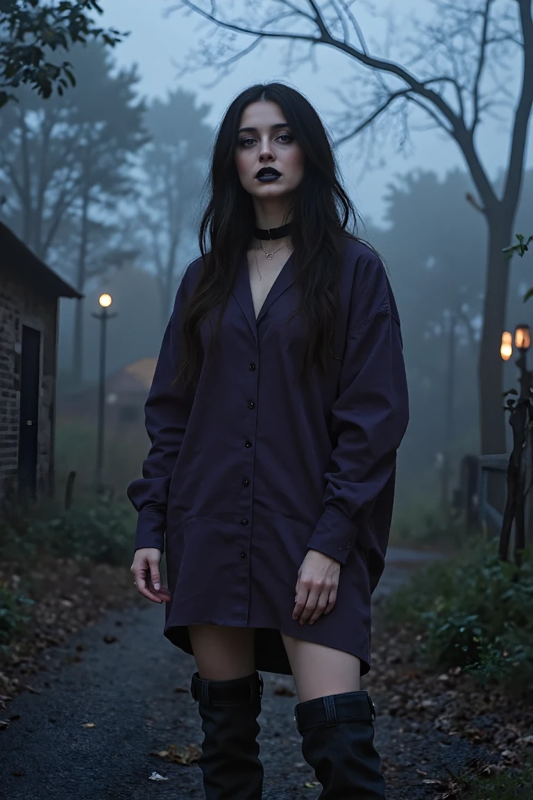 mini dress) that looks oversized and flowing, styled as a button-down shirt.The Boots: Structured denim thigh-high boots with a high heel.