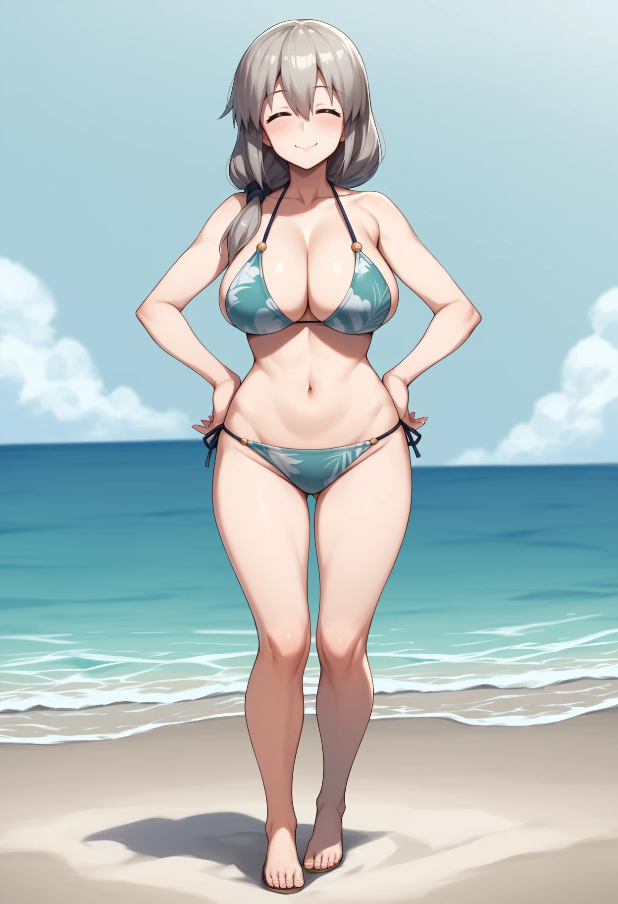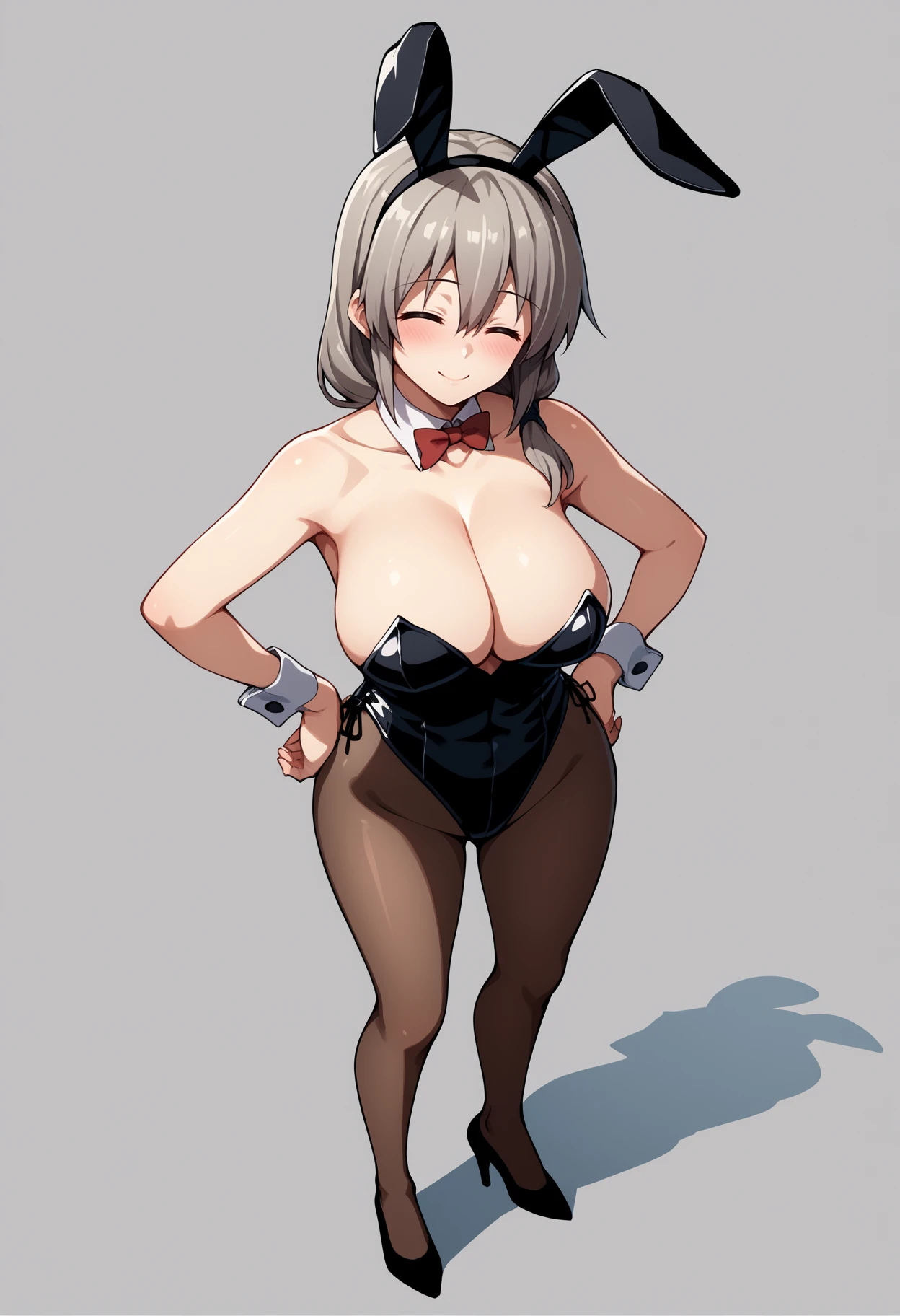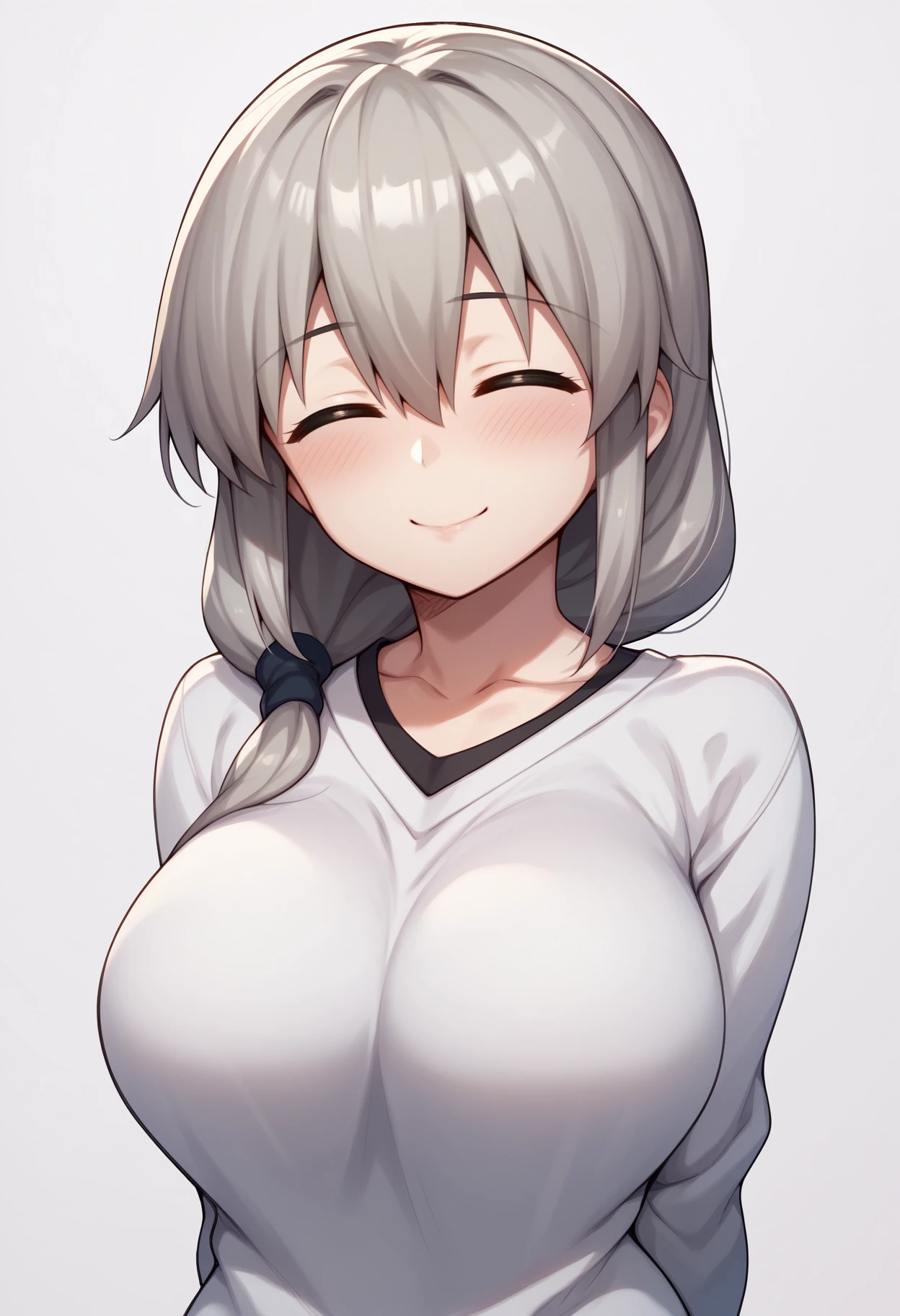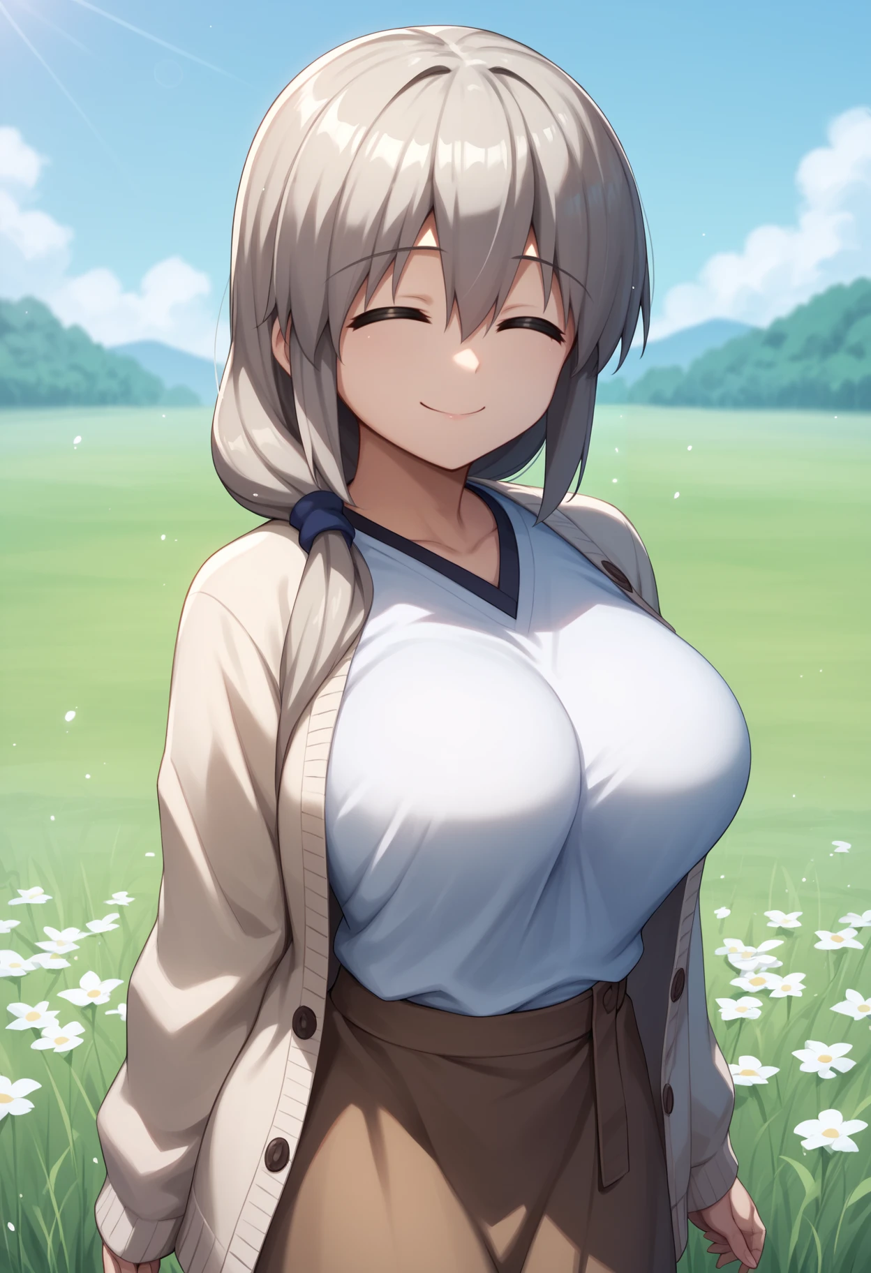 1girl, uzakitsuki, grey hair, hair over shoulder, hair between eyes, closed eyes, mature female, large breasts, long hair