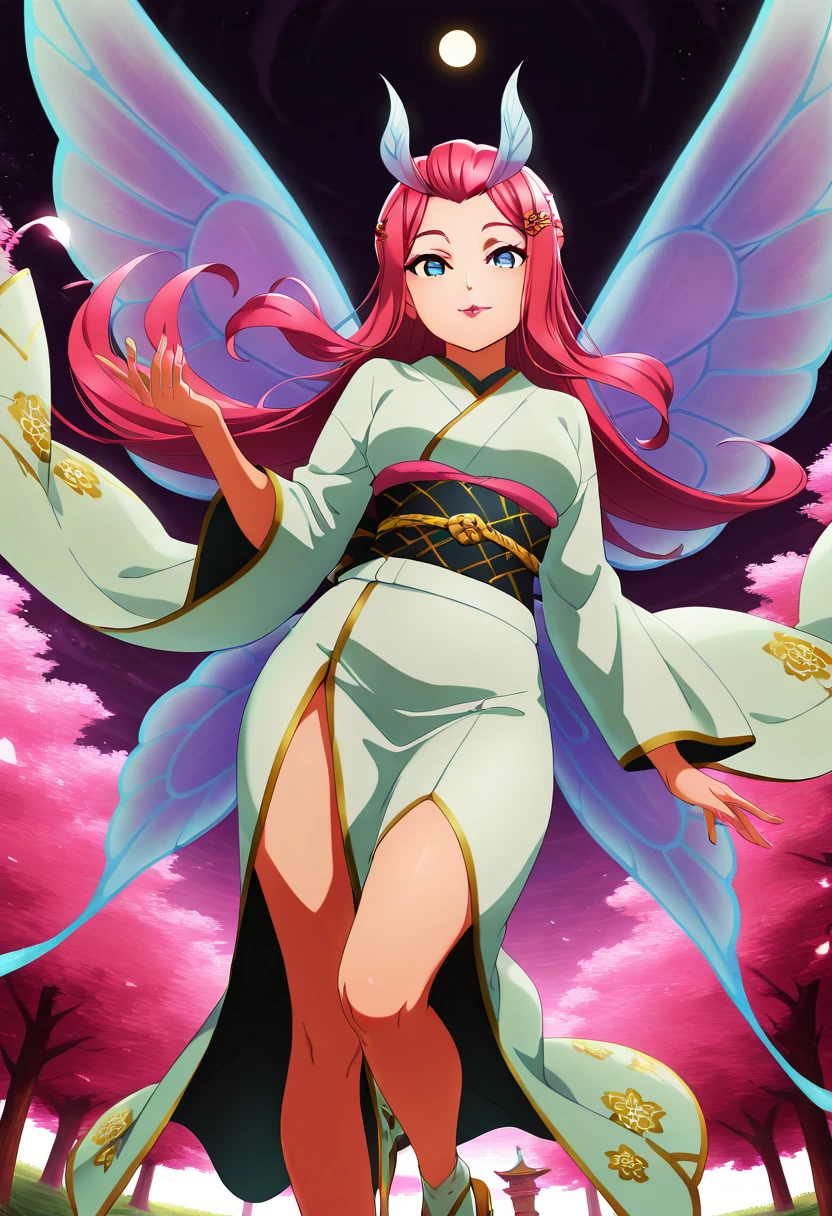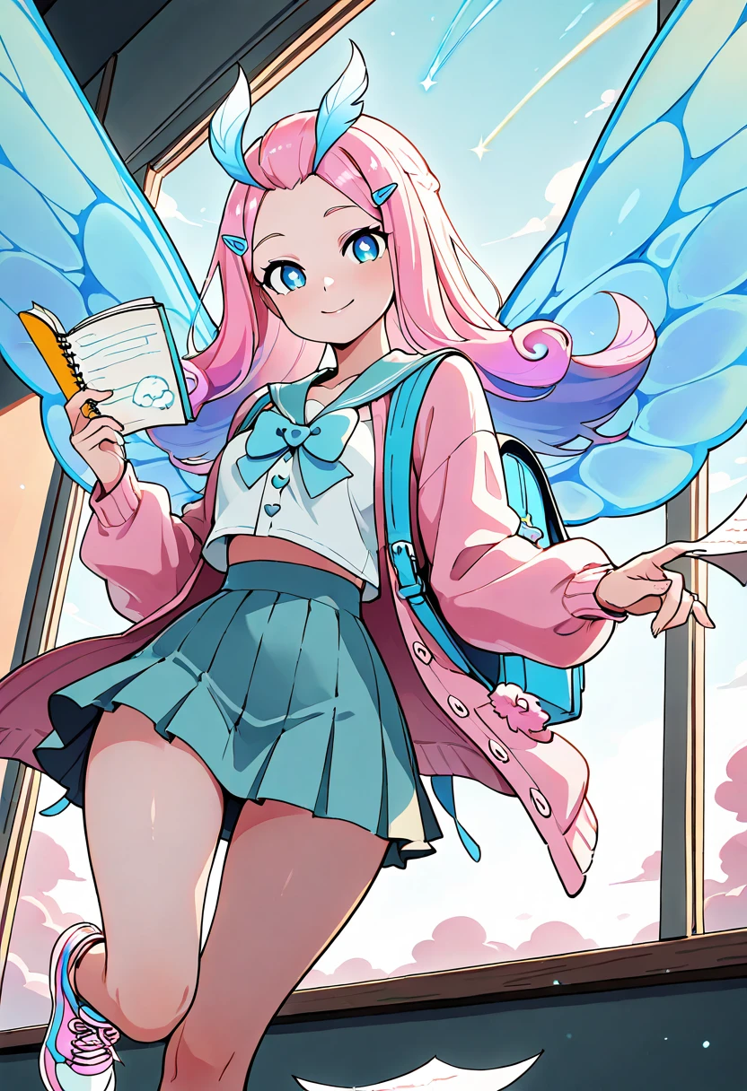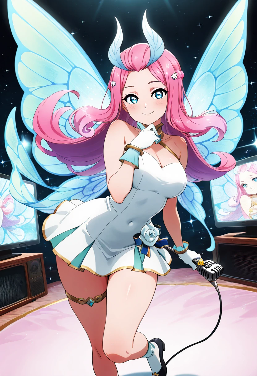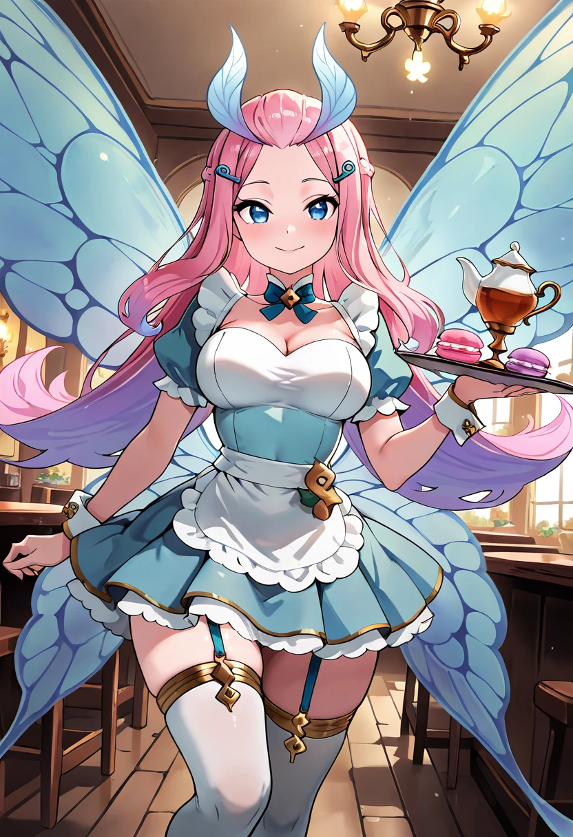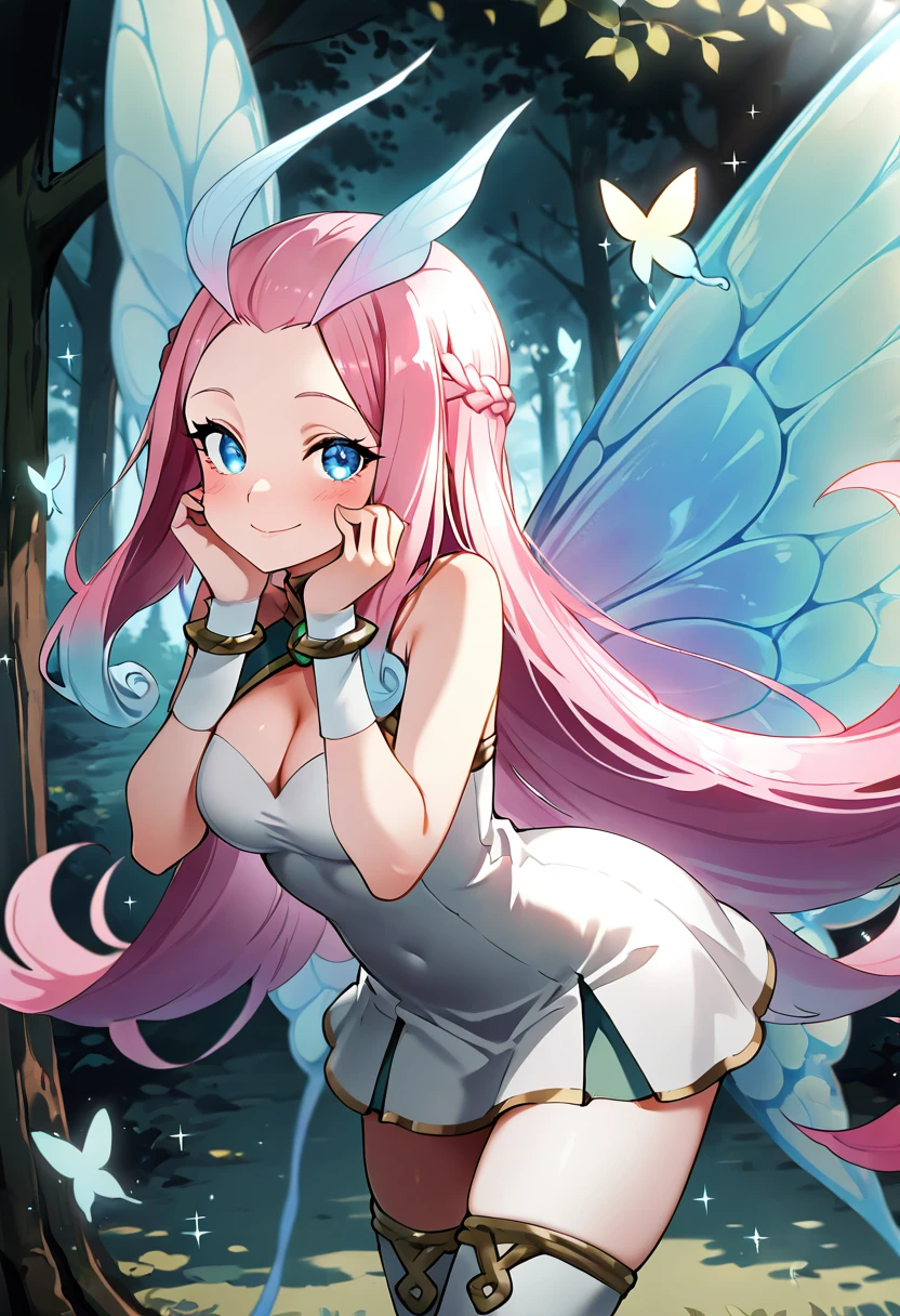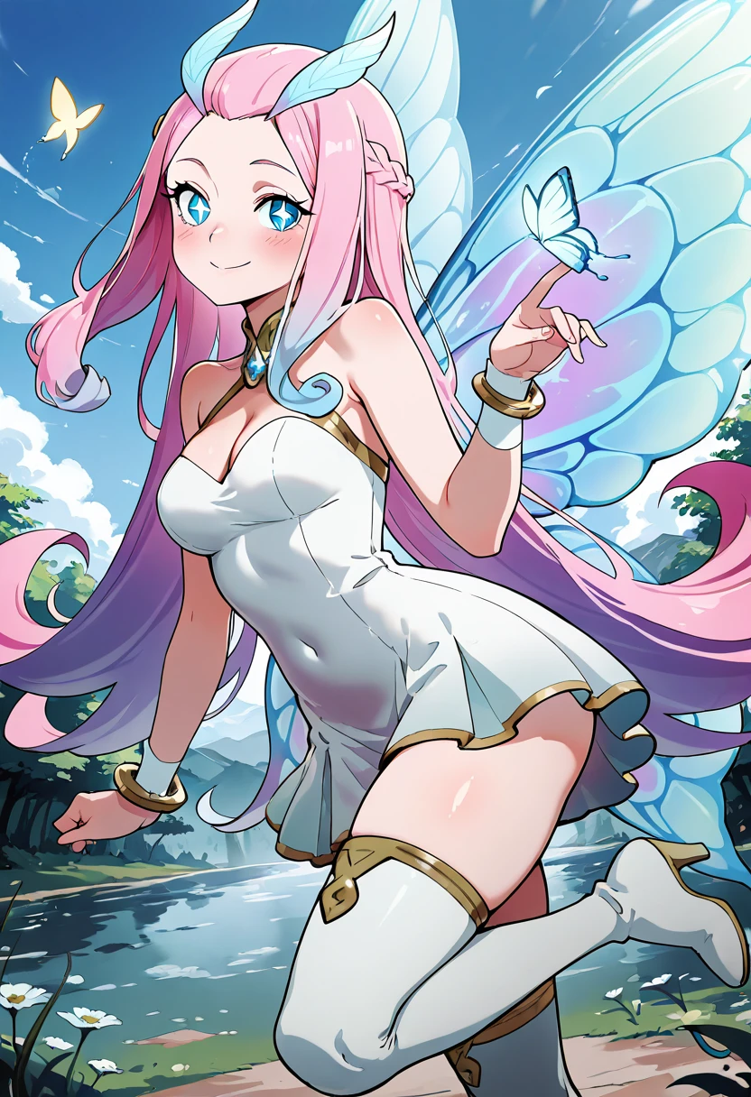 zzTasi, blue eyes, long hair, multicolored hair, pink hair, wings, bare shoulders, white dress, jewelry, thighhighs, bracelet,