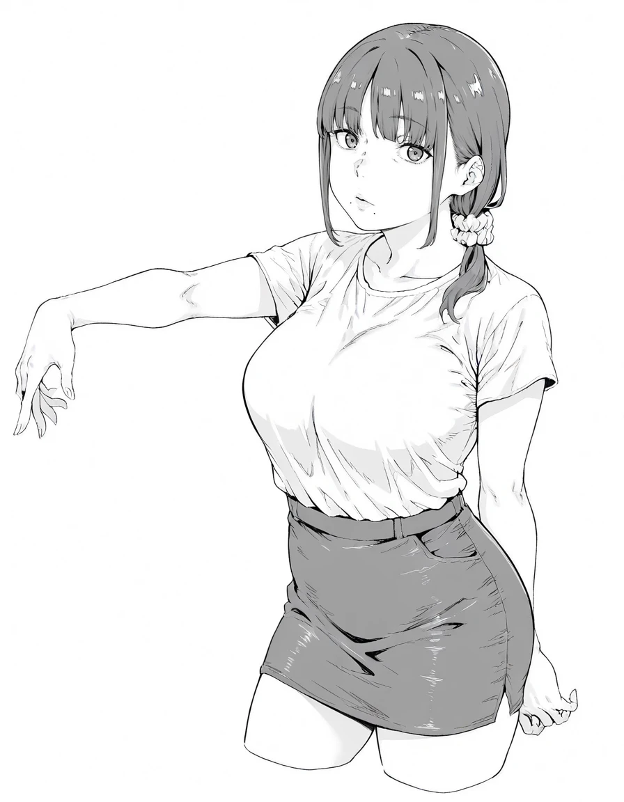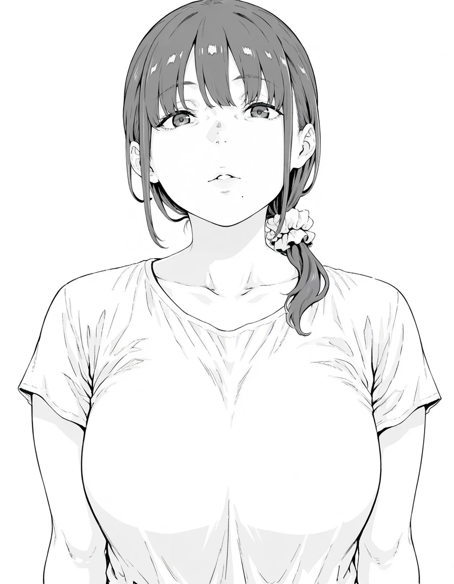 k44-s4n, 1girl, low-tied long hair, scrunchie, hair scrunchie, hair ornament, mole under mouth, shirt, white shirt, short sleeves, large breasts, pencil skirt, grey skirt