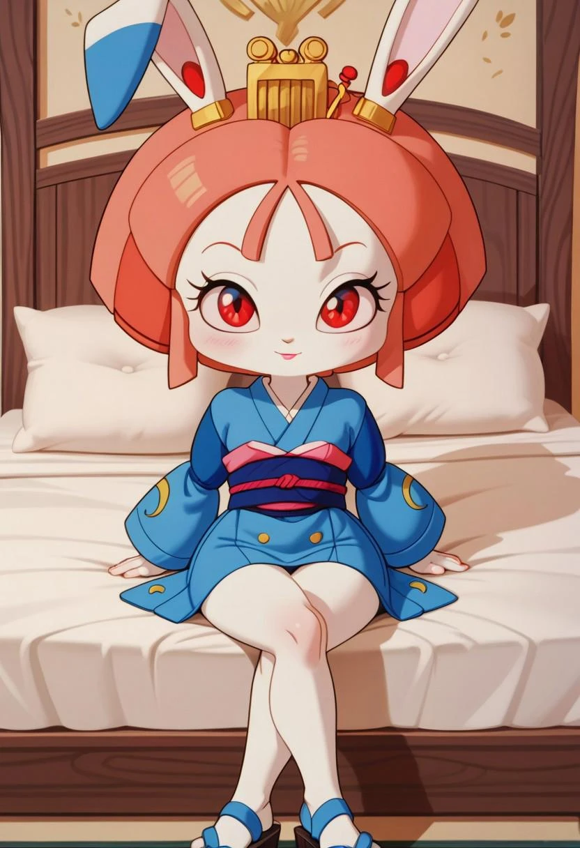 1girl, solo, kimono, japanese clothes, red eyes, animal ears, rabbit ears, joints, blue kimono, furry female, short hair, 1990s (style), retro artstyle