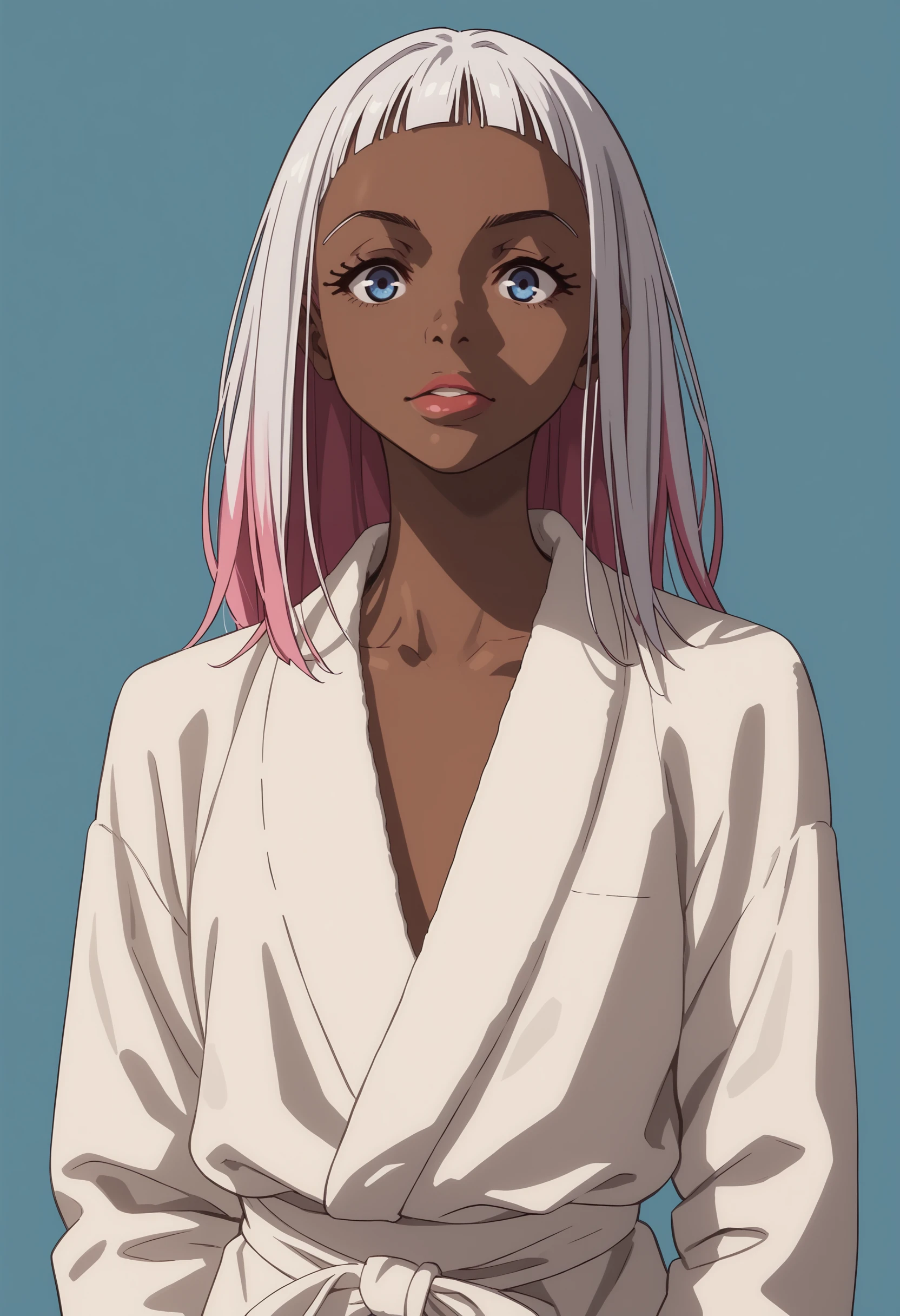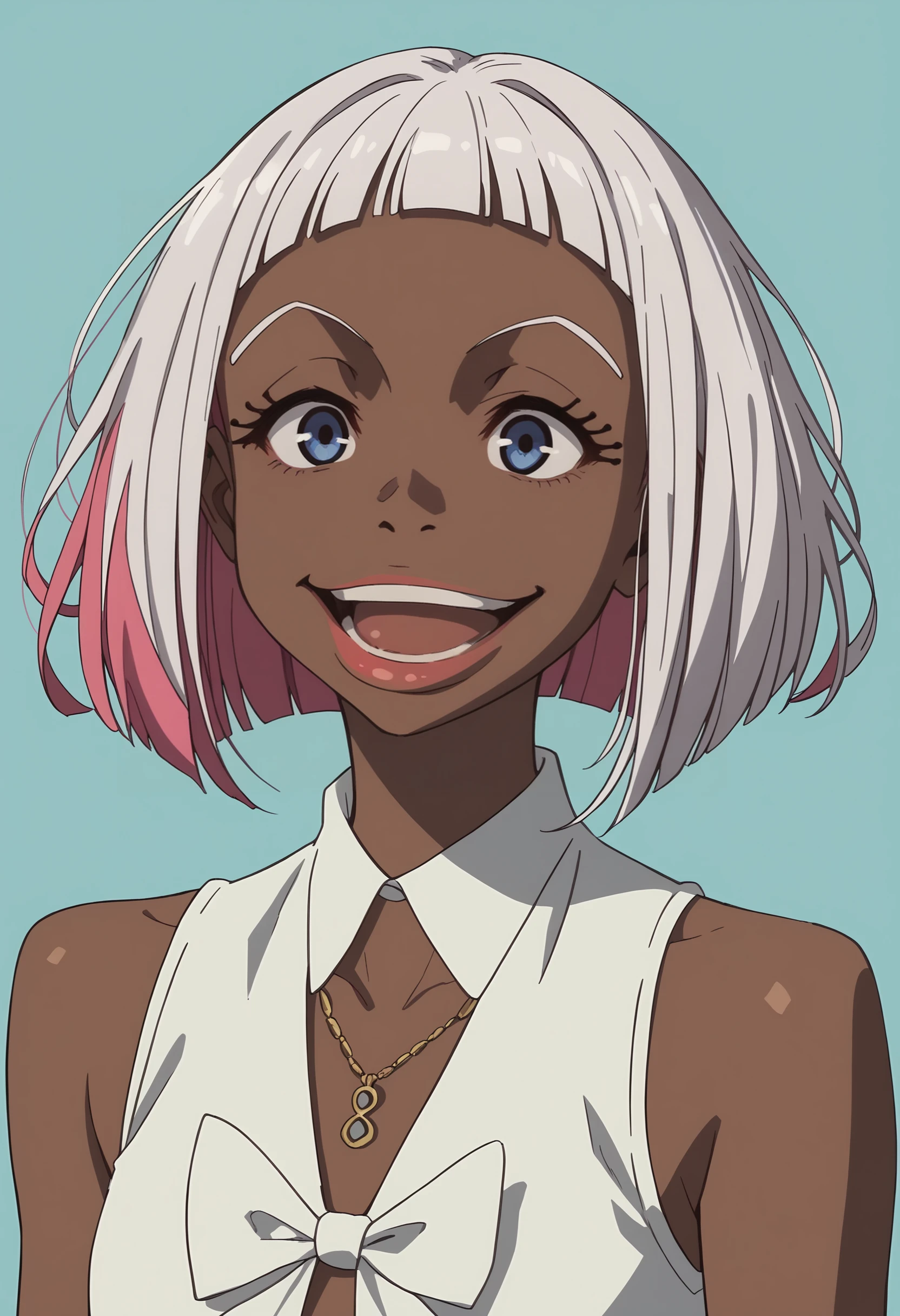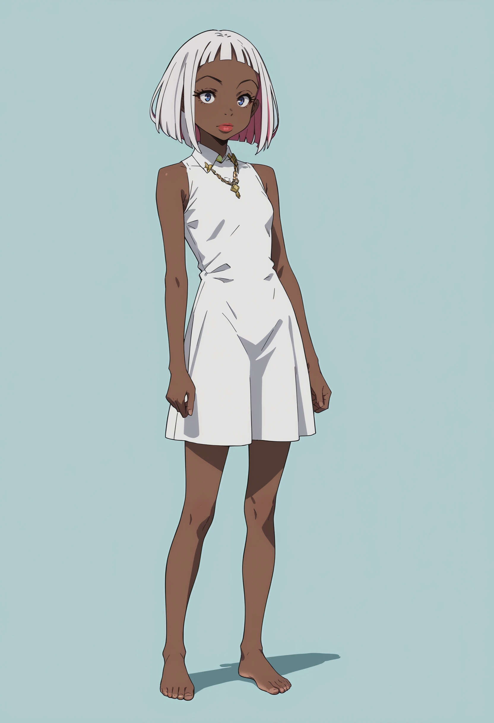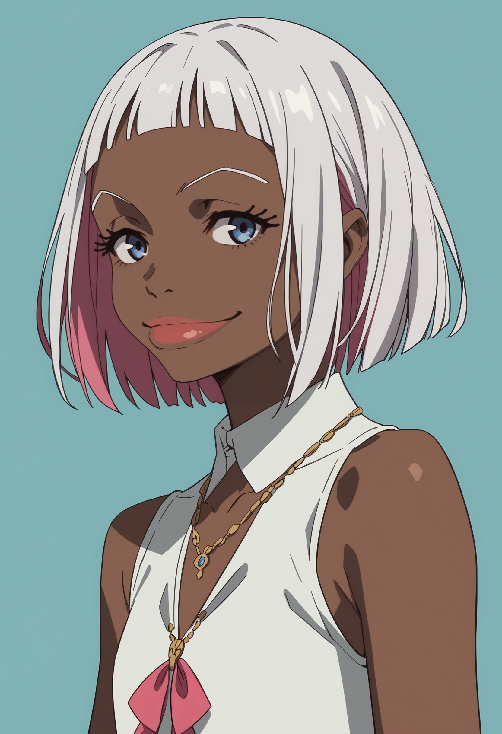 fdorot, 1girl, dark skin, dark-skinned female, short hair, white hair, pink hair, multicolored hair, blue eyes, lips