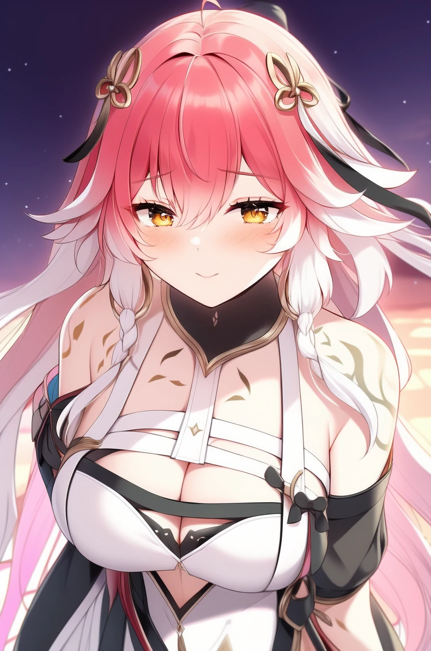,changli_(wuthering_waves) ,long hair,breasts, pink hair,multicolored hair,white hair,hair ornament, bare shoulders, ahoge, cleavage, very long hair,