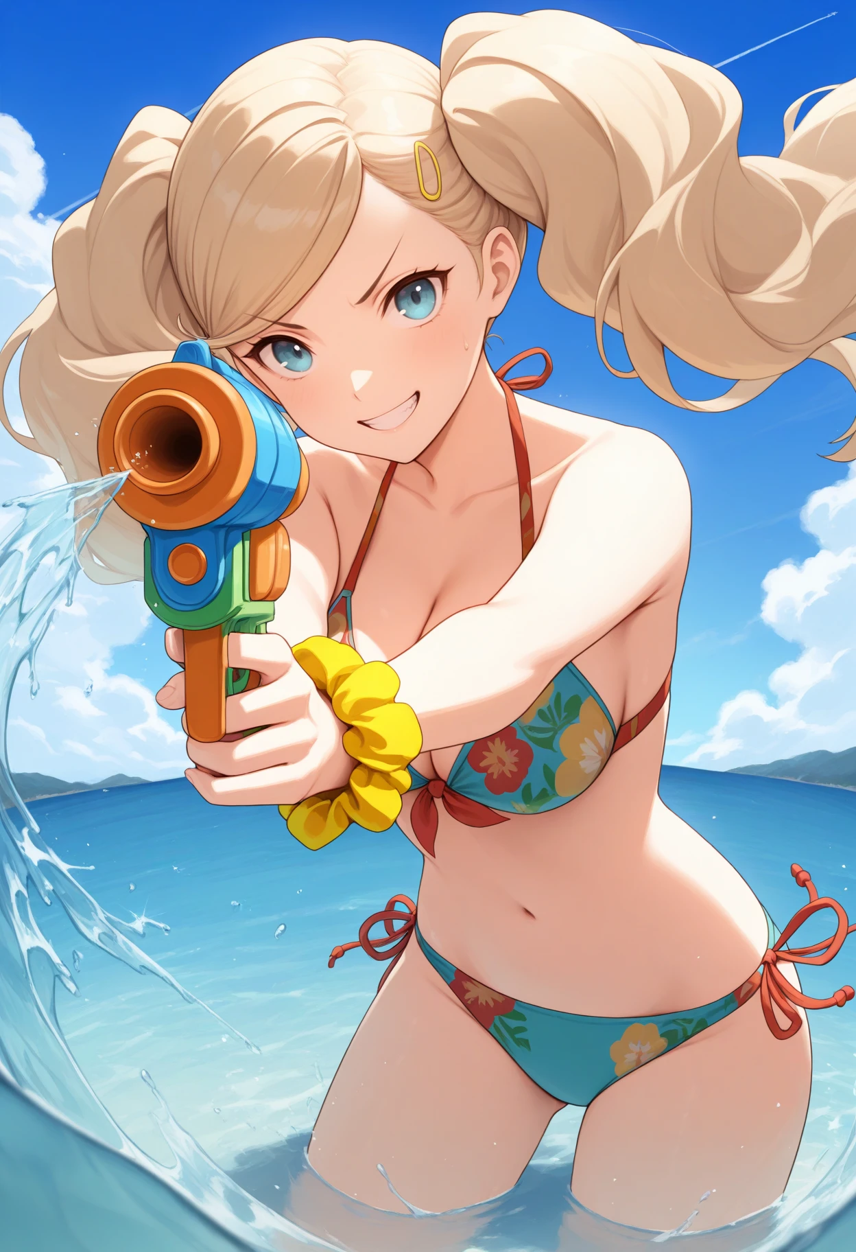 swmAnn, blonde hair, twintails, swept bangs, hairclip, blue eyes, aqua bikini, string bikini, floral print bikini, cleavage, side-tie bikini bottom, wrist scrunchie, yellow scrunchie