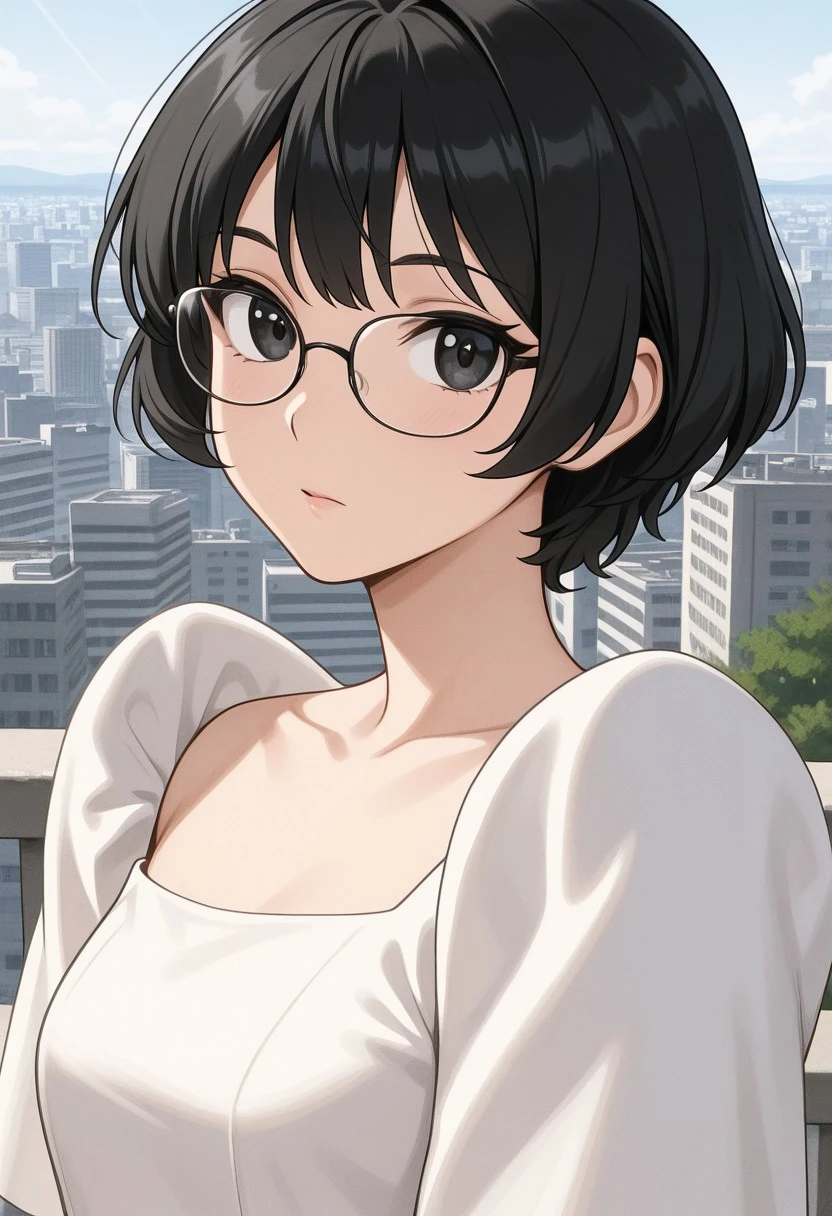 solo, upper body, 1girl, short hair, bangs, glasses, flpnna_trno_dress, beige dress, standing, looking at the viewer, outdoor, best quality, masterpiece, 4k resolutionSuggested Parameters:
