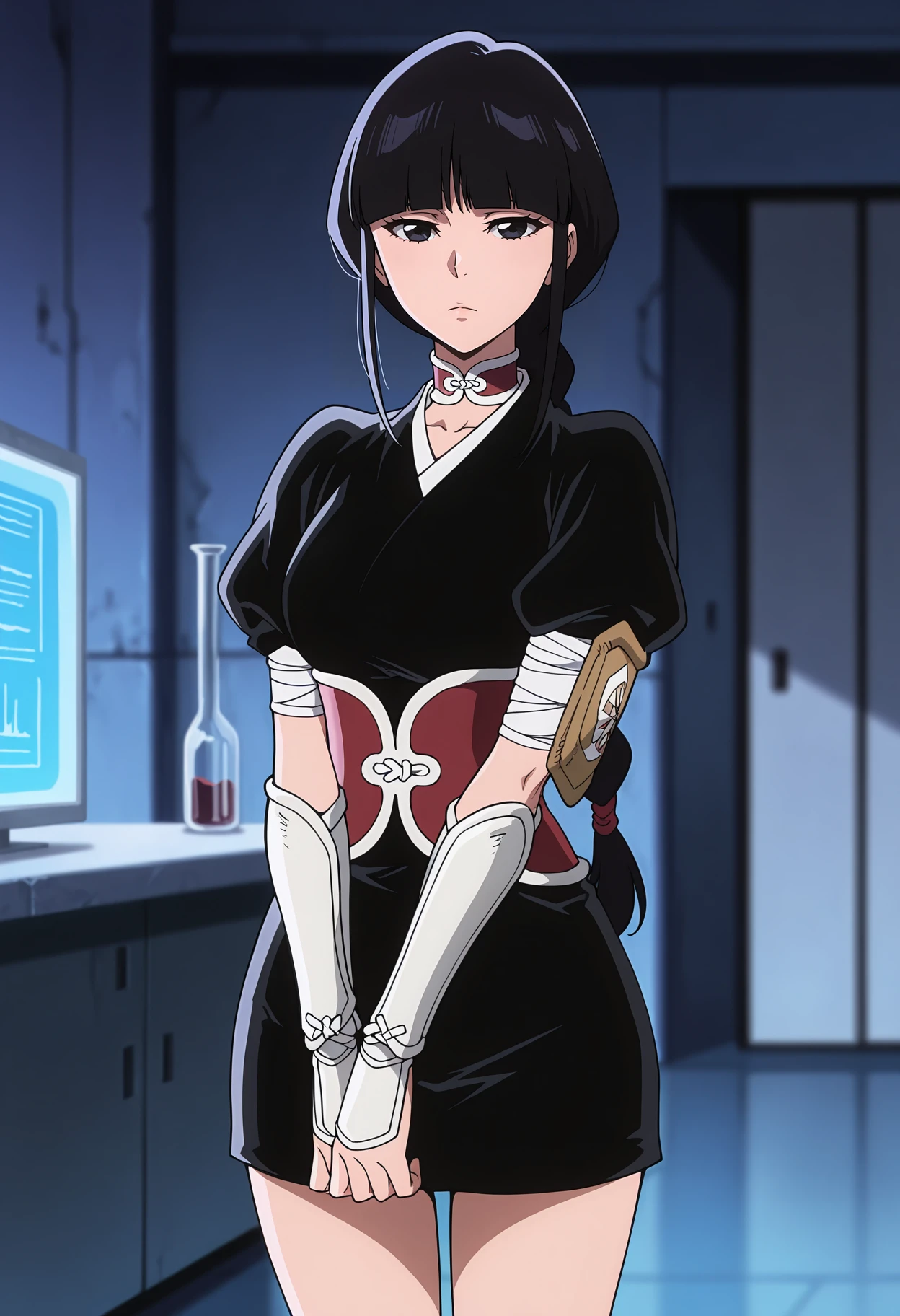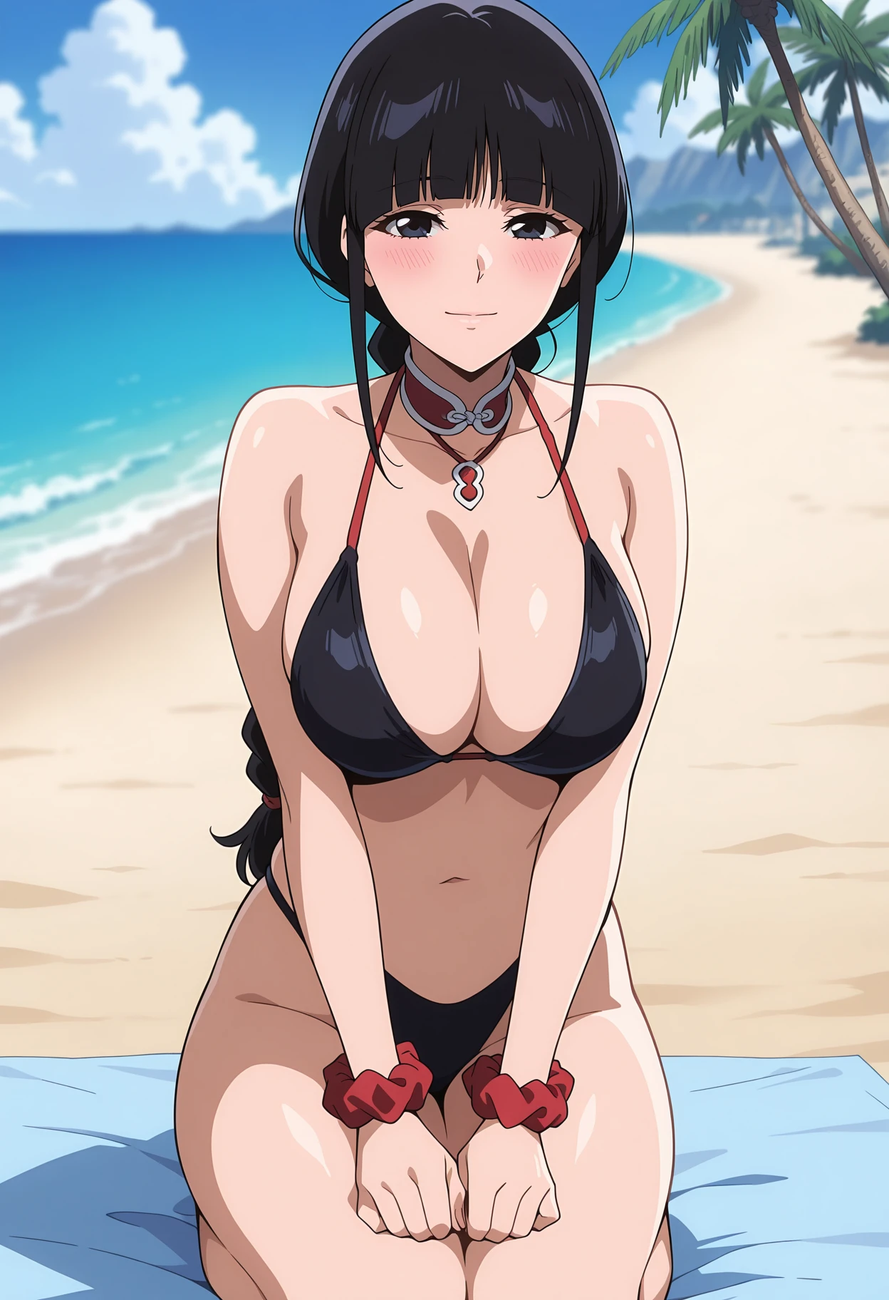 braided ponytail, blunt bangs, long hair, black hair, black eyes, red choker, short kimono, black kimono, puffy sleeves, red corset, bandaged arm, vambraces
