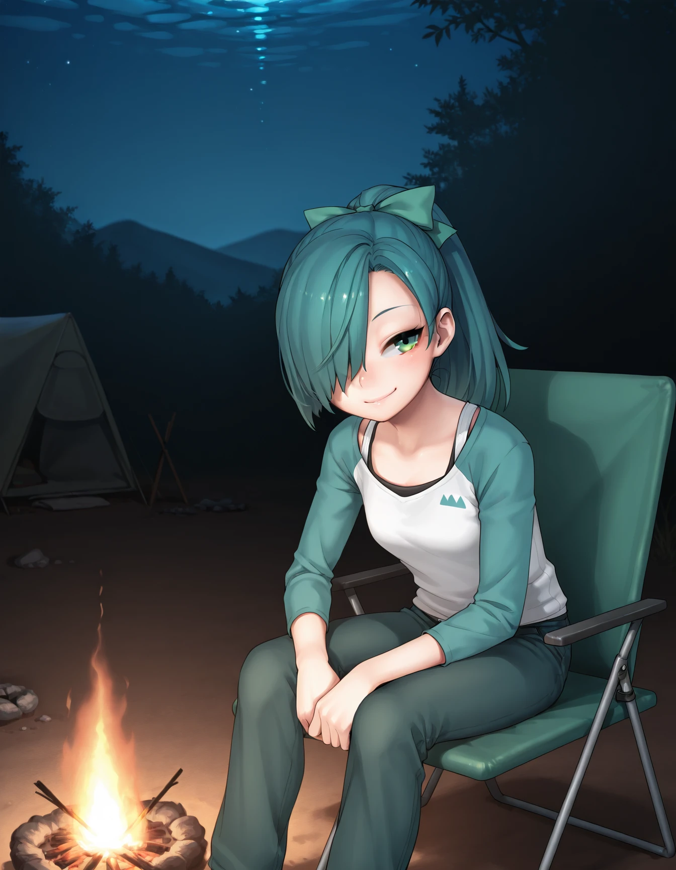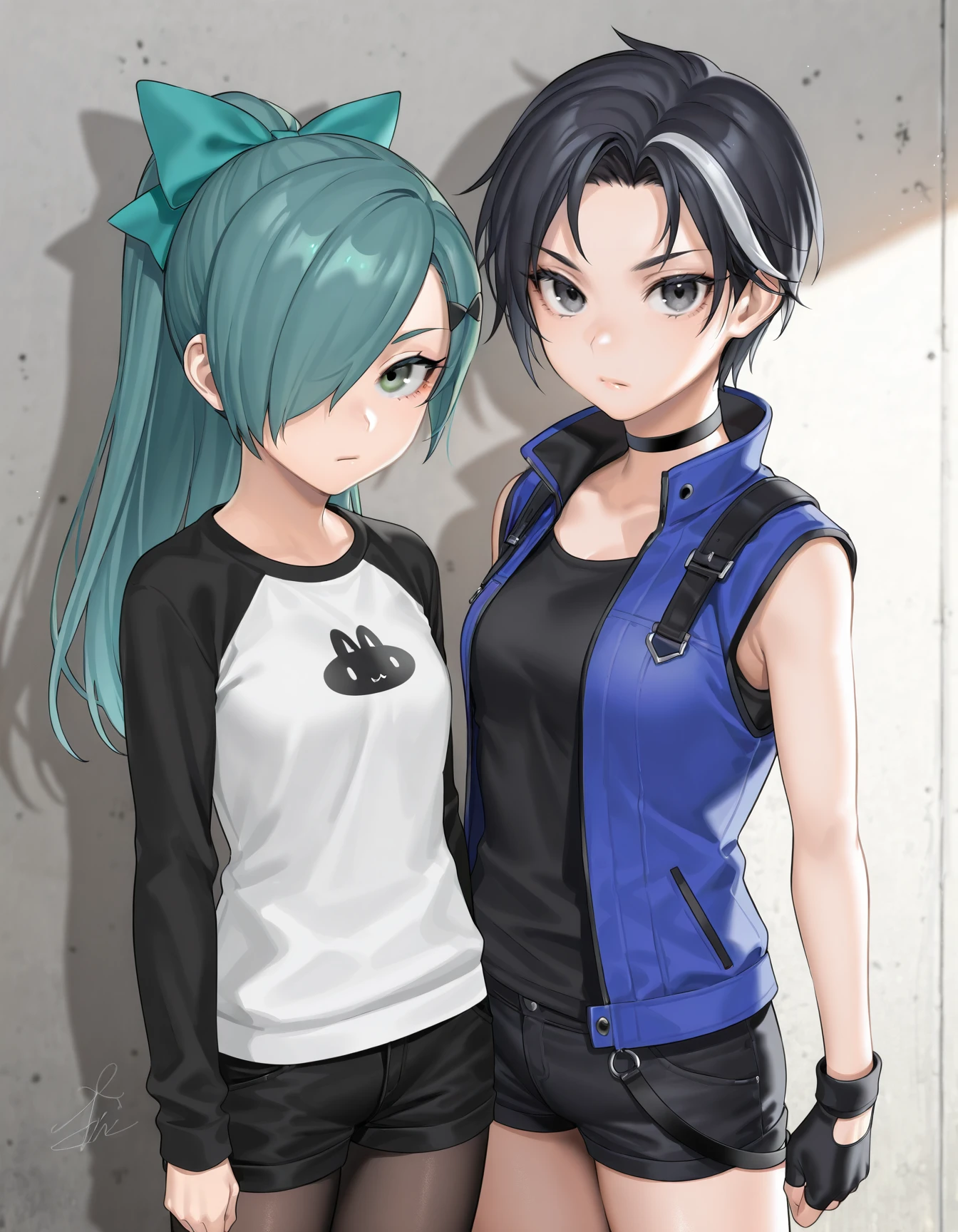 jay, aqua hair, green hair, hair over one eye, green eyes, hair bow, ponytail, raglan sleeves, pantyhose