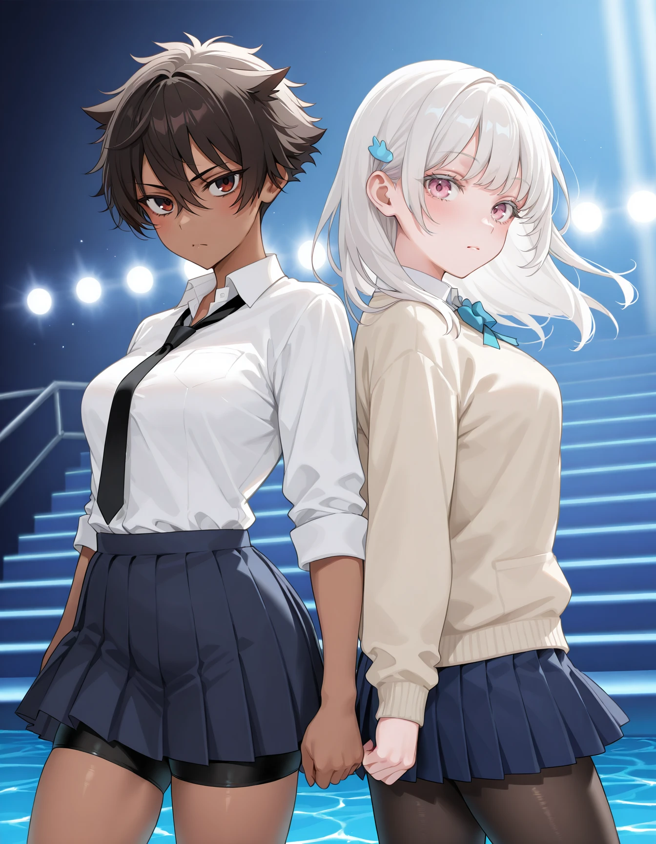 n4cch5n, white hair, collared shirt, sweater, school uniform, blue skirt, pantyhose