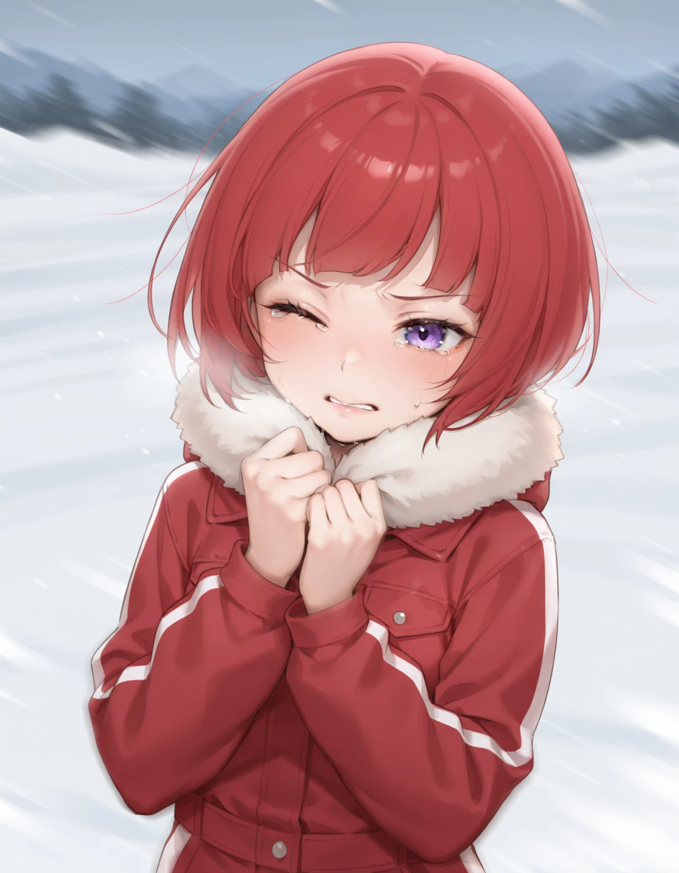 kyuri, red hair, purple eyes, bangs, bob cut, bare shoulders, bare arms, black choker, black gloves, black dress, red vest, brown pantyhose, epaulettes, eyeshadow