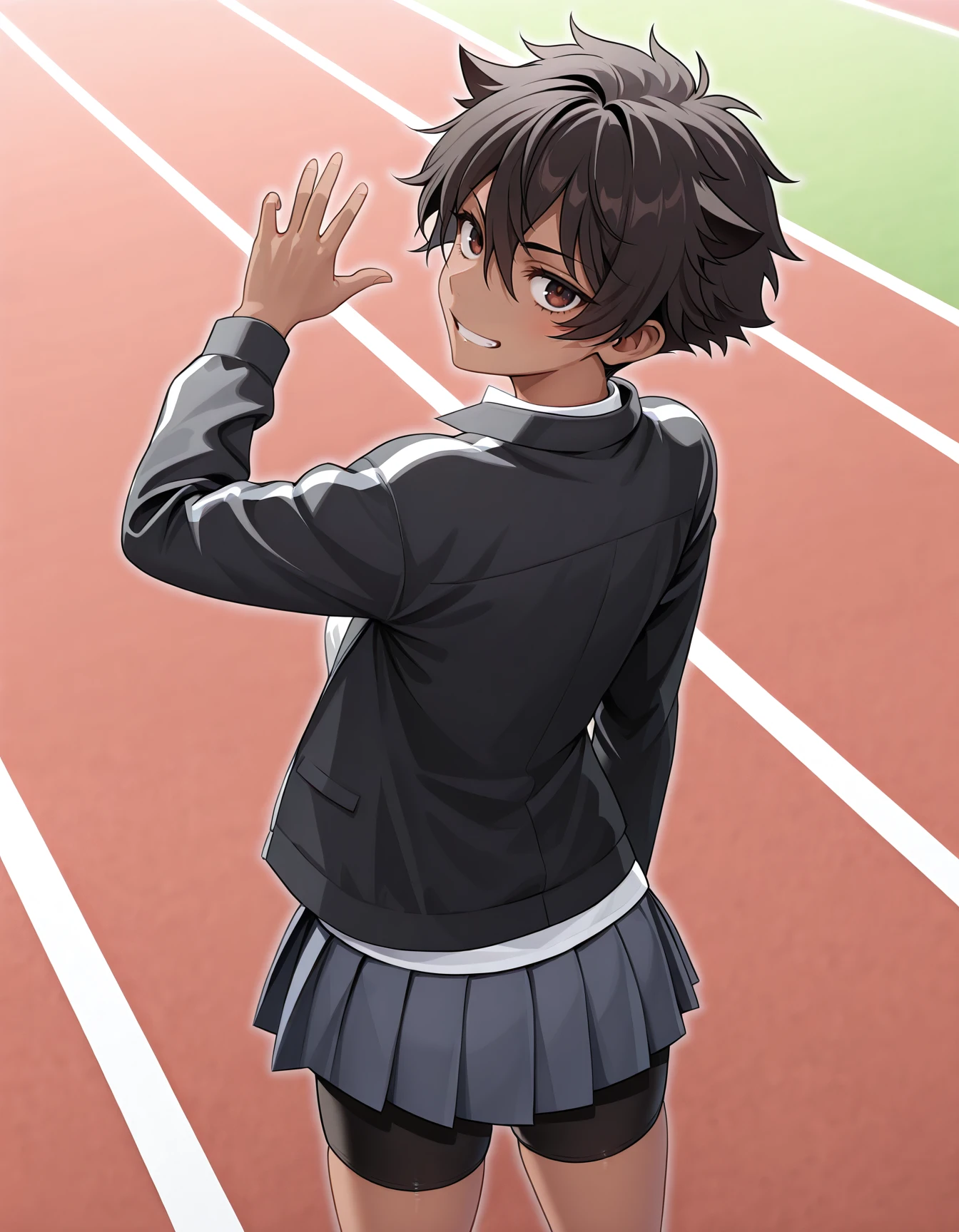 micchan, dark-skinned female, white shirt, collared shirt, black jacket, open jacket, pleated skirt, shorts under skirt, bike shorts