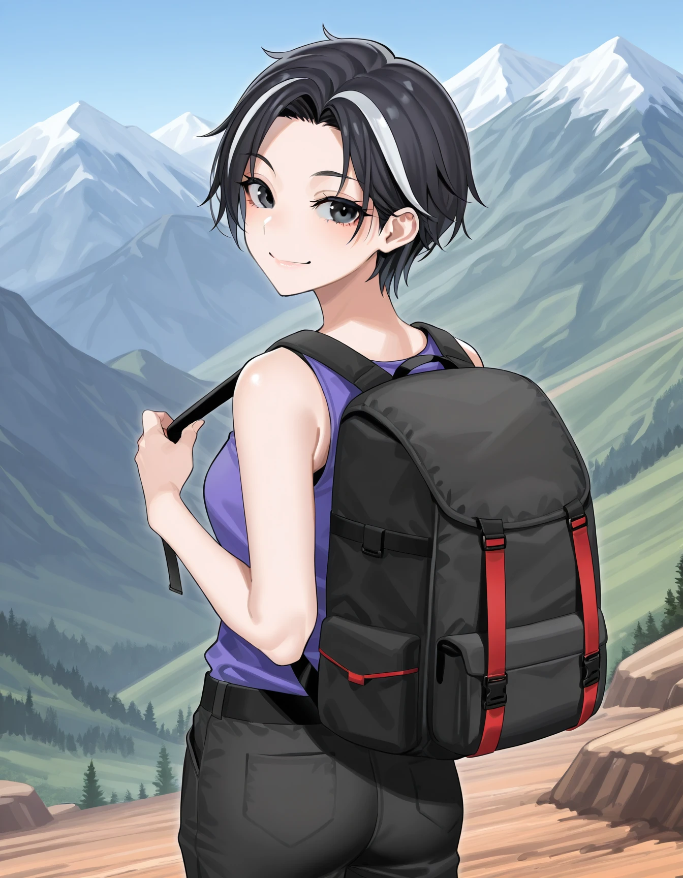 keishi, black eyes, black hair, streaked hair, short hair, black choker, blue jacket, sleeveless jacket, black shirt, fingerless gloves, short shorts