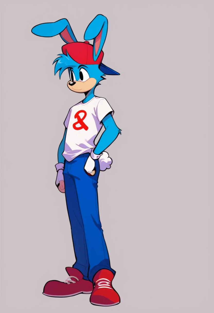 Encore_BoyfriendFNF, shirt, gloves, 1boy, hat, animal ears, blue hair, white shirt, short sleeves, shoes, pants, white gloves, black eyes, spiked hair, red footwear, red headwear, furry, red footwear, blue pants, furry male, body fur, animal nose, flat color, two-tone fur, blue fur, vibrant cartoonish style, red cap, a shirt with a red prohibition symbol, red shoes, bunny, long droopy rabbit ears, fingerless gloves, black nose, white bunny tail, mobian