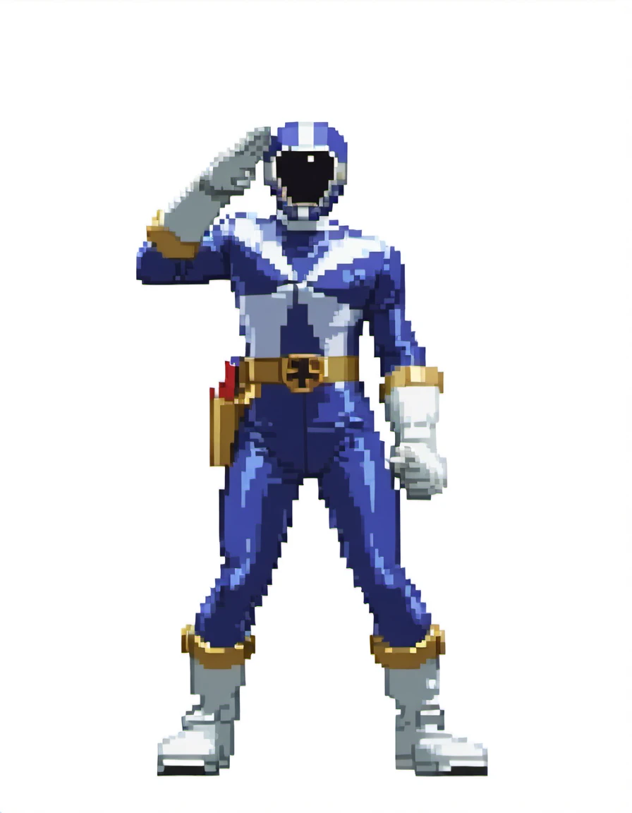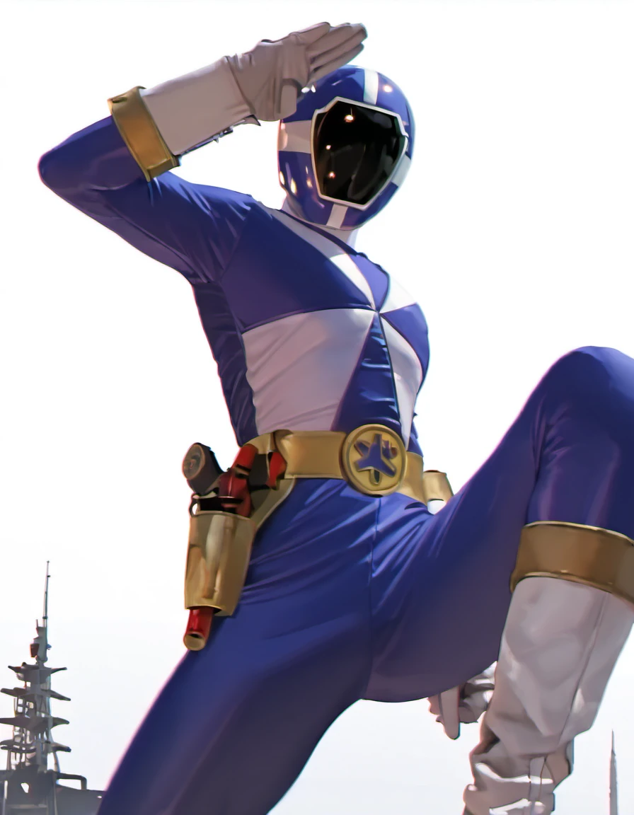 Blue ranger: goblue, robot, solo, goblue helmet, goblue bodysuit, gold belt, holster, white gloves, white boots