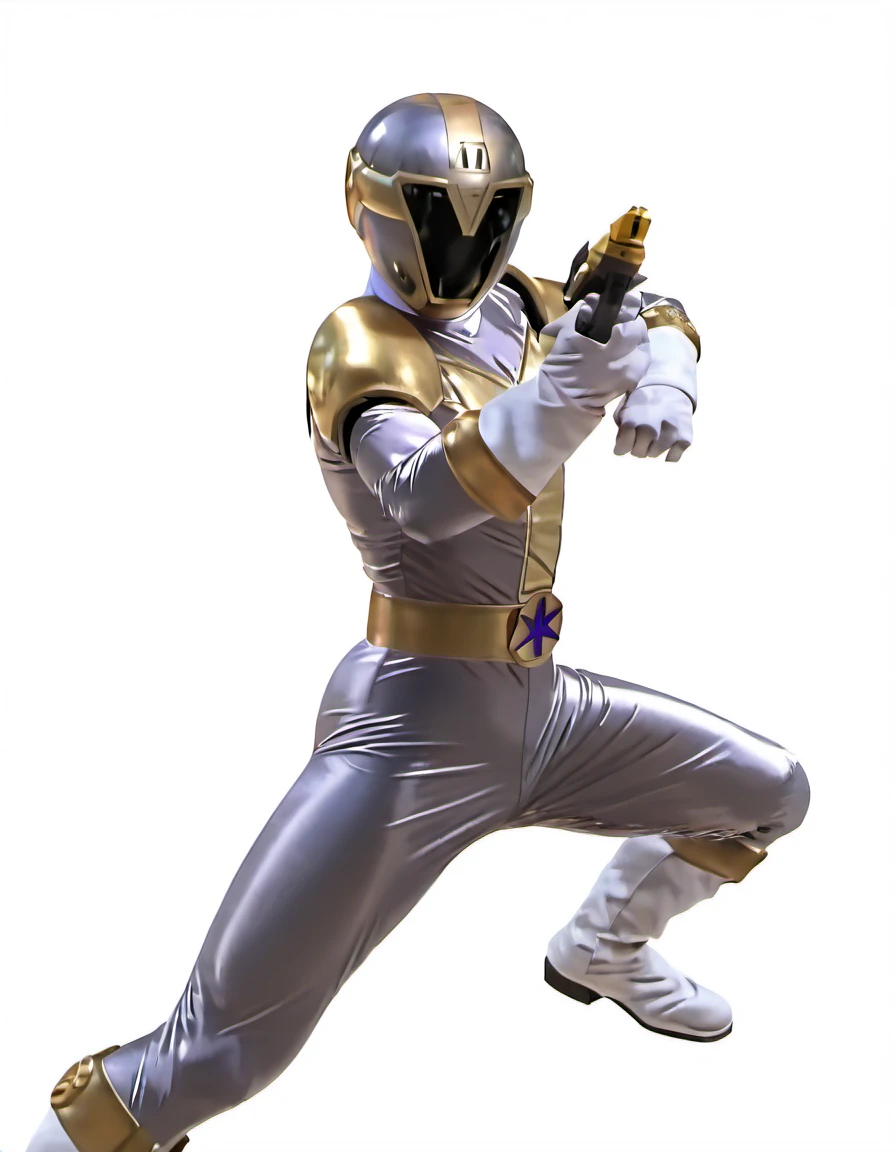 Titanium ranger: titaniumr, robot, solo, titaniumr helmet, titaniumr bodysuit, gold shoulder pads, gold belt, holster, white gloves, white boots