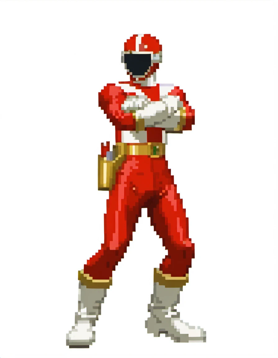 Red ranger: gored, robot, solo, gored helmet, gored bodysuit, gold belt, holster, white gloves, white boots