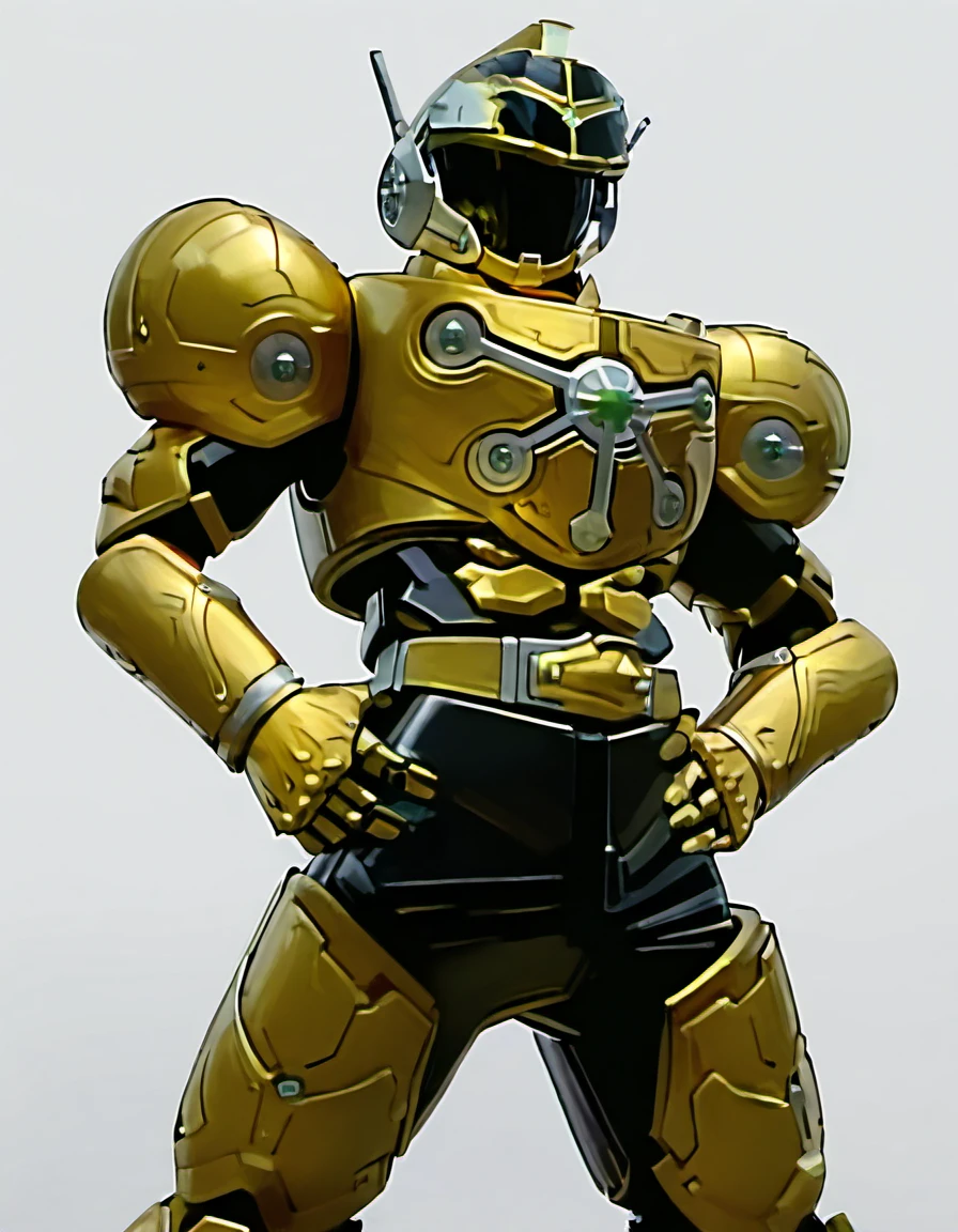 Yellow ranger: goyellow, robot, solo, goyellow helmet, goyellow bodysuit, breasts, gold belt, holster, white gloves, white boots