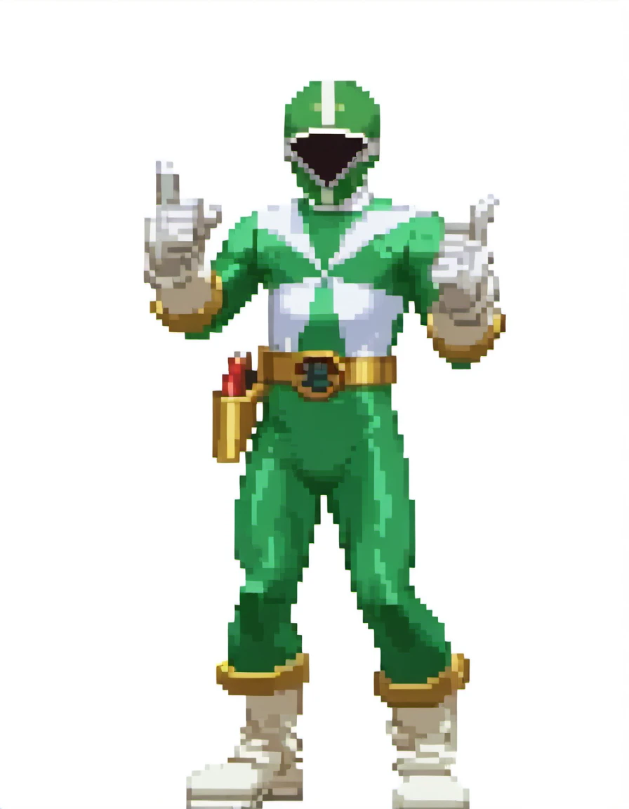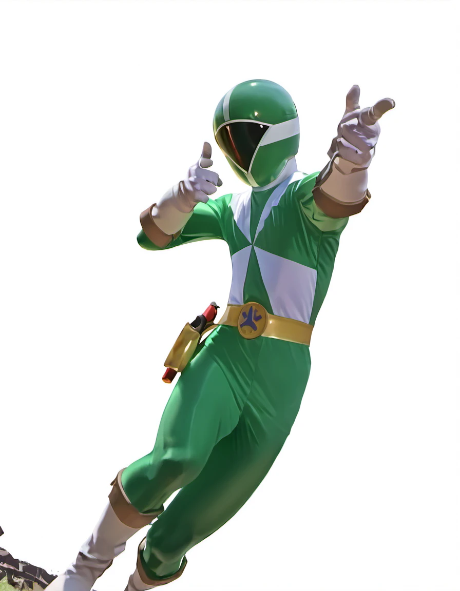 Green ranger: gogreen, robot, solo, gogreen helmet, gogreen bodysuit, gold belt, holster, white gloves, white boots
