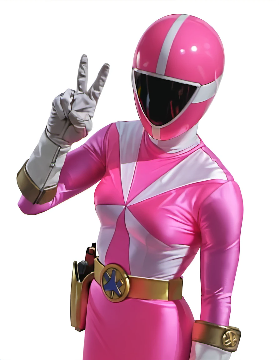 Pink ranger: gopink, robot, solo, gopink helmet, gopink bodysuit, breasts, pink skirt, gold belt, holster, white gloves, white boots
