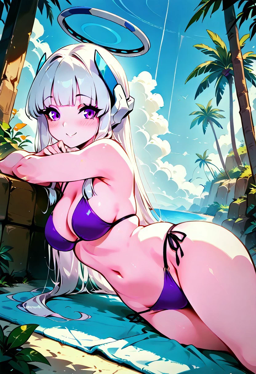 zzNoa, long hair, halo, mechanical halo, purple eyes, white hair, very long hair, blunt bangs,